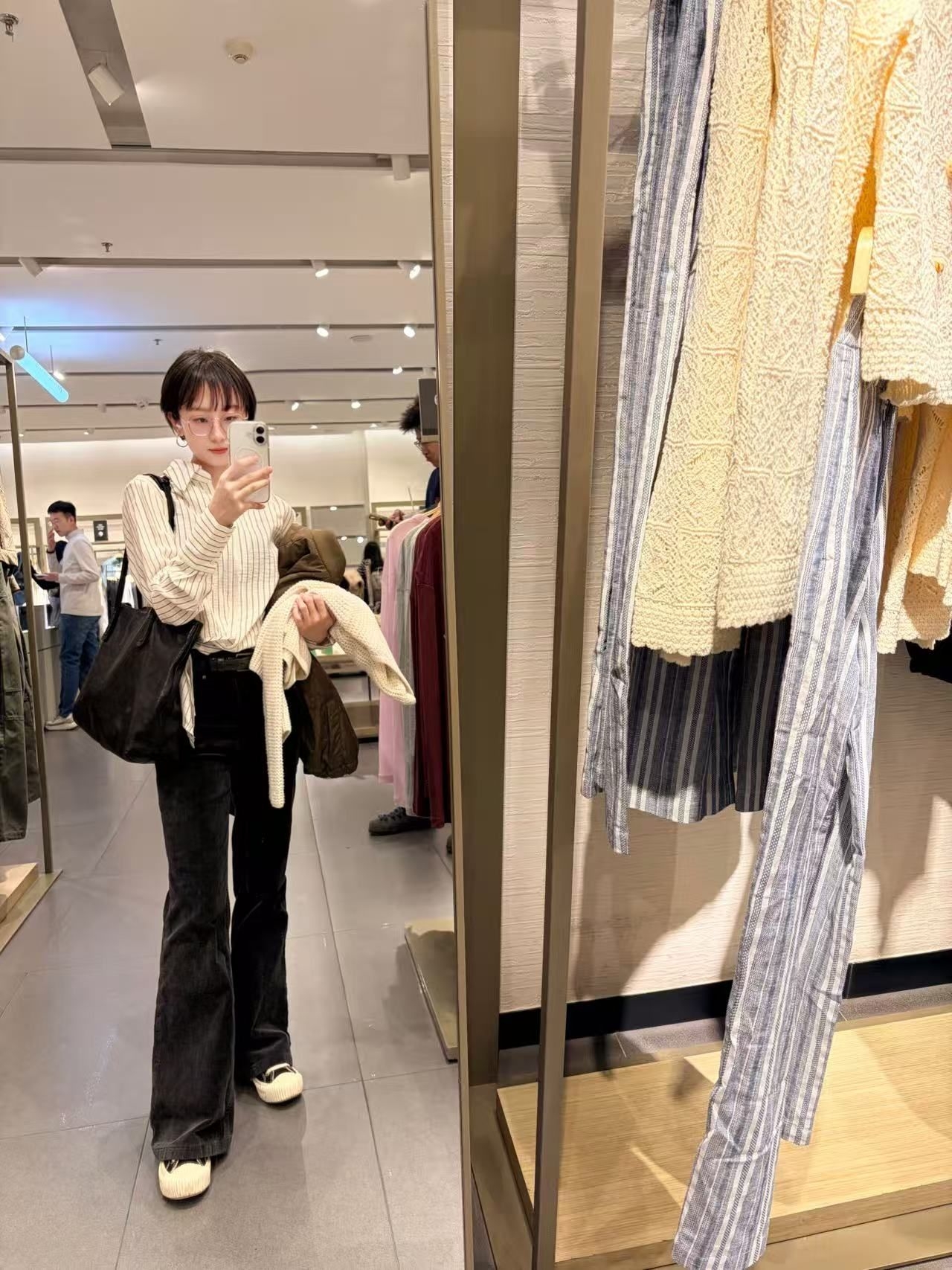 逛店随手拍的一套,真的爱惨这种简约又有质感的搭配! 上衣:条纹衬衫自带春日清爽感,版型宽松不压个子,塞衣角瞬间拉高腰线 下装:黑灰微喇裤是本命!修饰腿型还显腿长,小个子穿也能有大长腿既视感 配饰:黑色帆布包+小白鞋,中和了衬衫的正式感,日常出街超随性 不用复杂叠穿,基础款搭出高级感,这才是小个子的穿搭精髓呀~