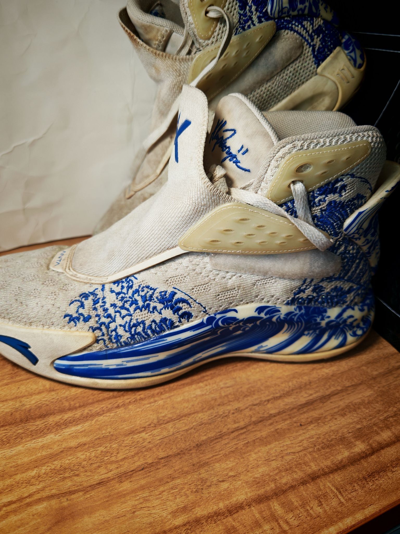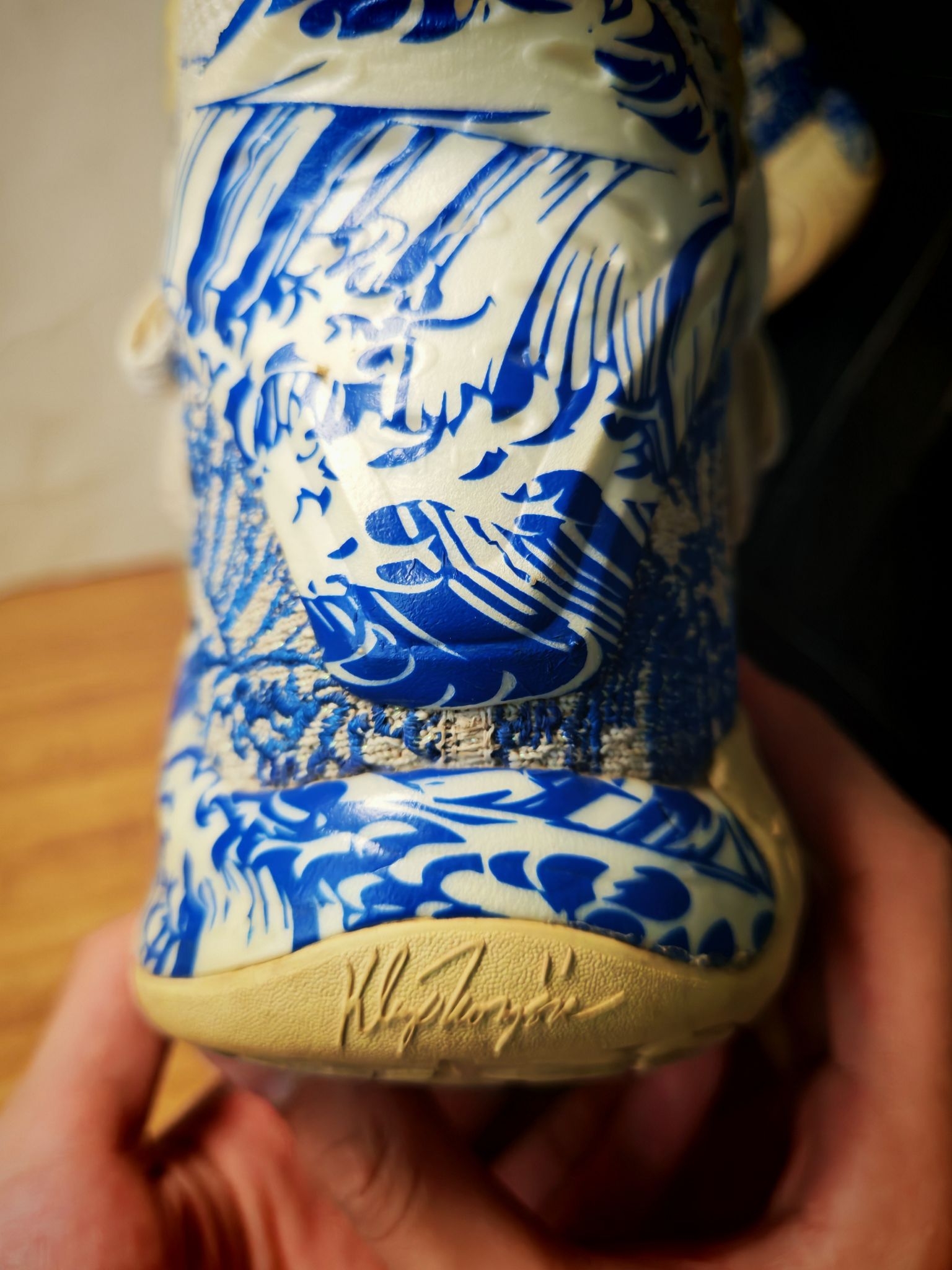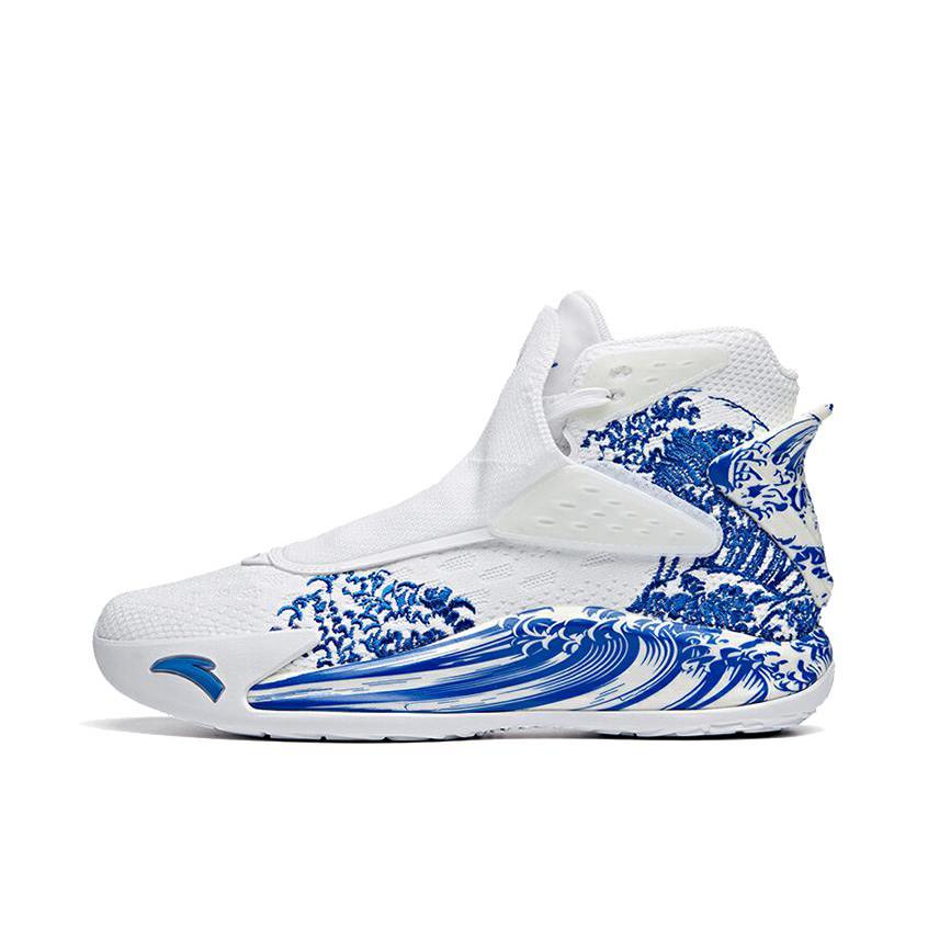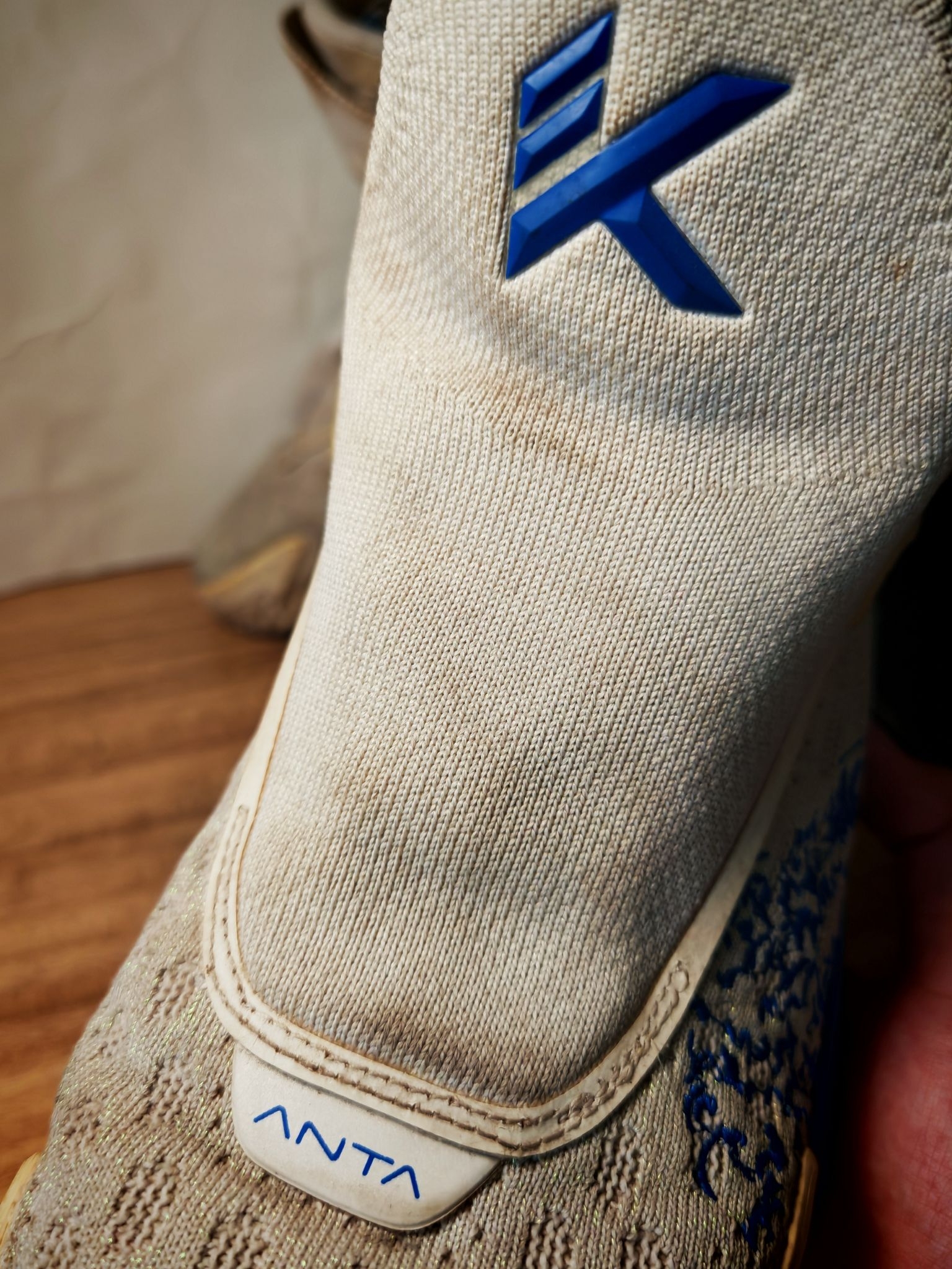 当时还在上初中的我,犹豫了很久之后,还是入手了这一双浪花配色的kt 5 Pro,比普通版本多了碳板。中底布下面还有一层抗扭,也就是说明这个鞋子是双层抗扭的,再加上整个鞋的蓝白色调,大面积的刺绣,还有这种带鞋盖的双层鞋面,在当时深受同学们的喜爱,真的可以看到校园里有非常多的同学上脚。