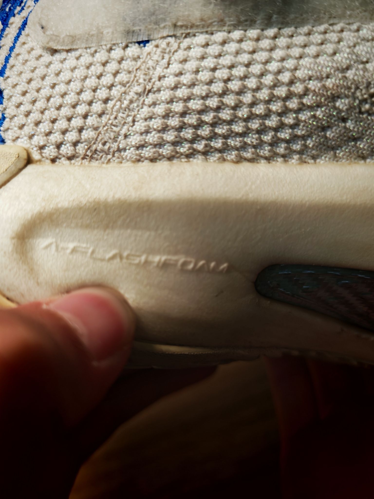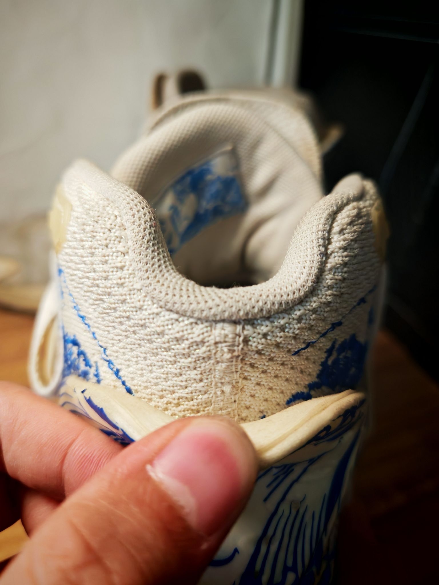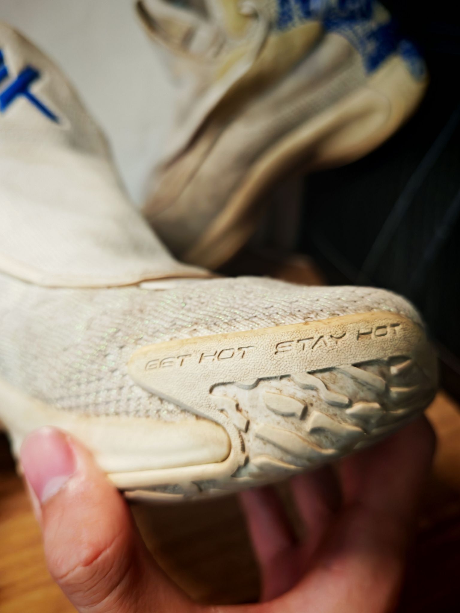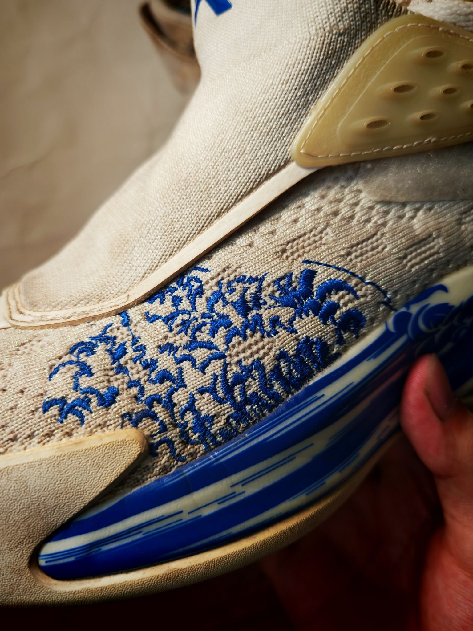 当时还在上初中的我,犹豫了很久之后,还是入手了这一双浪花配色的kt 5 Pro,比普通版本多了碳板。中底布下面还有一层抗扭,也就是说明这个鞋子是双层抗扭的,再加上整个鞋的蓝白色调,大面积的刺绣,还有这种带鞋盖的双层鞋面,在当时深受同学们的喜爱,真的可以看到校园里有非常多的同学上脚。