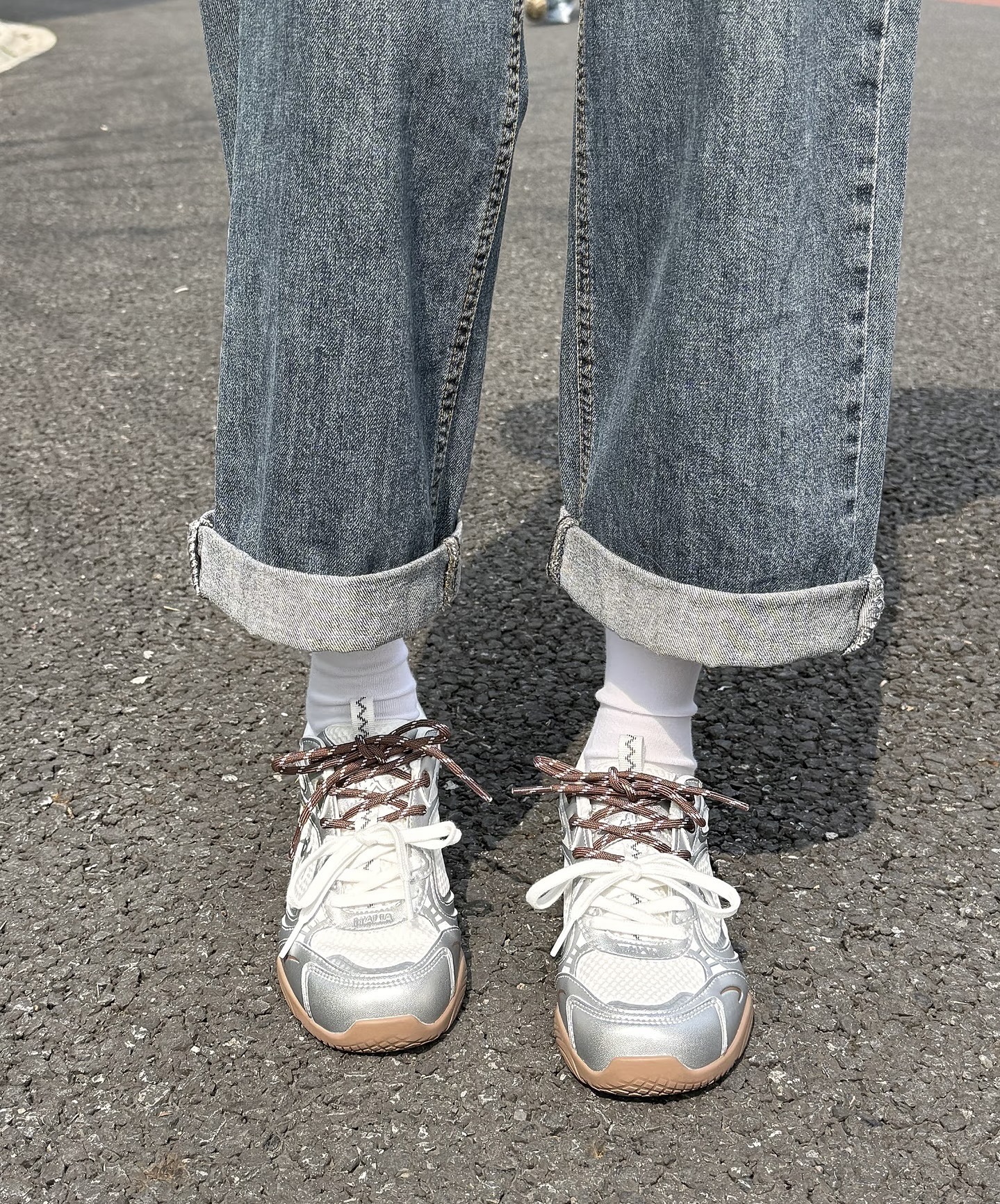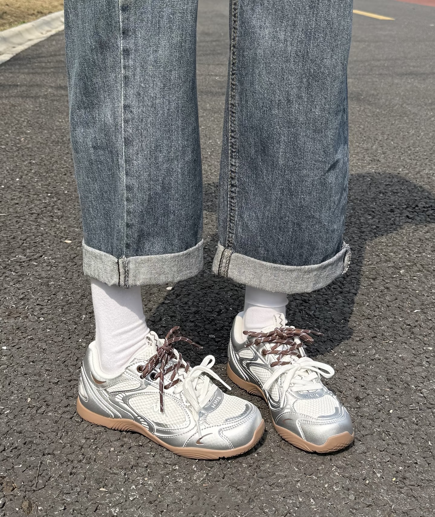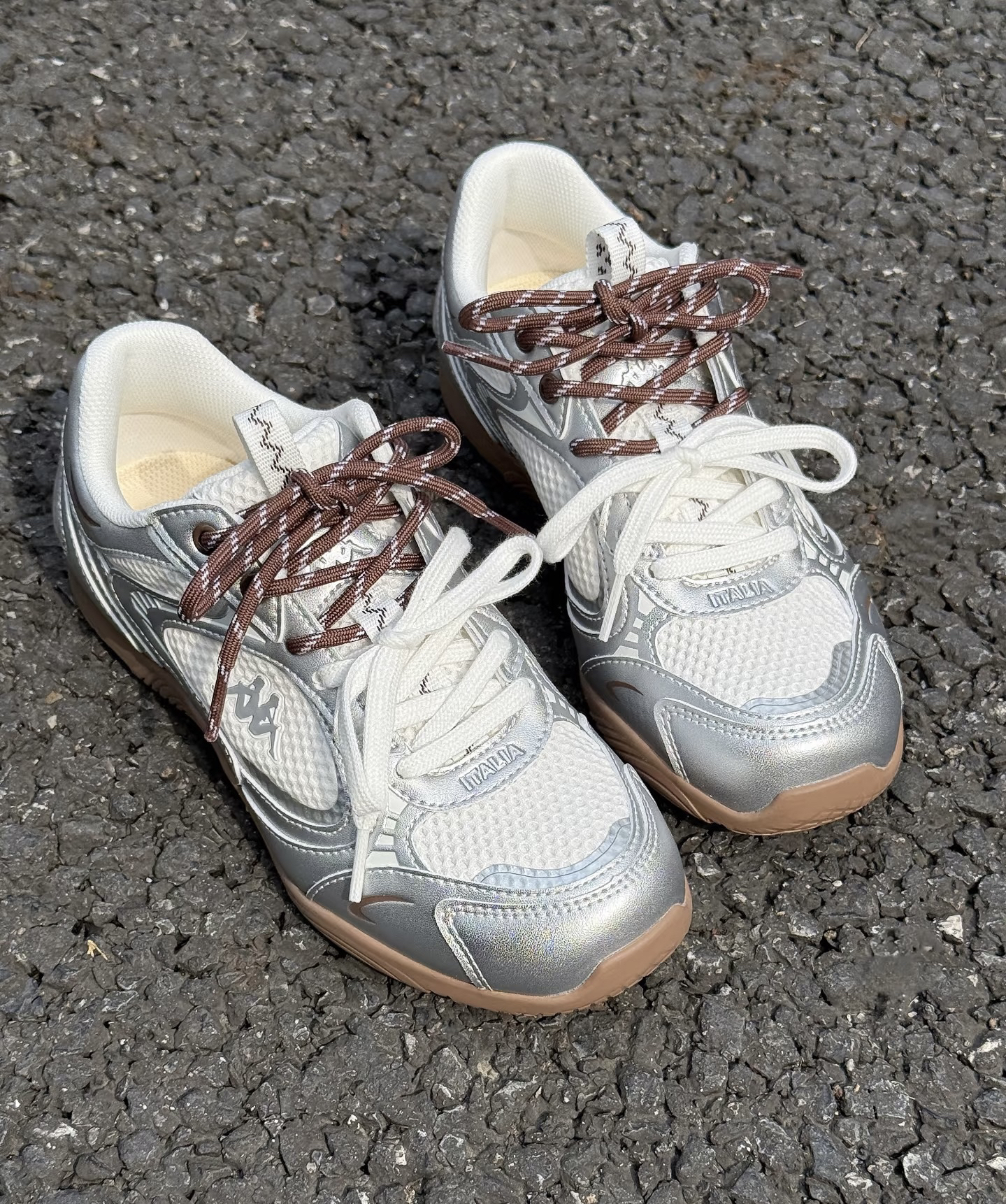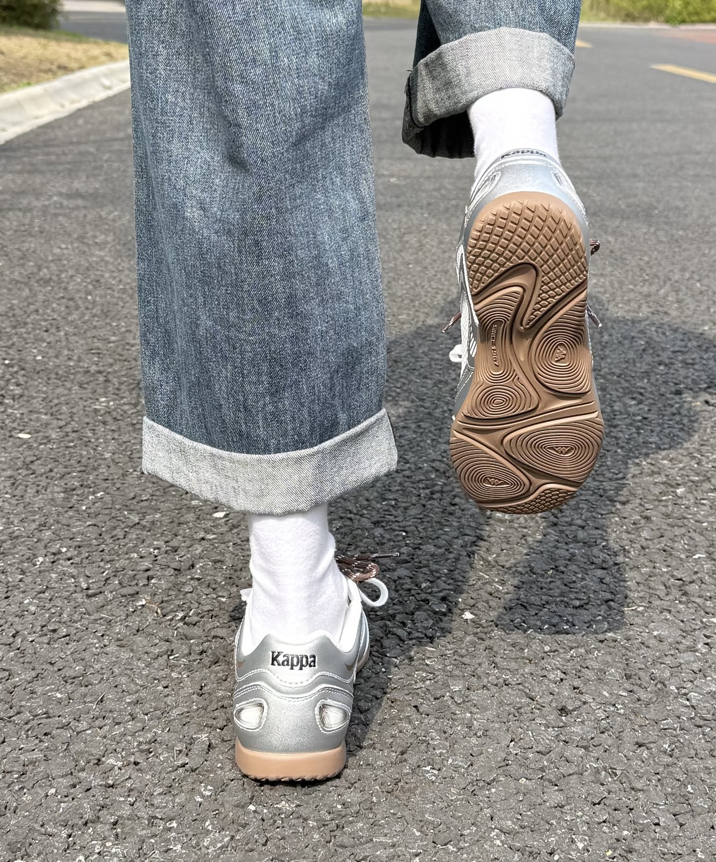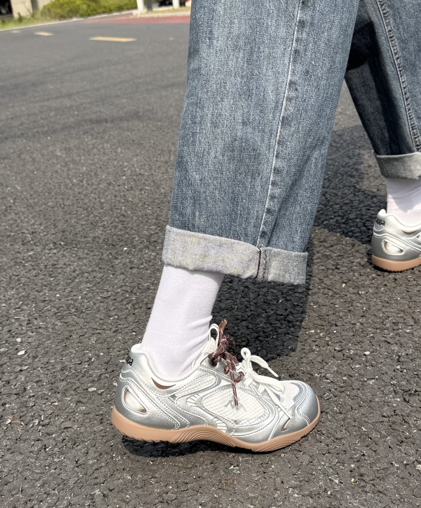 谁懂啊!本来冲着百搭去买的,结果上脚效果直接超出预期! 这双Kappa银色复古跑鞋真的是早八人的神👟 银面拼接+生胶底,这种复古运动感拉满,放在鞋柜里都闪闪发光。 搭配我这条高腰直筒牛仔裤,裤脚卷个边,视觉上腿直接拉长5cm! 而且它不是那种笨重的老爹鞋,底很薄很舒服,日常走路、健身遛狗都完全无压力。 白色袜子一配,韩系/日系风格瞬间拿捏住了🩰 重点是价格亲民,几百块就能拿下这种调性,学生党和打...