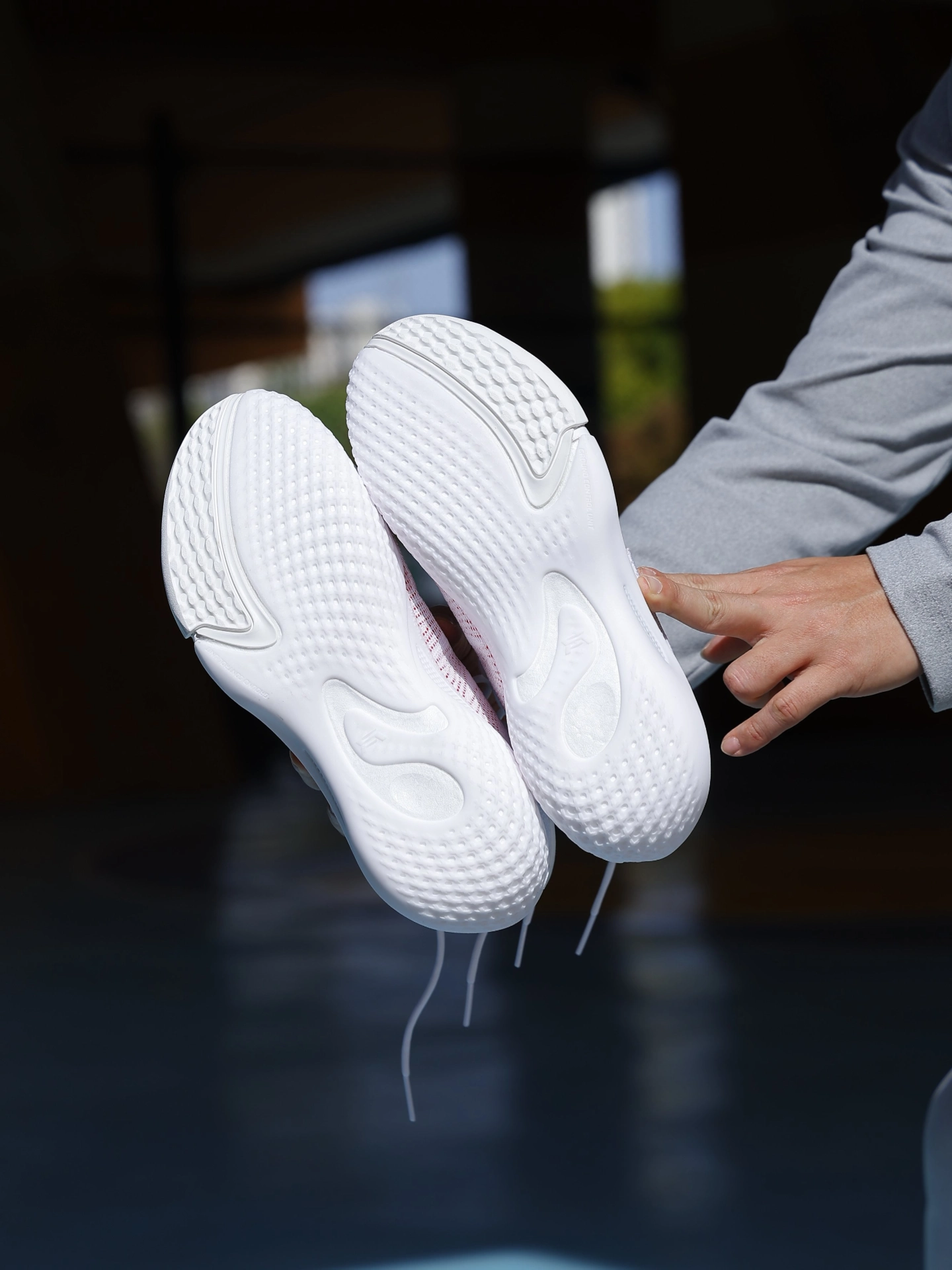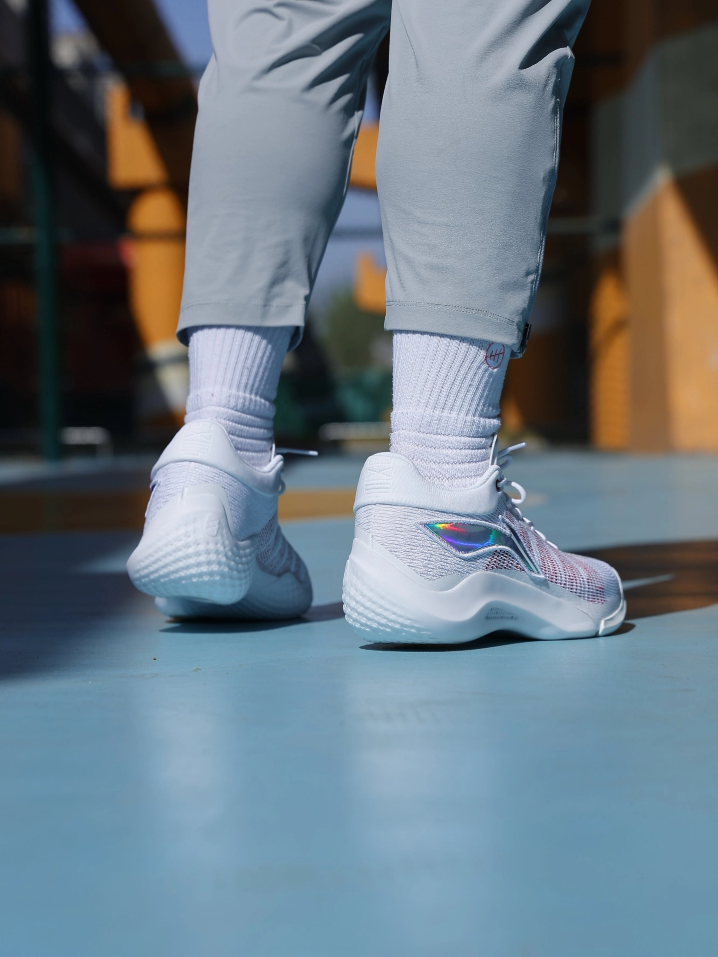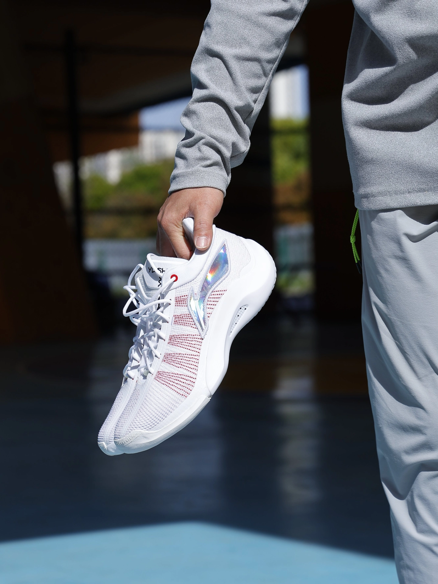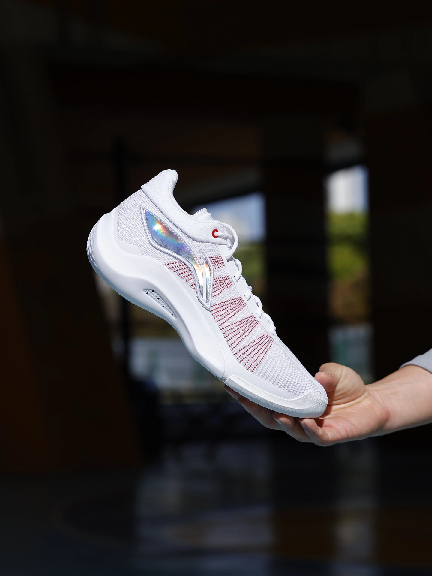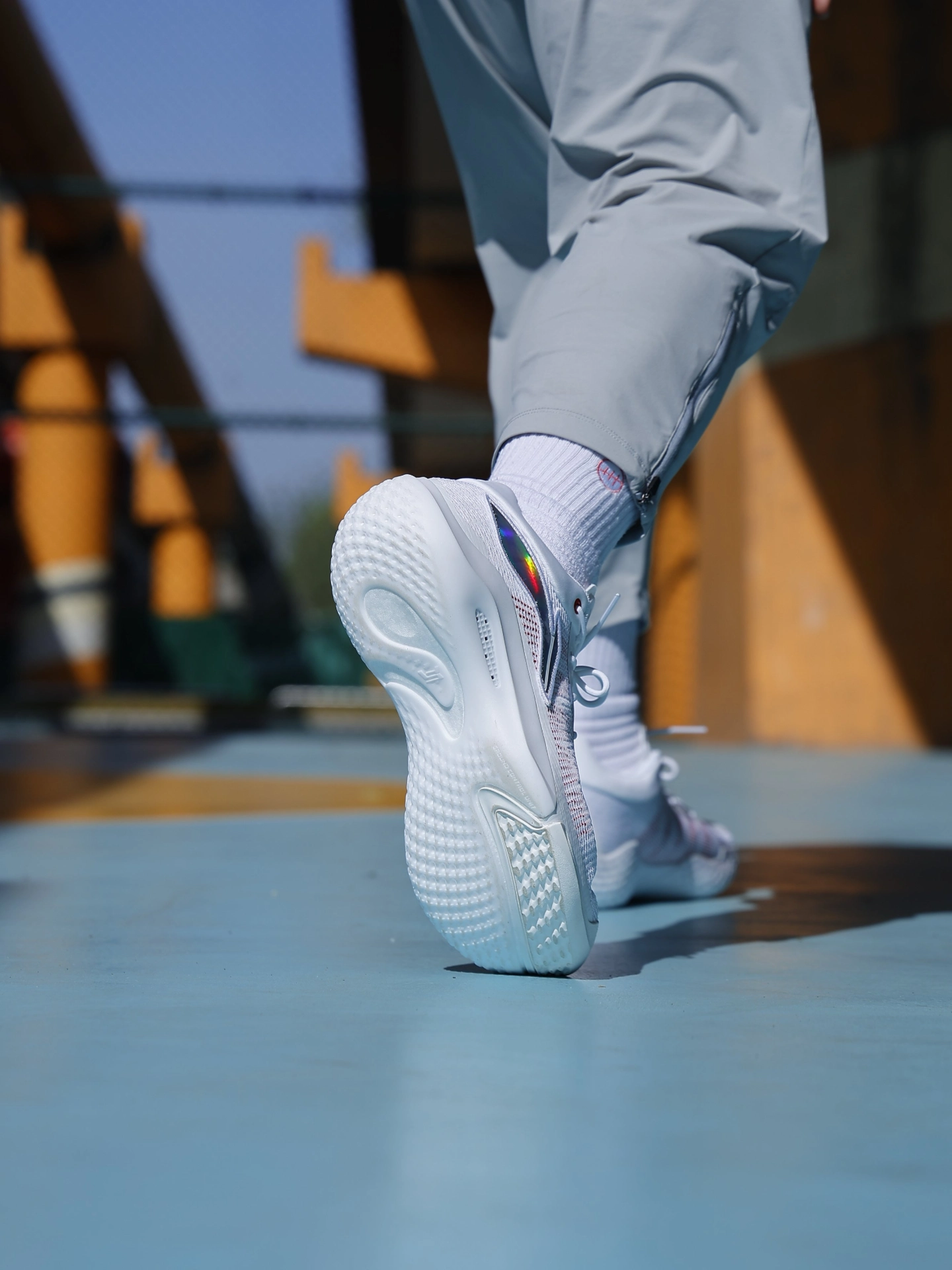 当驭帅13䨻的传奇基因注入驭帅20的先锋轮廓,一场跨越时空的实战美学革命就此诞生。这双“造极13䨻”配色,以纯白为画布,将七年前初代13䨻首曝配色的经典记忆,化作足尖流转的幻彩诗篇。 鞋侧虹彩TPU如液态金属般流动,在阳光下折射出千变万化的光谱,仿佛将赛场焦点凝结于足尖;透气网面与红纹交织,轻盈如羽却暗藏力量,每一步蹬地都释放澎湃回弹。 造极13䨻