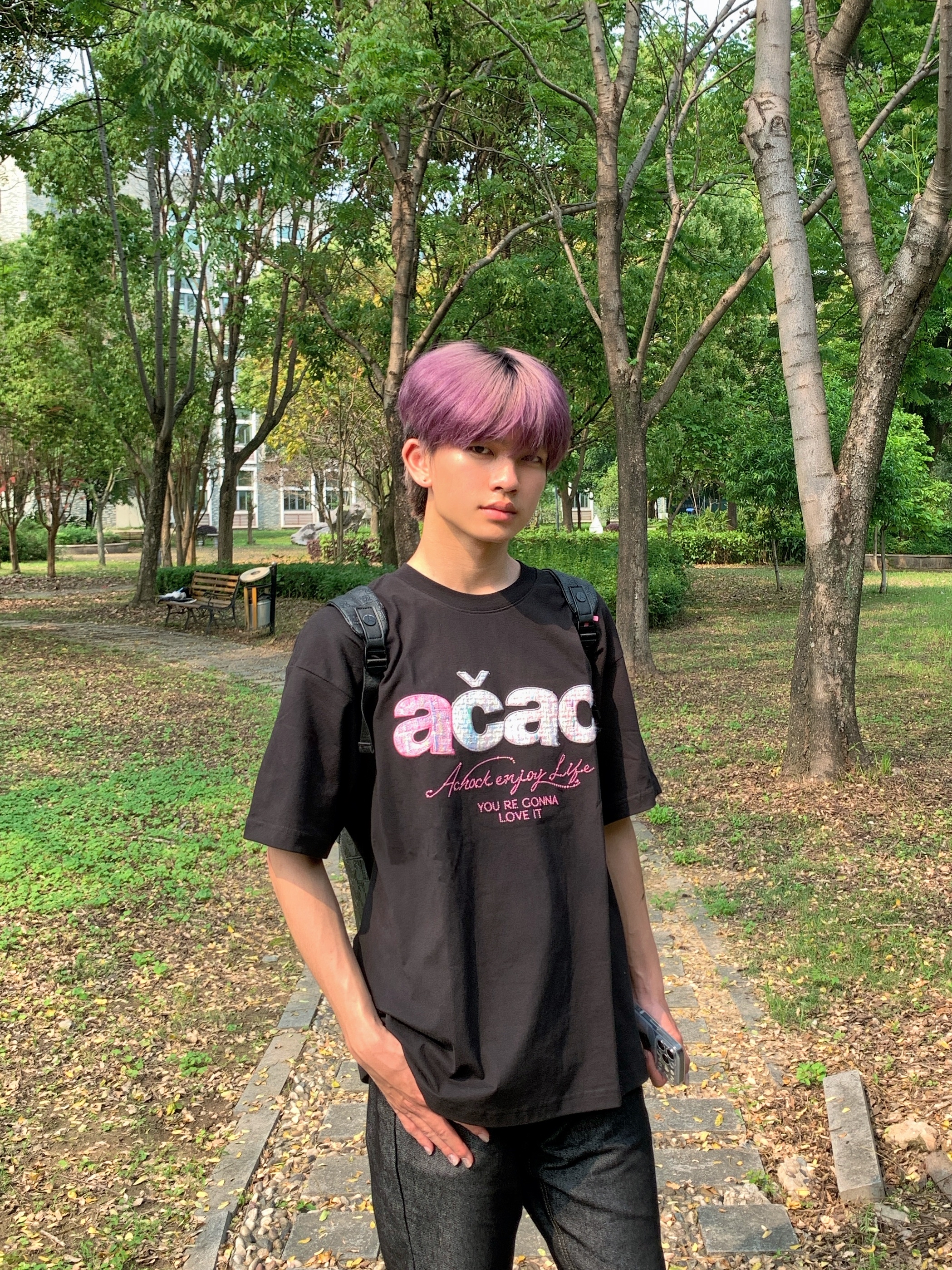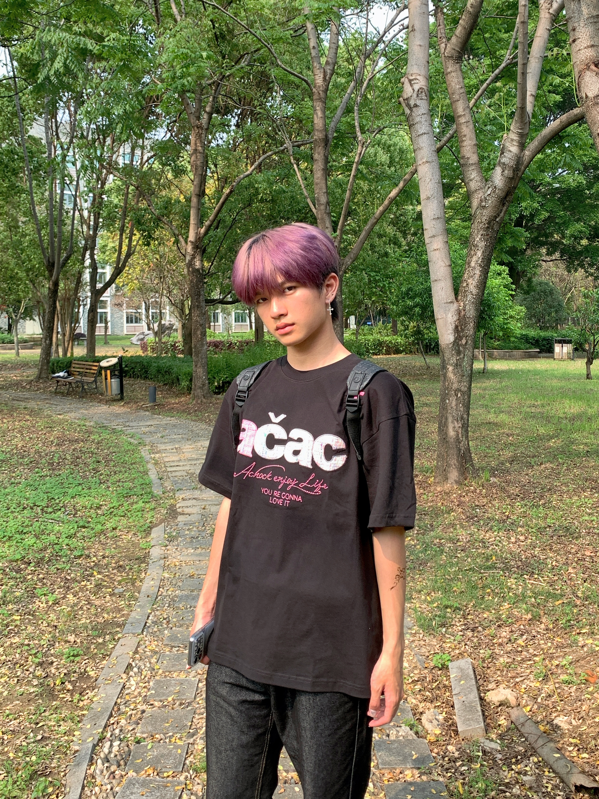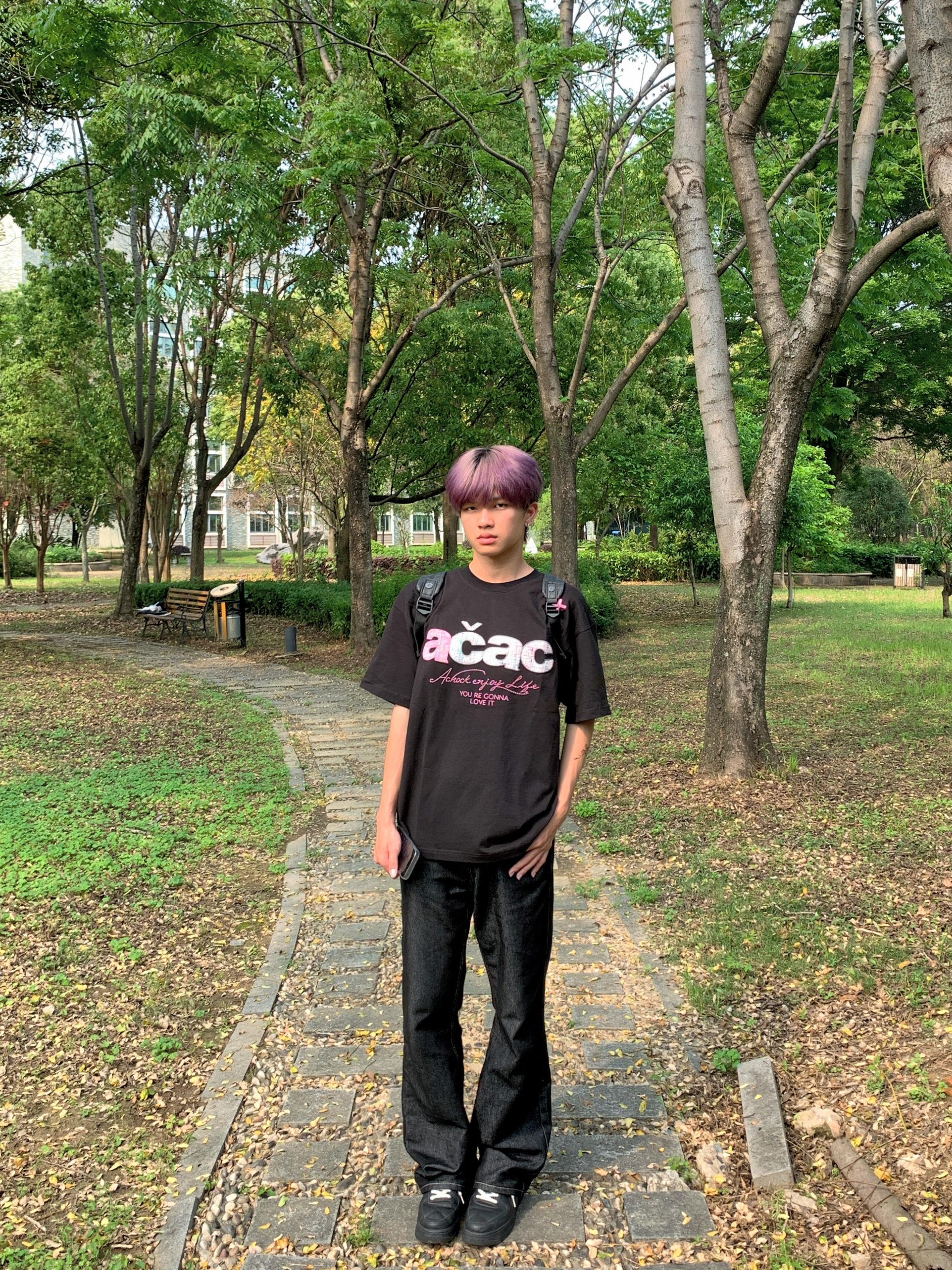 趁着阳光漫进树林,偷个慵懒午后🌤️ 宽松印花黑T搭配复古直筒黑牛 随性松弛的版型,自带街头氛围感 不用刻意雕琢,自在就是最好的状态 简单穿搭,也能穿出专属潮酷少年气