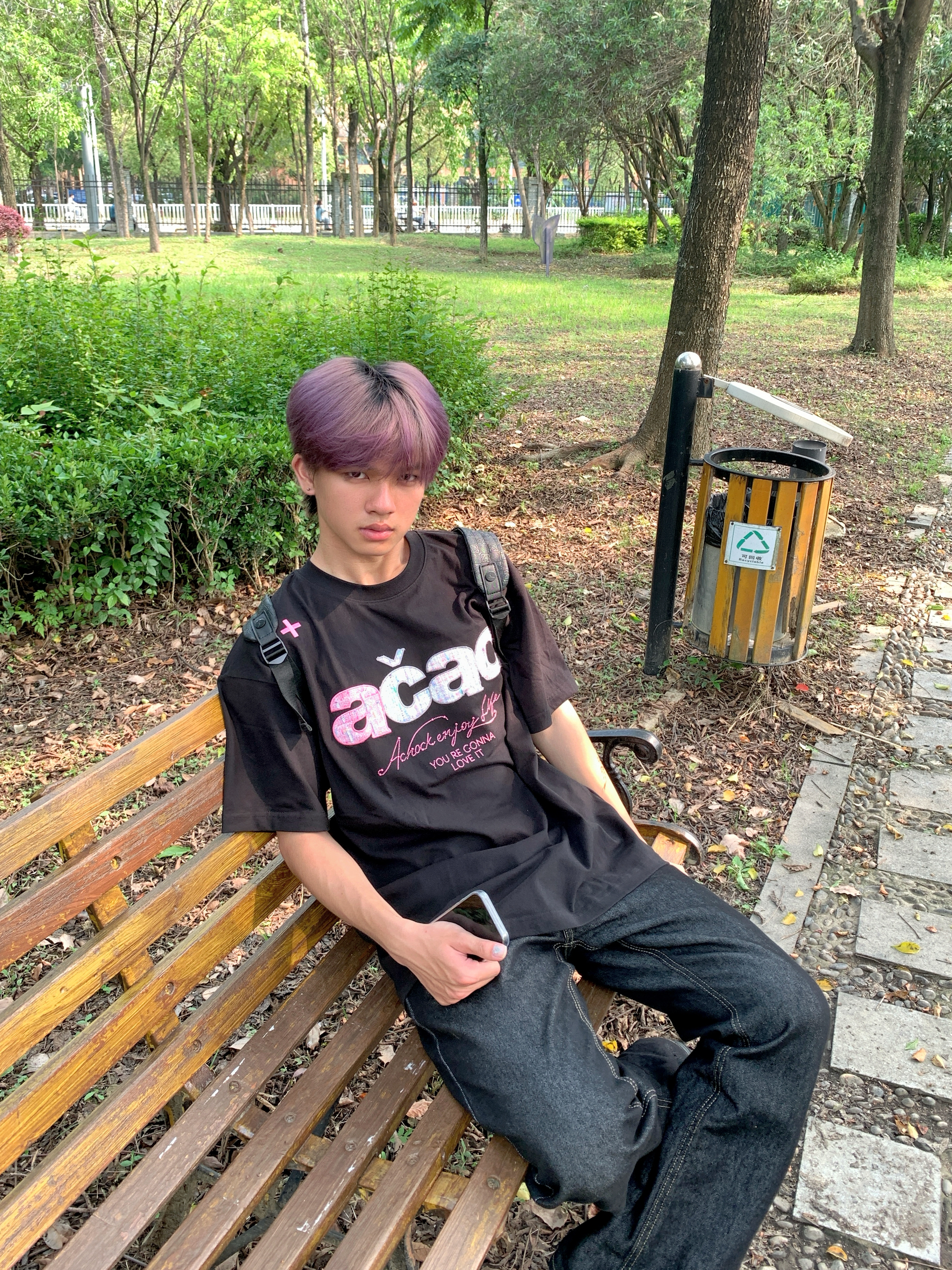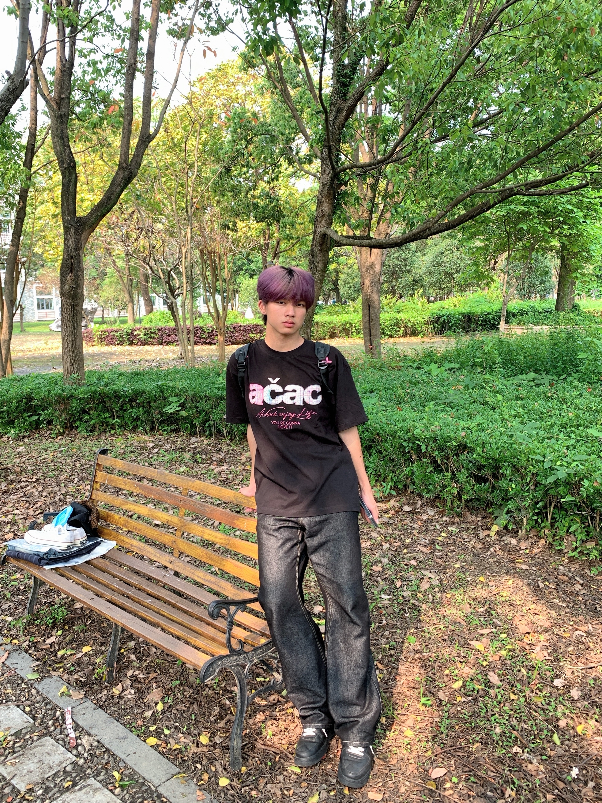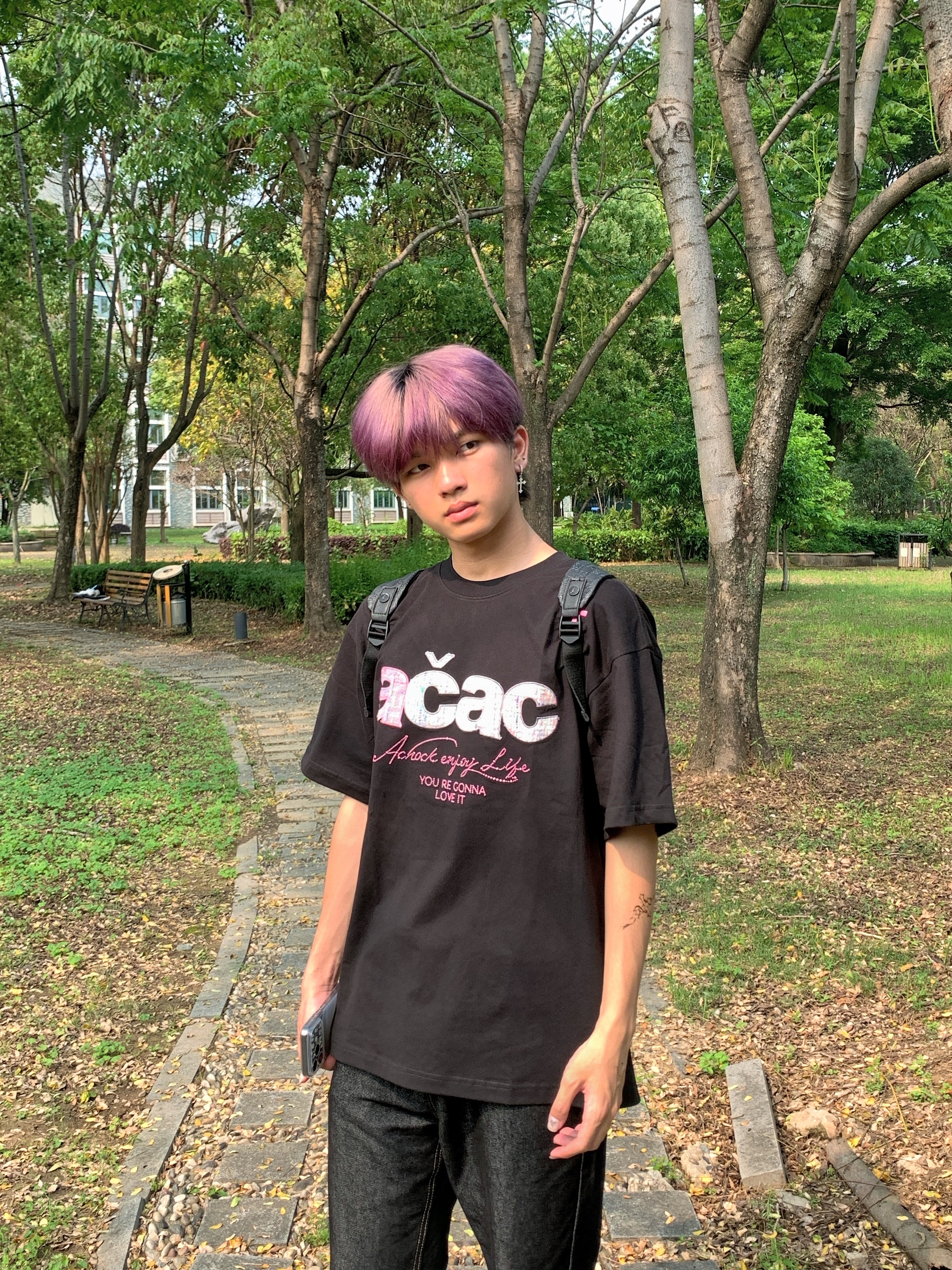 趁着阳光漫进树林,偷个慵懒午后🌤️ 宽松印花黑T搭配复古直筒黑牛 随性松弛的版型,自带街头氛围感 不用刻意雕琢,自在就是最好的状态 简单穿搭,也能穿出专属潮酷少年气