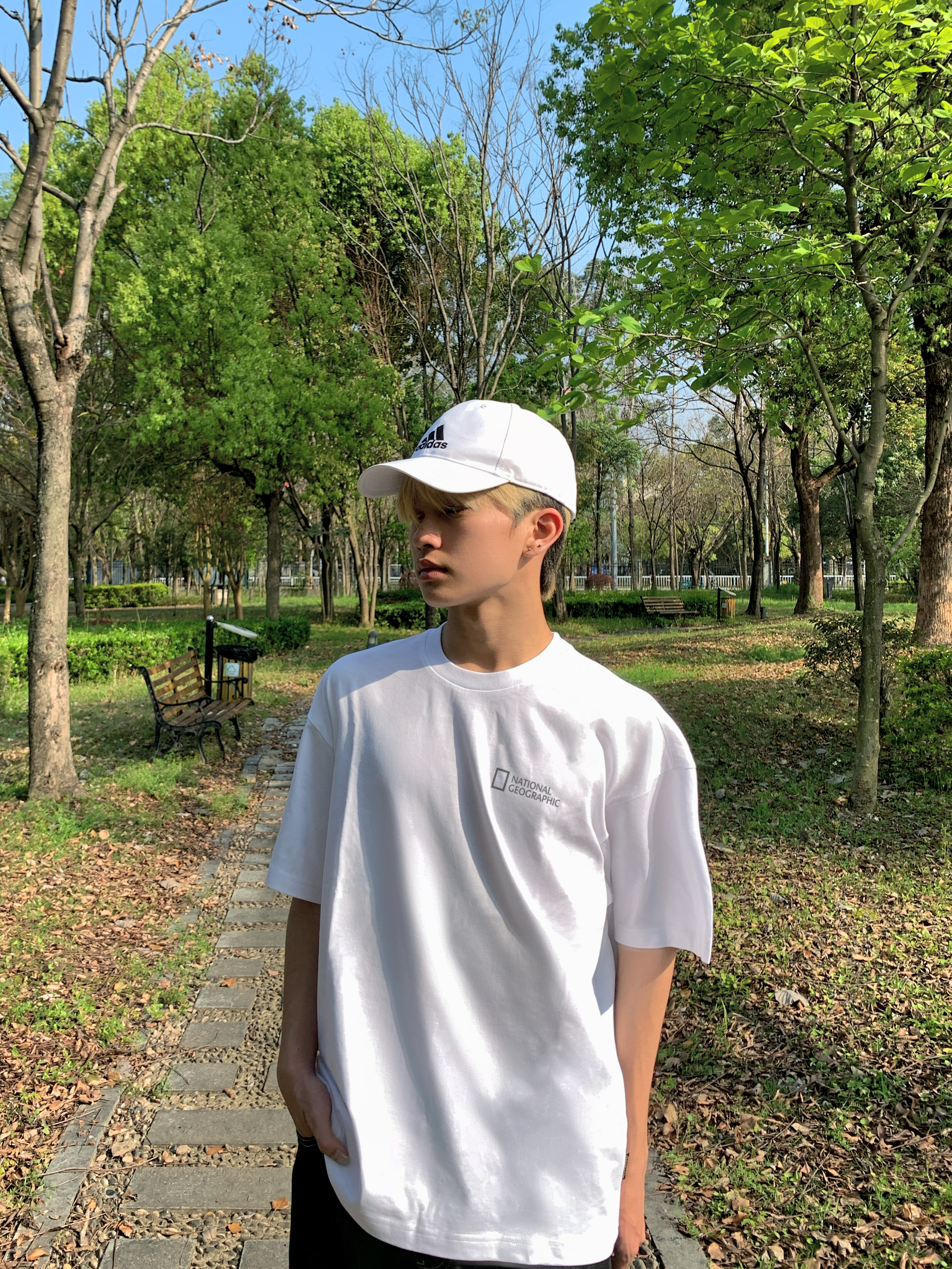 林间阳光随拍🌤️ 基础白T+复古黑牛的万能公式 宽松版型主打自在随性 一身清爽搭配,少年感直接拉满 不费力的简约穿搭,日常出街首选