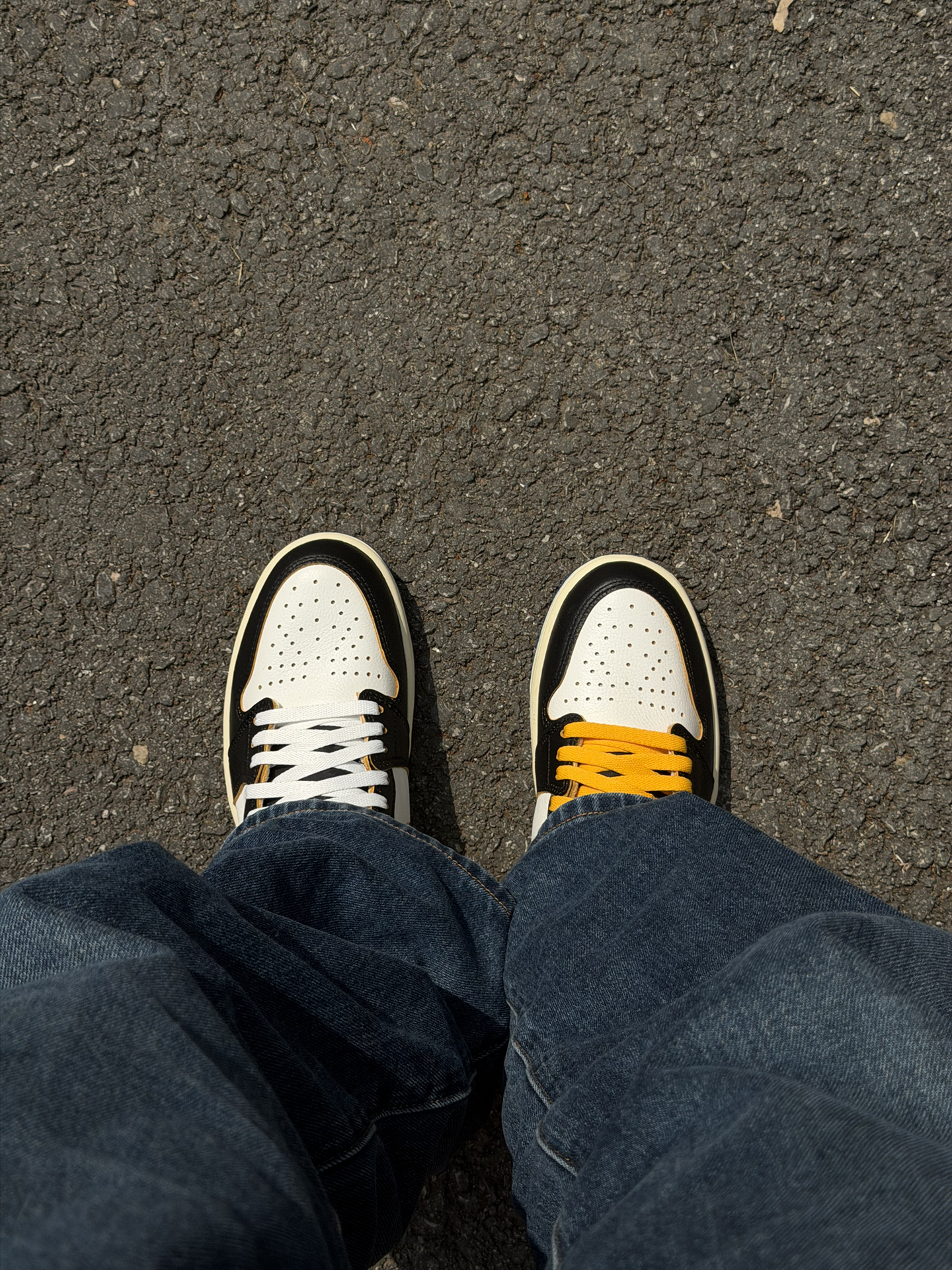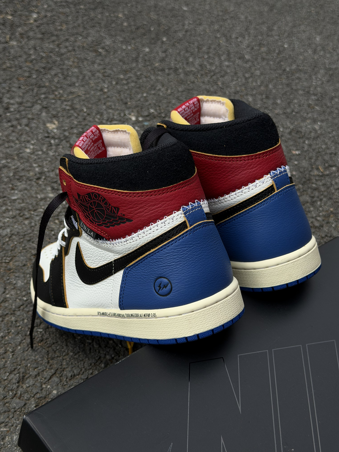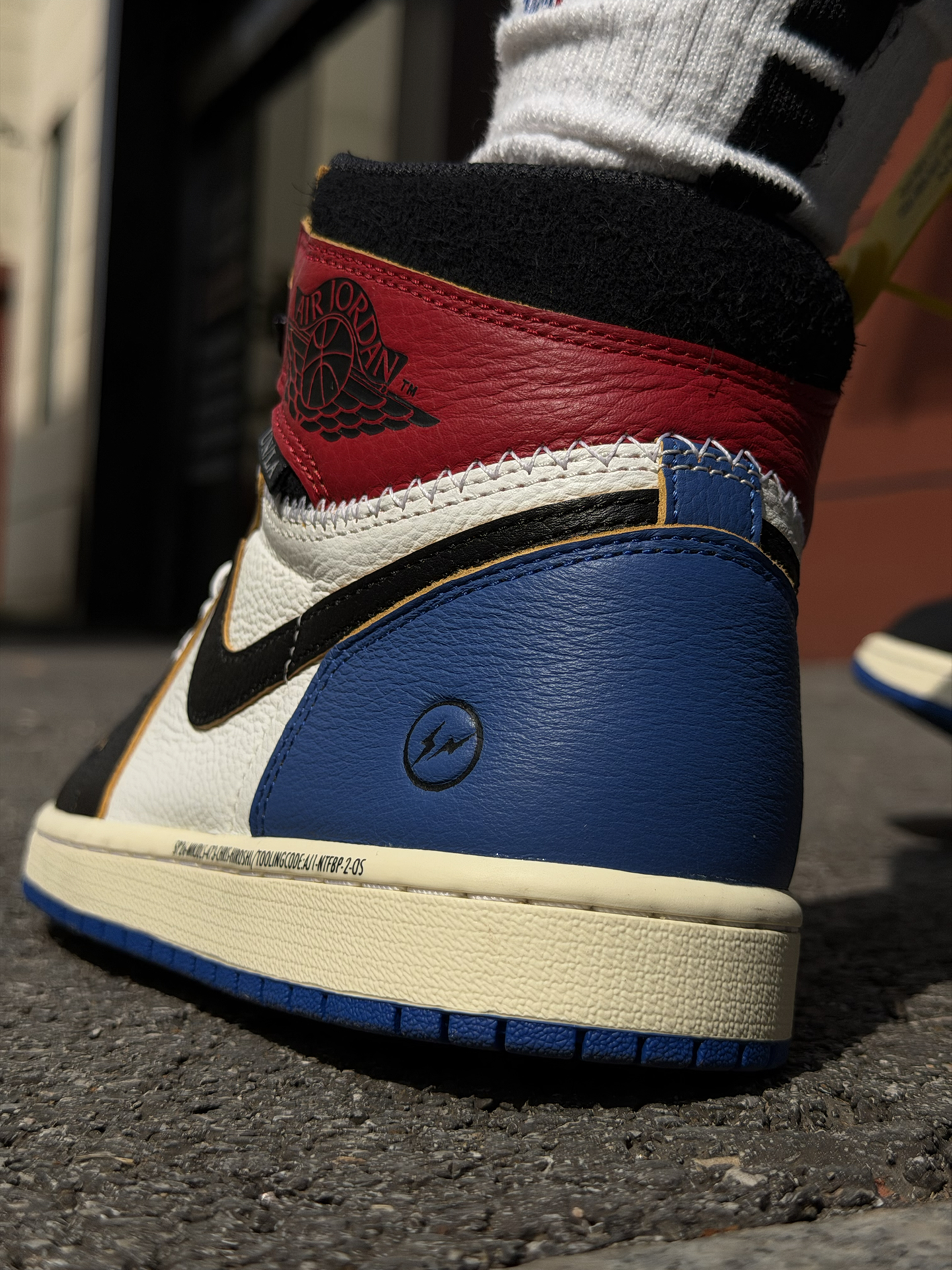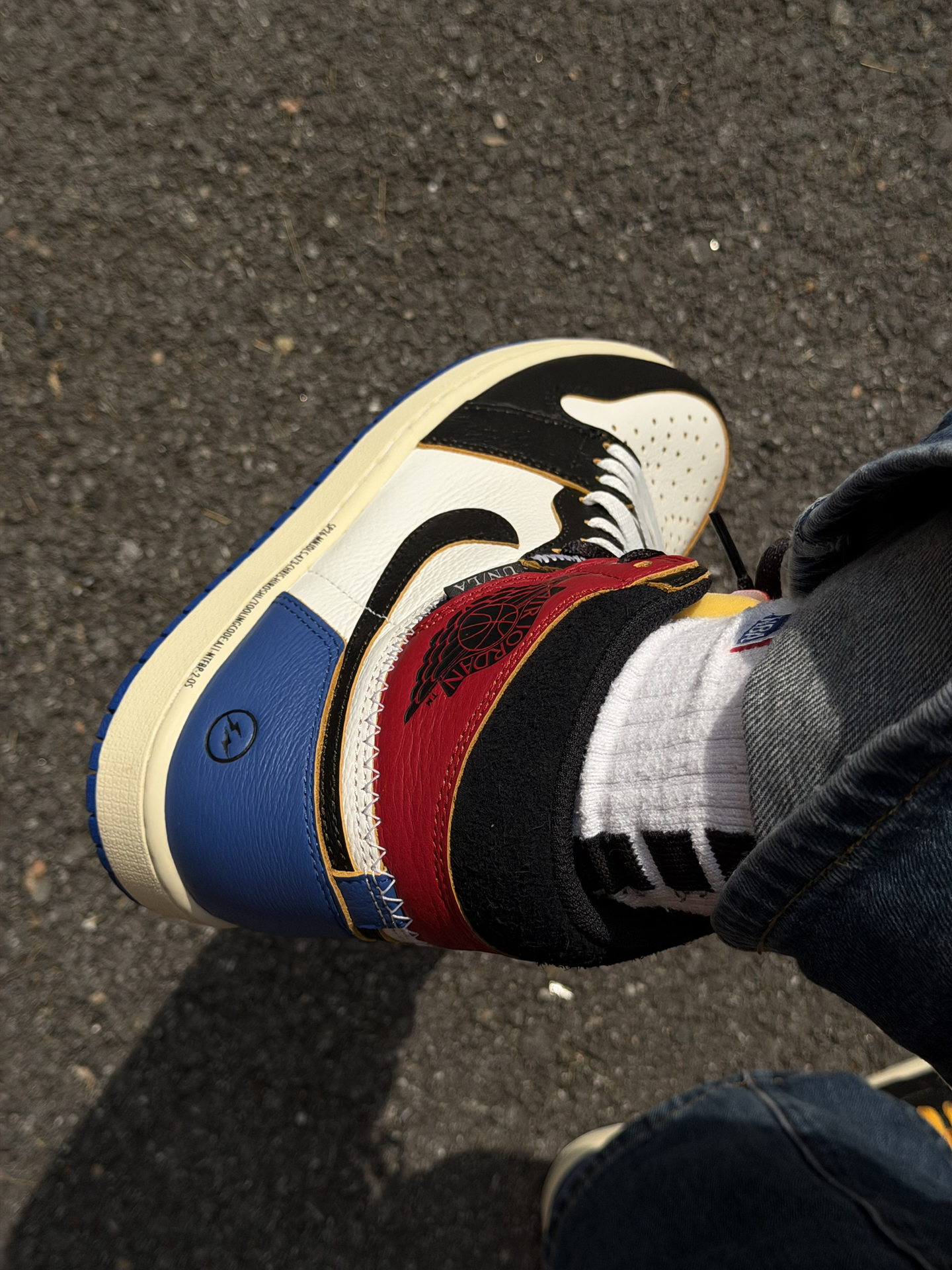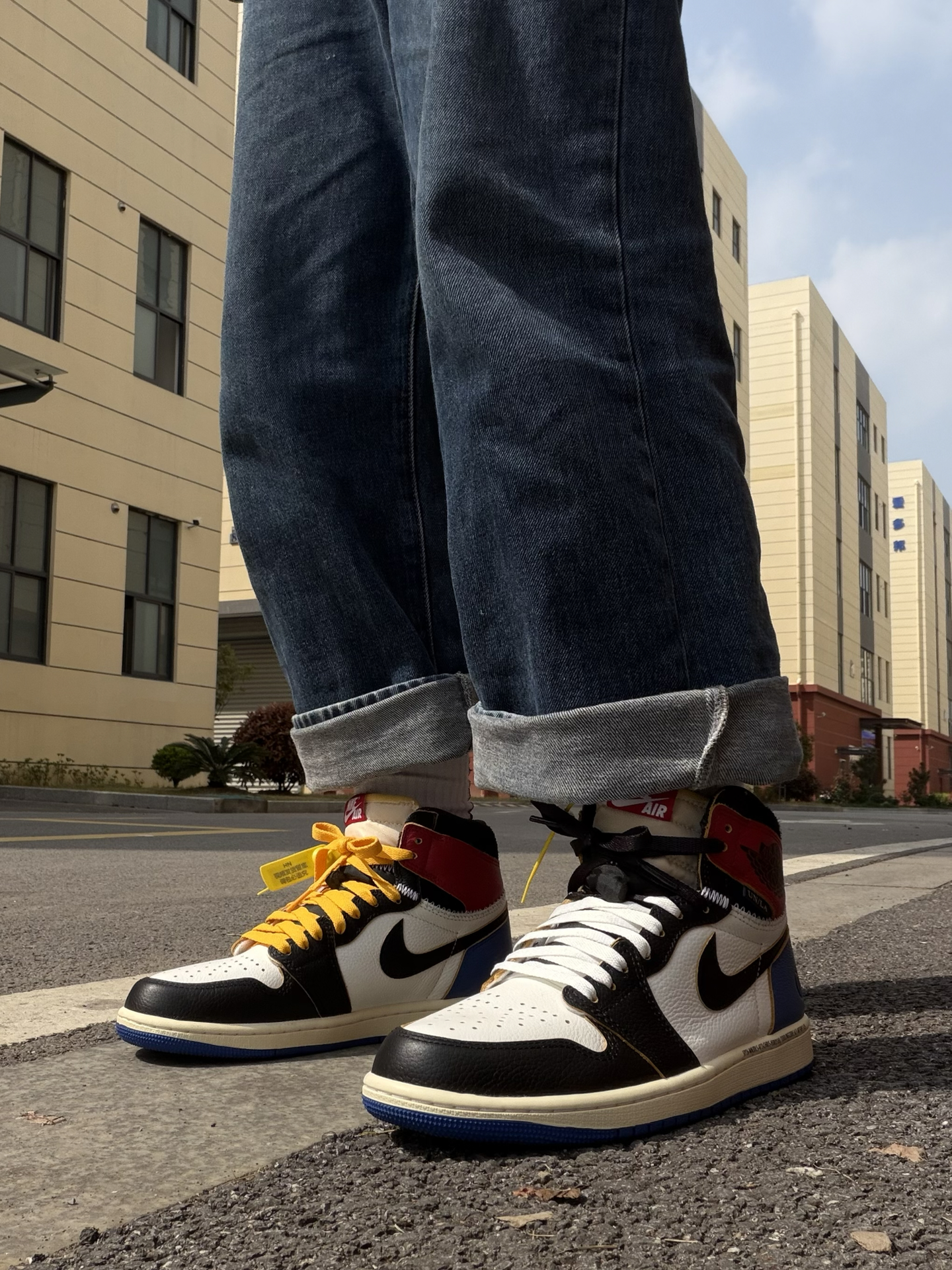 这年头休闲鞋的品类太多了,nike早已不是大多数人的选项了,因此不管几方联名价格都不会高的。 今天上脚这双aj1 union fragment虽然没有原价,但是购入的价格还算不错。红蓝撞色配色蛮特别的,春夏穿搭配牛仔也合适,主要是天气没有很闷,也不捂脚。 皮质做工还算不错的,味道不算很重。这次配了好几双鞋带,我换了个黄色的,也是和皮剖面的黄色呼应上了,目前算是性价比比较高的三方联名了
