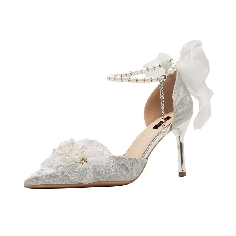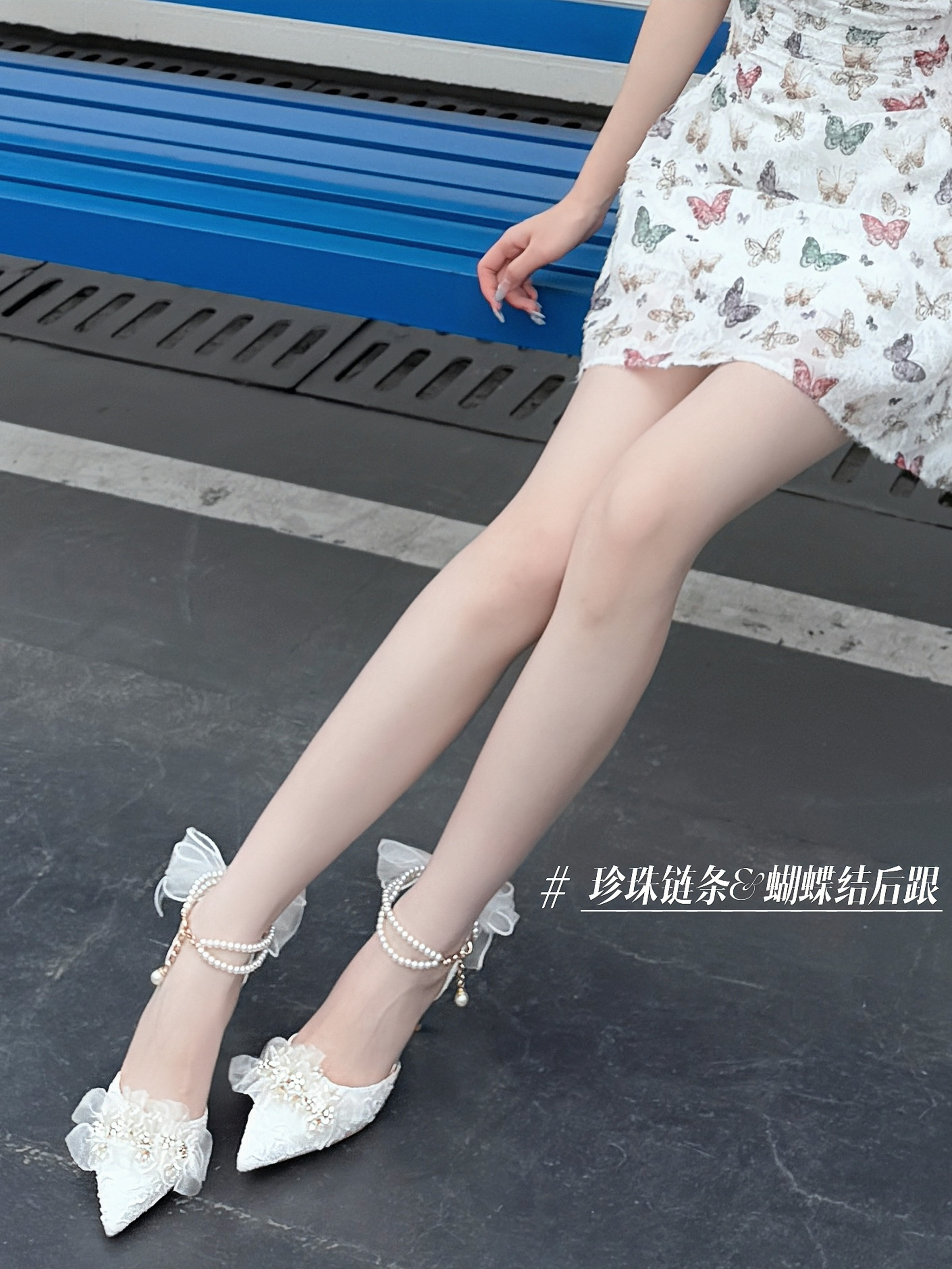 这双敦奴高跟鞋👠直接美到心巴上啦✨ 白色蕾丝🎀鞋面+精致花朵水钻💎 珍珠链条绑带⚜️随脚步晃动☁️ 尖头细跟✅超显腿长耶~ 上脚稳当不磨脚哦✨! 约会、聚会👭🏼穿都超提气质👒 温柔又灵动💗 甜妹辣妹都能驾驭👗 妥妥的仙女🌷鞋本鞋噢~