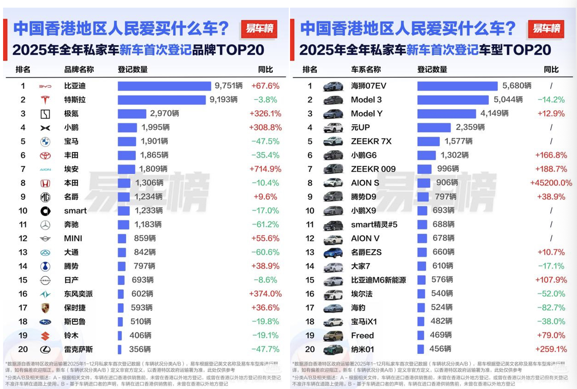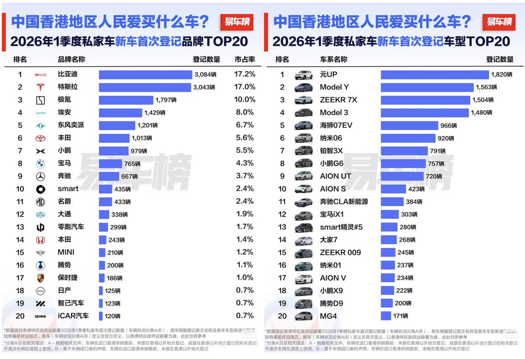 2026年开年,比亚迪在香港市场持续领跑,展现出强劲发展势头。数据显示,3月比亚迪以1763辆登顶全品牌销量榜,其中元UP贡献1497辆,成为当月最畅销车型,充分彰显双料冠军非凡实力。 从一季度整体表现来看,比亚迪累计销量达3084辆,市占率约17.2%,稳居品牌销量冠军;元UP累计销售1820辆,同步摘得车型销冠,实现“品牌+车型”双料冠军。这一成绩不仅彰显了比亚迪在香港市场的竞争力,也体...