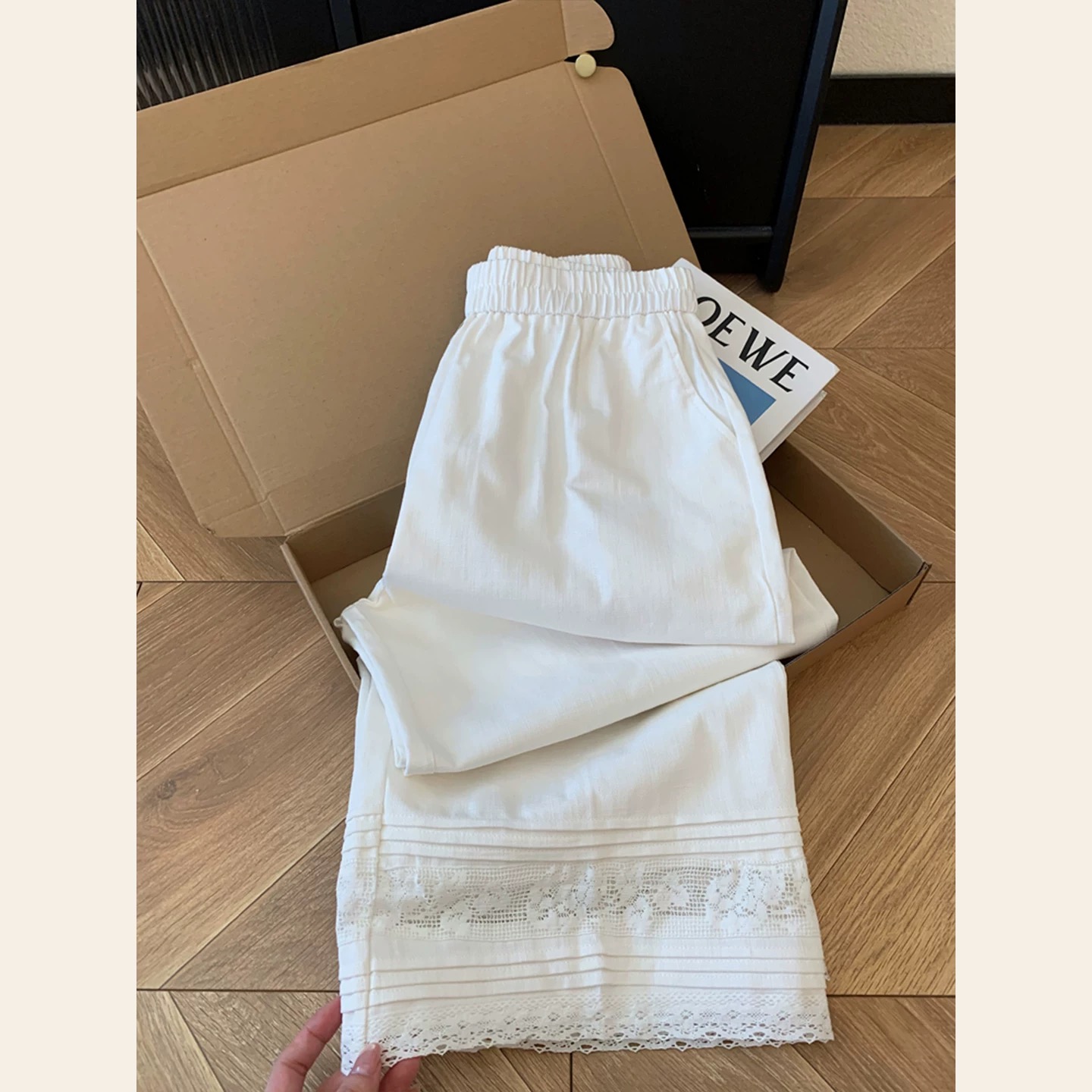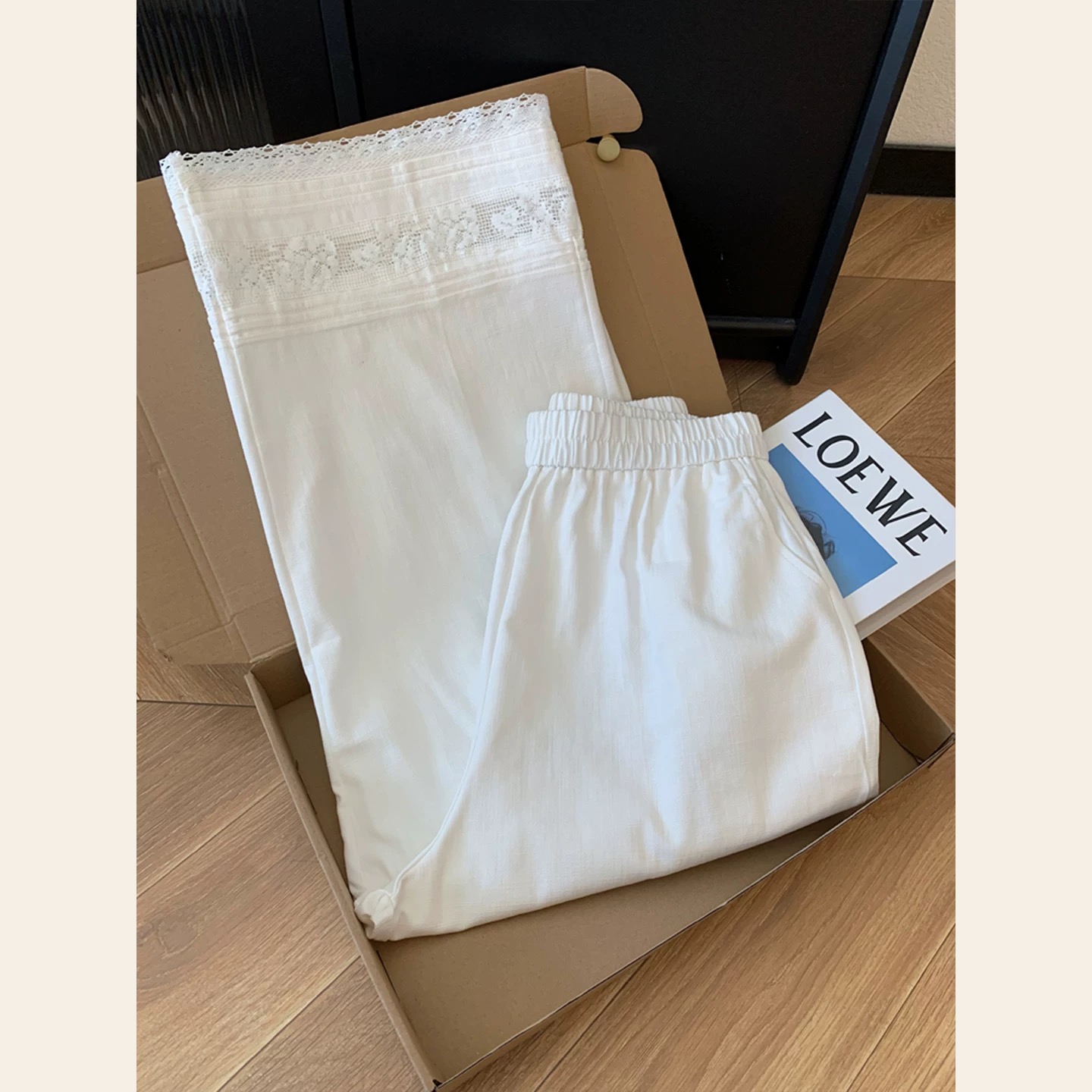 谁懂啊!这条白色蕾丝阔腿裤直接把夏日氛围感焊死了😭 抹胸式腰头+松紧打揽设计,巨贴合不滑落,还能悄悄藏住腰腹肉肉 裤身做了超仙的蕾丝飘带+镂空刺绣花边,走路带风的飘逸感直接拉满 纯白棉麻面料透气到飞起,夏天穿完全不闷汗,垂感绝了