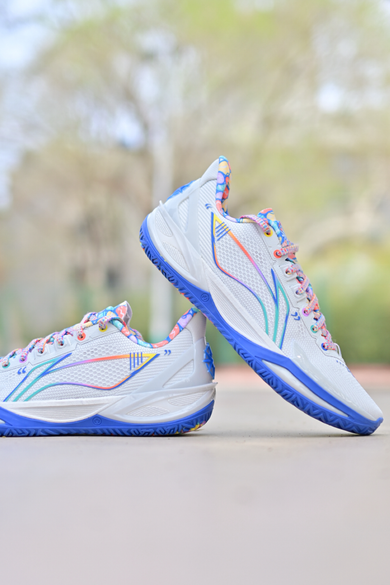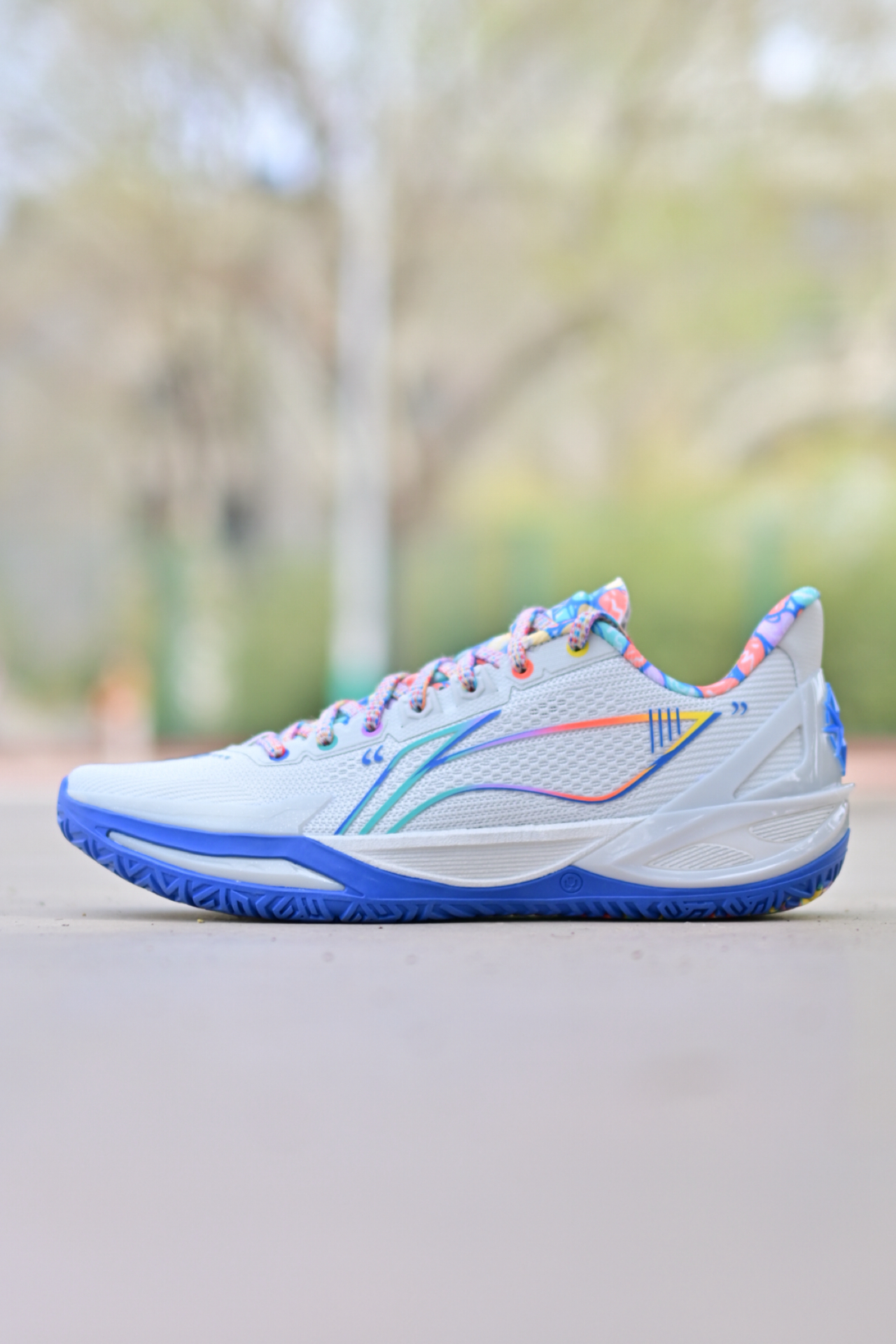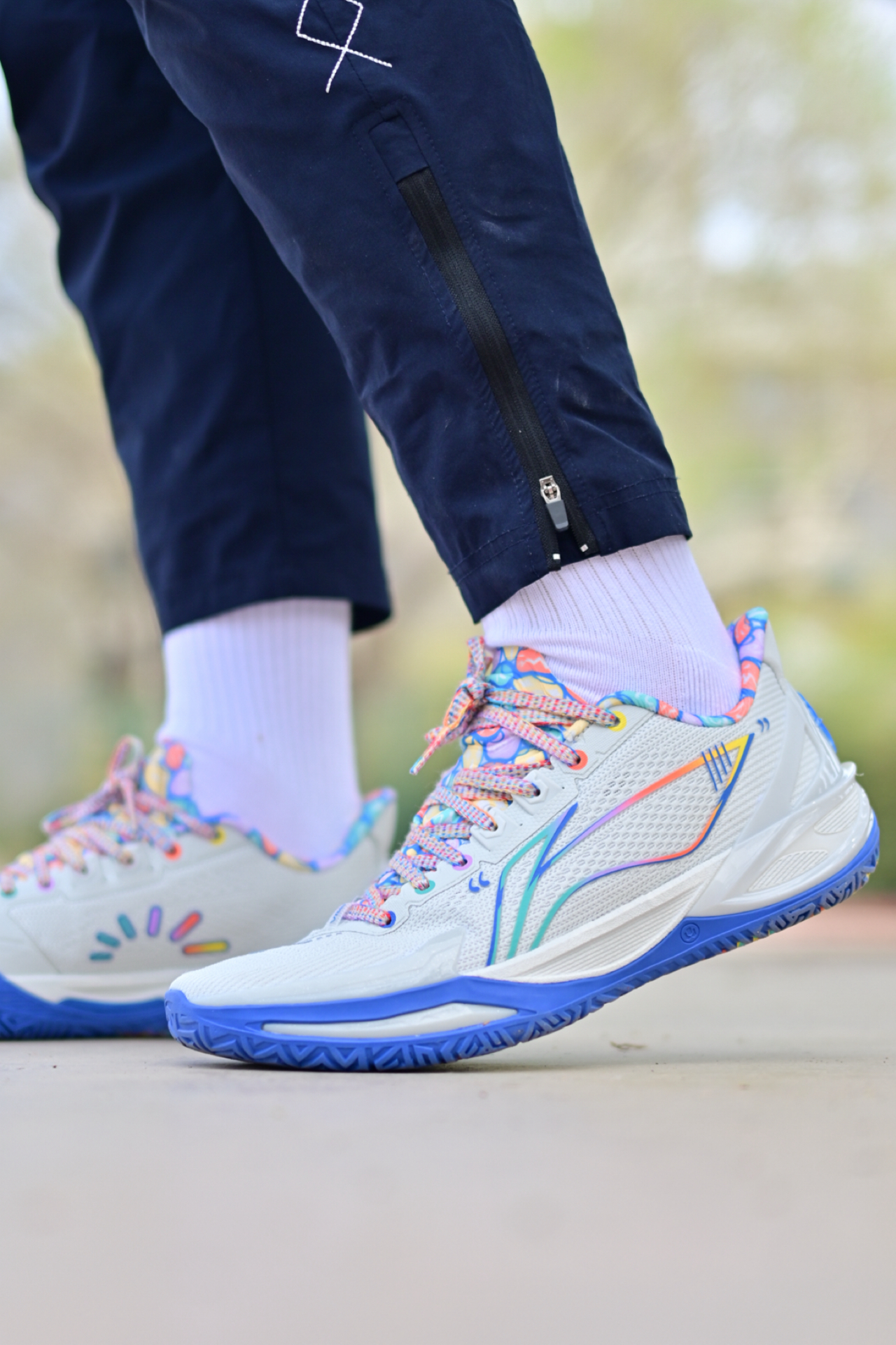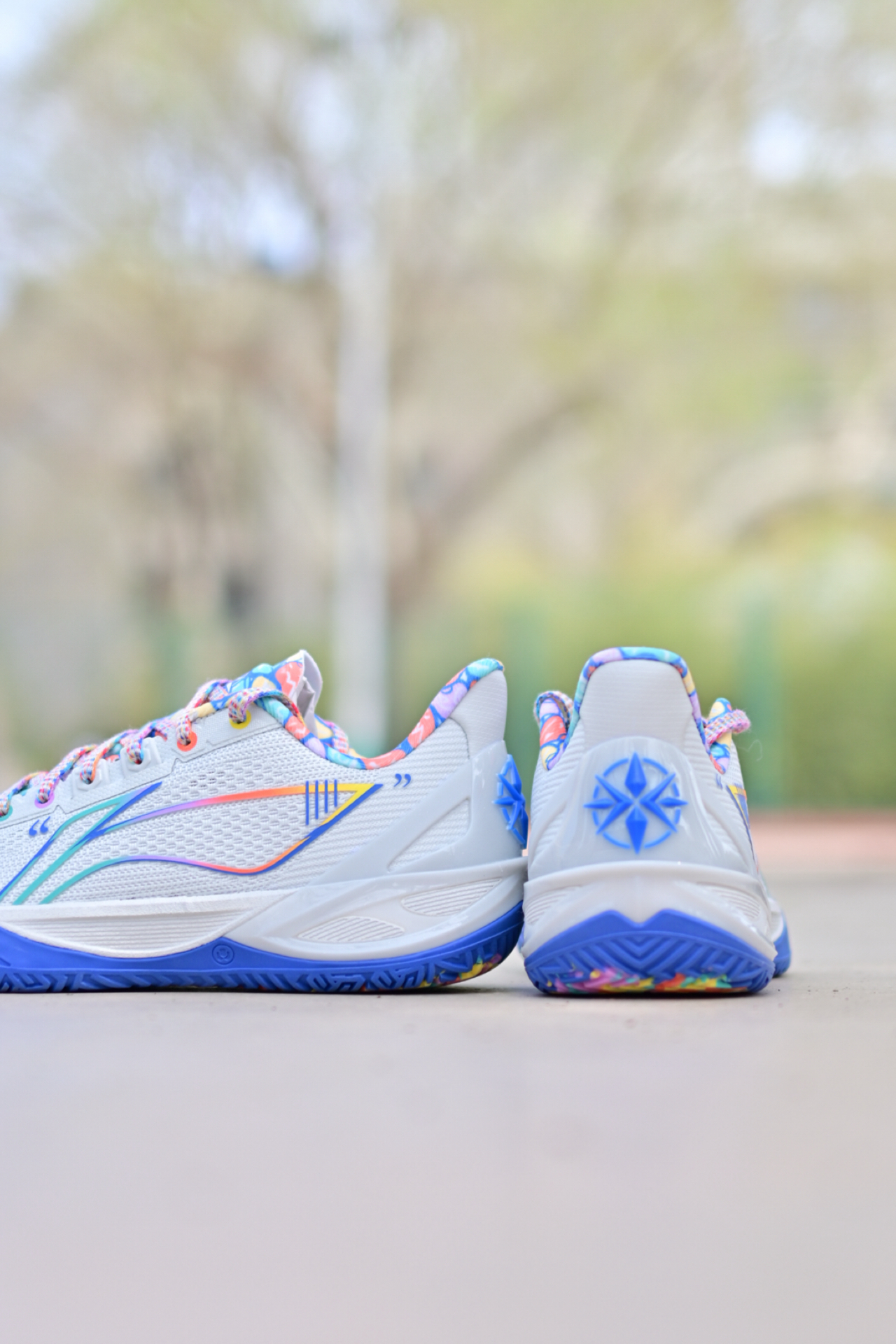 那这是宁子利刃6v2的又一个新配色,我这双叫做I人,当然还有另外一双E人配色。 他的鞋身上会有很多,独特设计的元素,鞋带以及鞋子内靴一圈是撞色的图案,包括侧边宁子logo也是彩虹的渐变色[机智_blue]上脚的辨识度就很高啊~蛮夏天的一个配色 那配置不用过多赘述,全掌䨻,前后超䨻填充,很适合爱跑爱跳的7突3投的朋友[狗头_blue] 利刃6V2