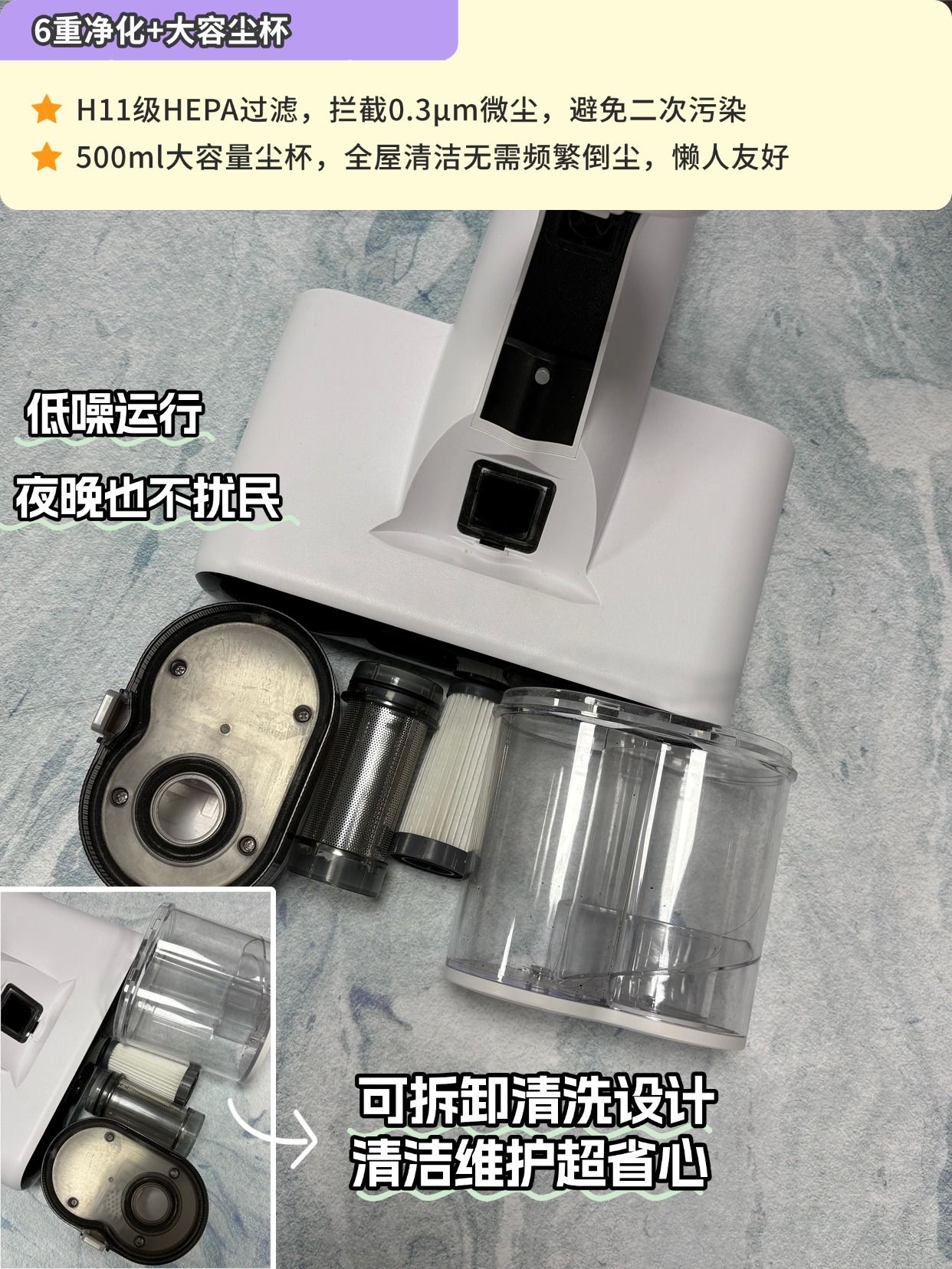 📱 智能尘螨感应+LED大屏,哪里螨虫多一目了然;500ml双杯大容量,不用频繁倒灰;吸口加宽,包被 、大玩偶几下就搞定;机身可拆卸清洗,维护超省心。
