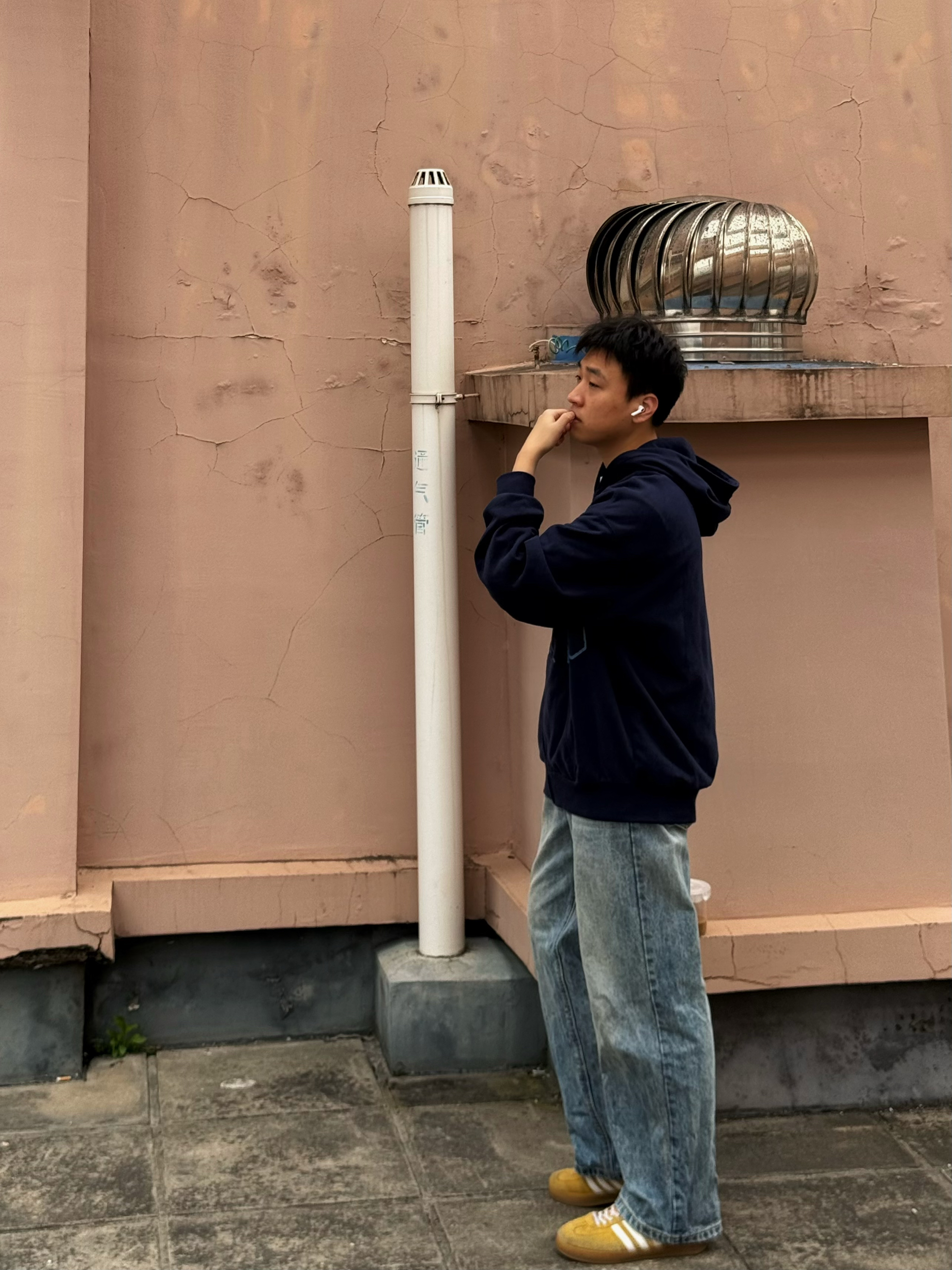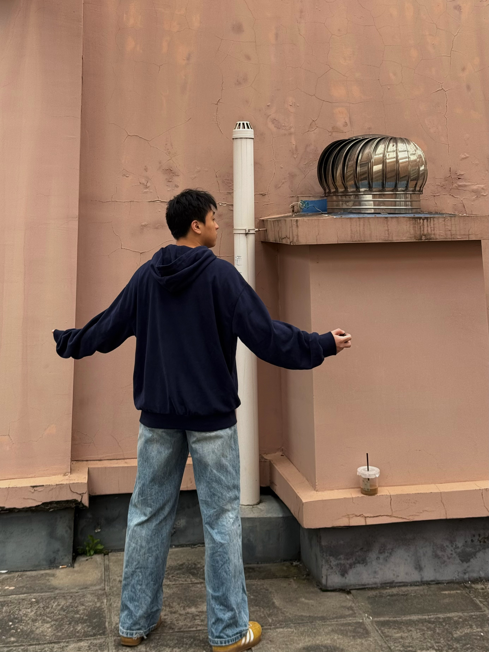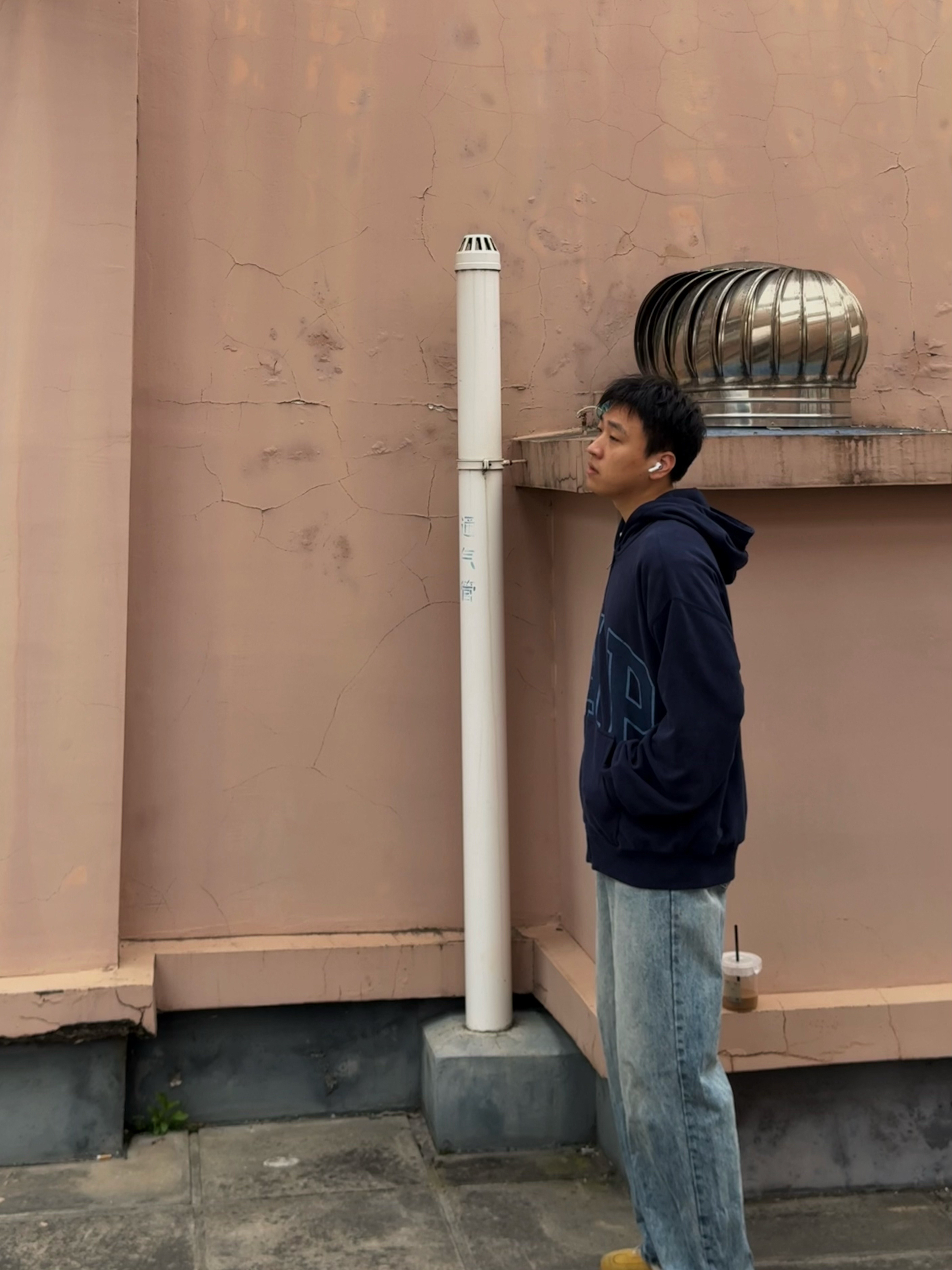 👔卫衣:GAP 虽然最近升温,但是早上还是会有点微微凉,兄弟们还是的准备一下外套🥶,藏青色连帽卫衣真的是衣柜常青树🌿 搭配做旧牛仔裤和经典德训鞋,一套就是很舒服的松弛感。刚好拉长比例,不压个子。 天台随手拍都出片,和我一样小个子身材比例不突出🥹,还喜欢这种简单干净风格的兄弟都给我冲!