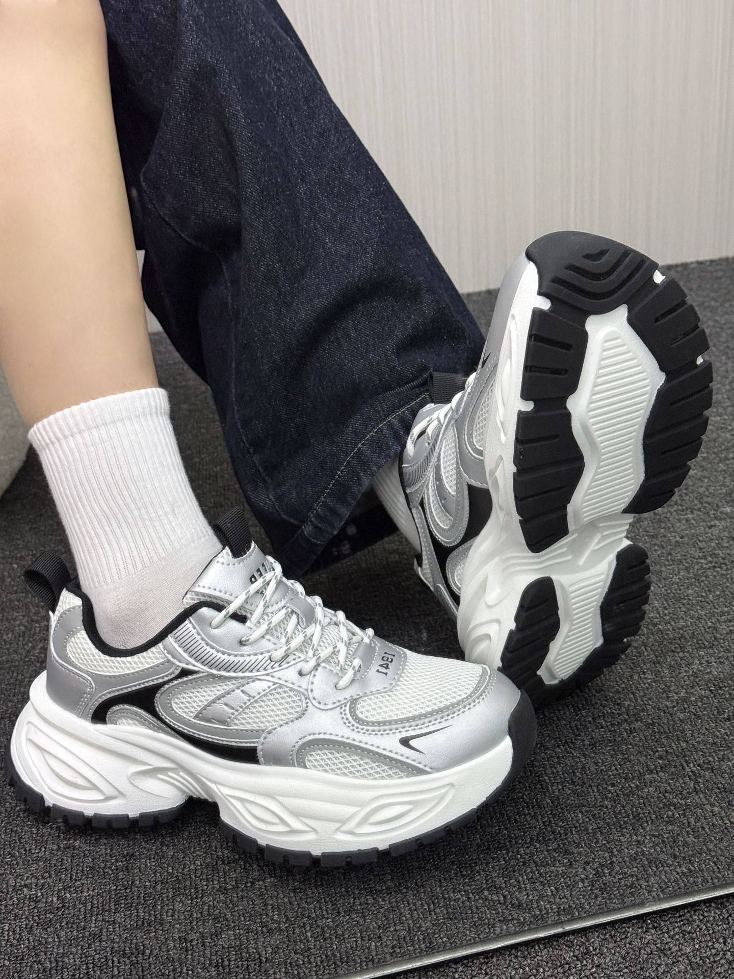 介双亮银老爹鞋真的泰绝了,满满的高级感 上脚完全不笨重,还特别显高 中底用的EVA材质,踩起来软弹又舒服,上脚直接秒变高个子 鞋面是网面拼接设计,久穿不闷脚,透气感在线 日常通勤、上学穿都完全hold得住 小个子,增高党介双直接锁死!!