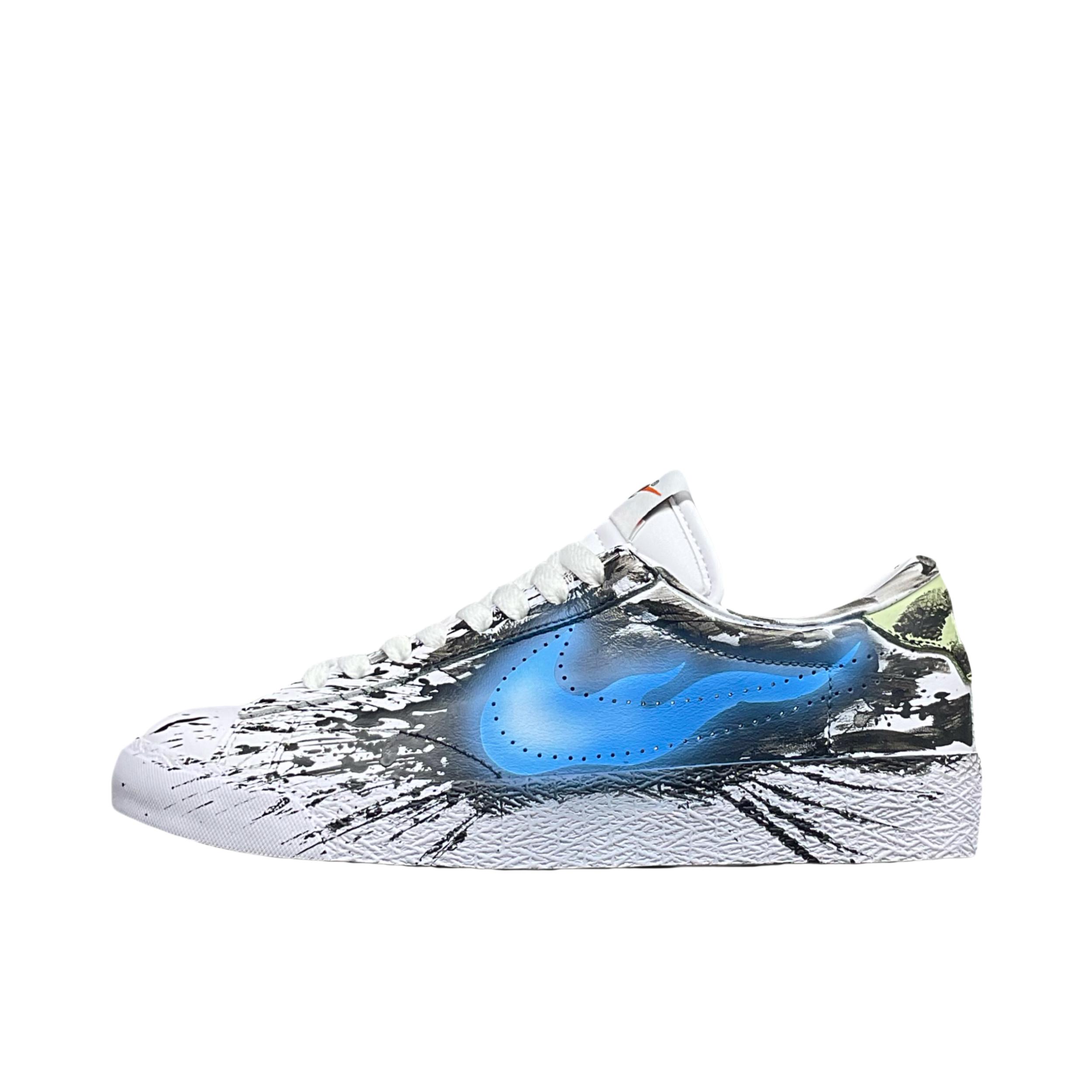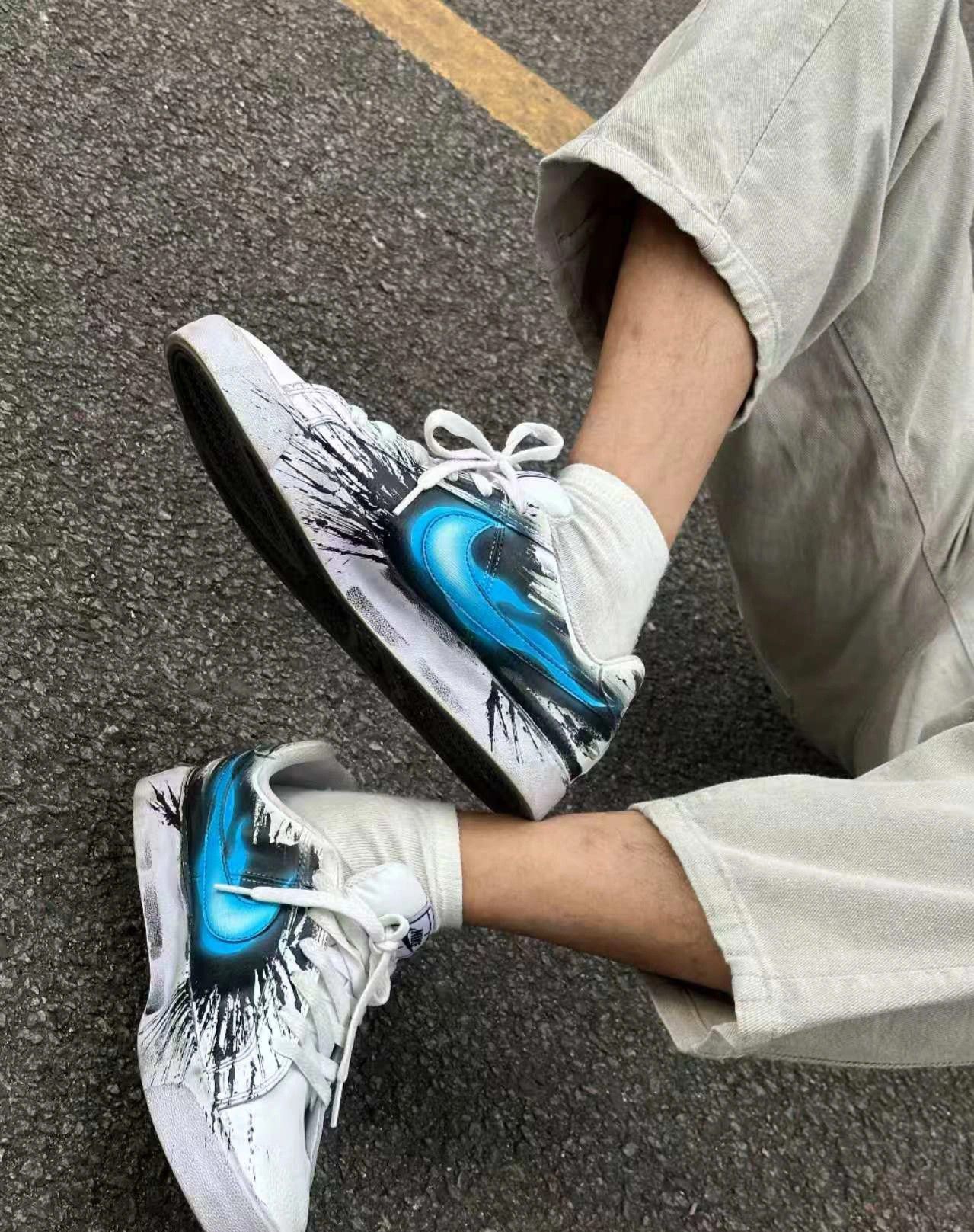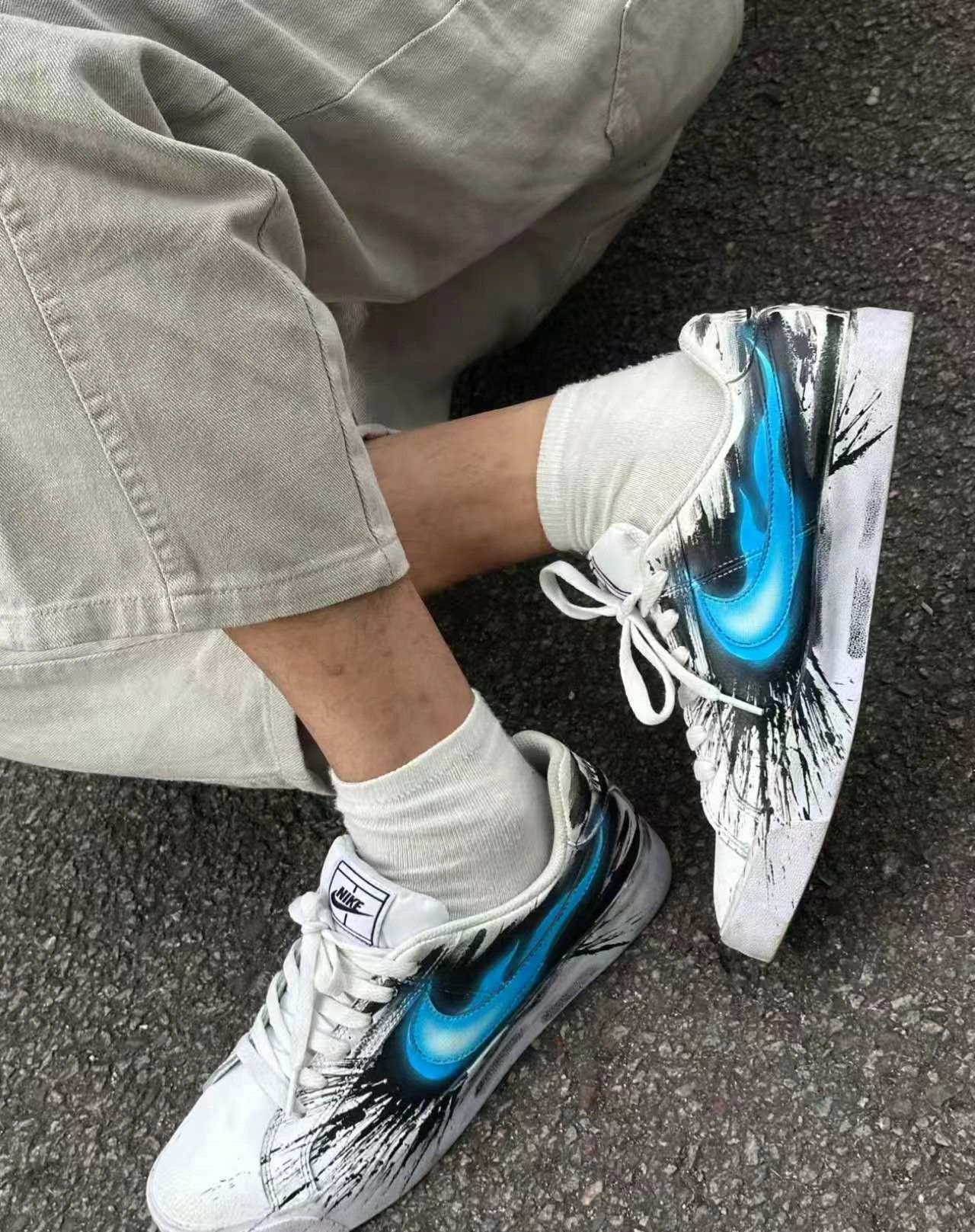 这双Nike Blazer是我自己定制的泼墨蓝款,每次穿出门都有人问链接。 鞋身的蓝黑泼墨设计真的太有艺术感了,渐变的蓝色Swoosh在阳光下特别亮眼,黑白泼墨的笔触又很有街头感,完全不会撞款。 Blazer的版型本身就很复古,搭配牛仔裤、工装裤都很有范儿,皮质鞋面也很好打理。 上脚轻便不磨脚,走在街上感觉自己就是最酷的仔,这种独一无二的感觉真的太爽了。