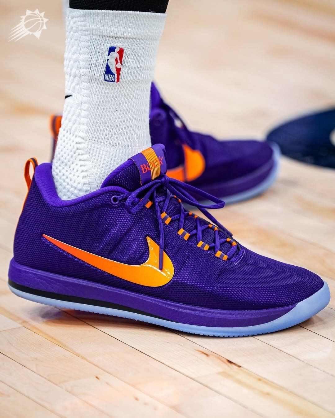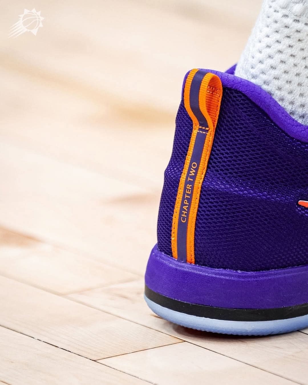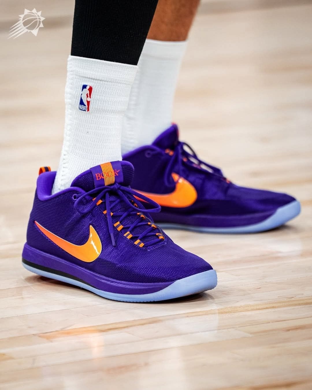 谁懂啊家人们!布克这双Nike Book 2 PE直接把90年代太阳队的魂穿到鞋上了✨ 紫橙撞色完美复刻了巴克利时期太阳队的经典复古球衣,一眼梦回那个激情四射的年代! 鞋身紫调+橙勾+鞋舌细节,每一处都在致敬菲尼克斯的传奇,布克上脚直接帅炸赛场! 太阳球迷直接DNA狂跳,这配色谁能拒绝啊!