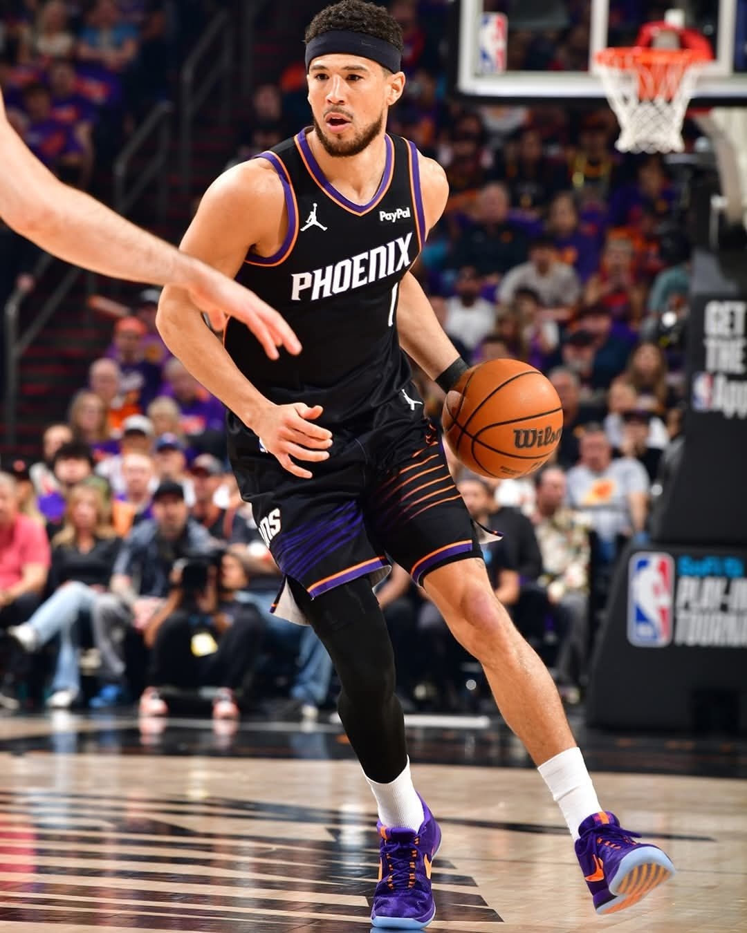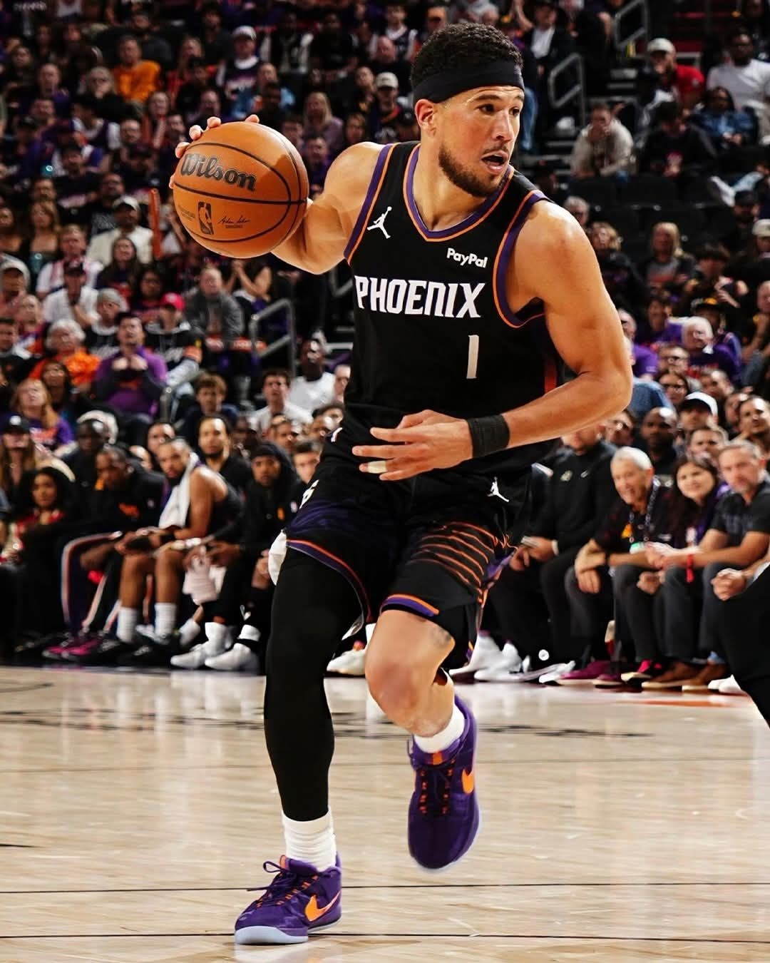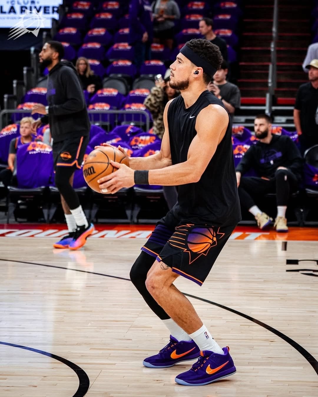 谁懂啊家人们!布克这双Nike Book 2 PE直接把90年代太阳队的魂穿到鞋上了✨ 紫橙撞色完美复刻了巴克利时期太阳队的经典复古球衣,一眼梦回那个激情四射的年代! 鞋身紫调+橙勾+鞋舌细节,每一处都在致敬菲尼克斯的传奇,布克上脚直接帅炸赛场! 太阳球迷直接DNA狂跳,这配色谁能拒绝啊!