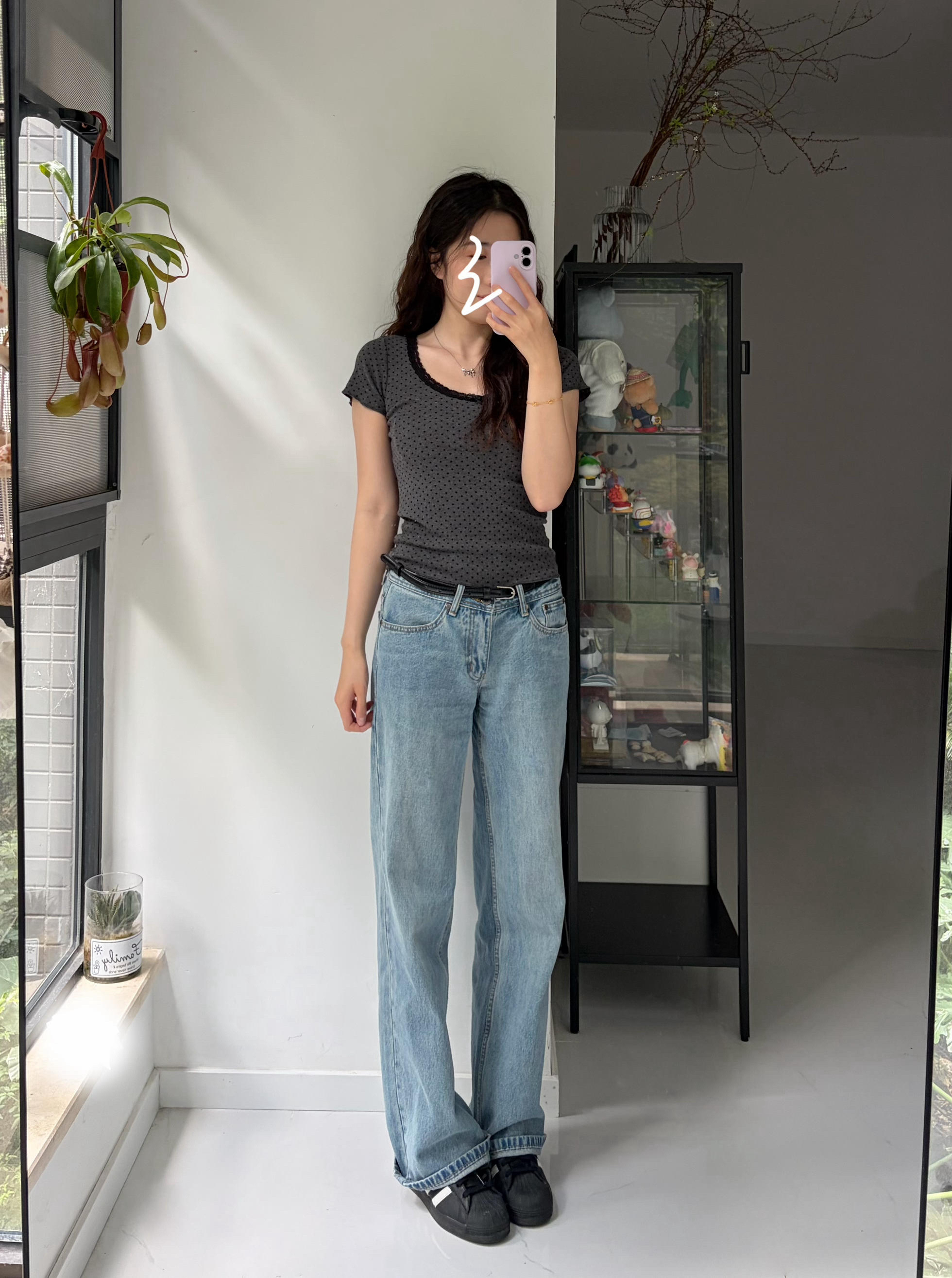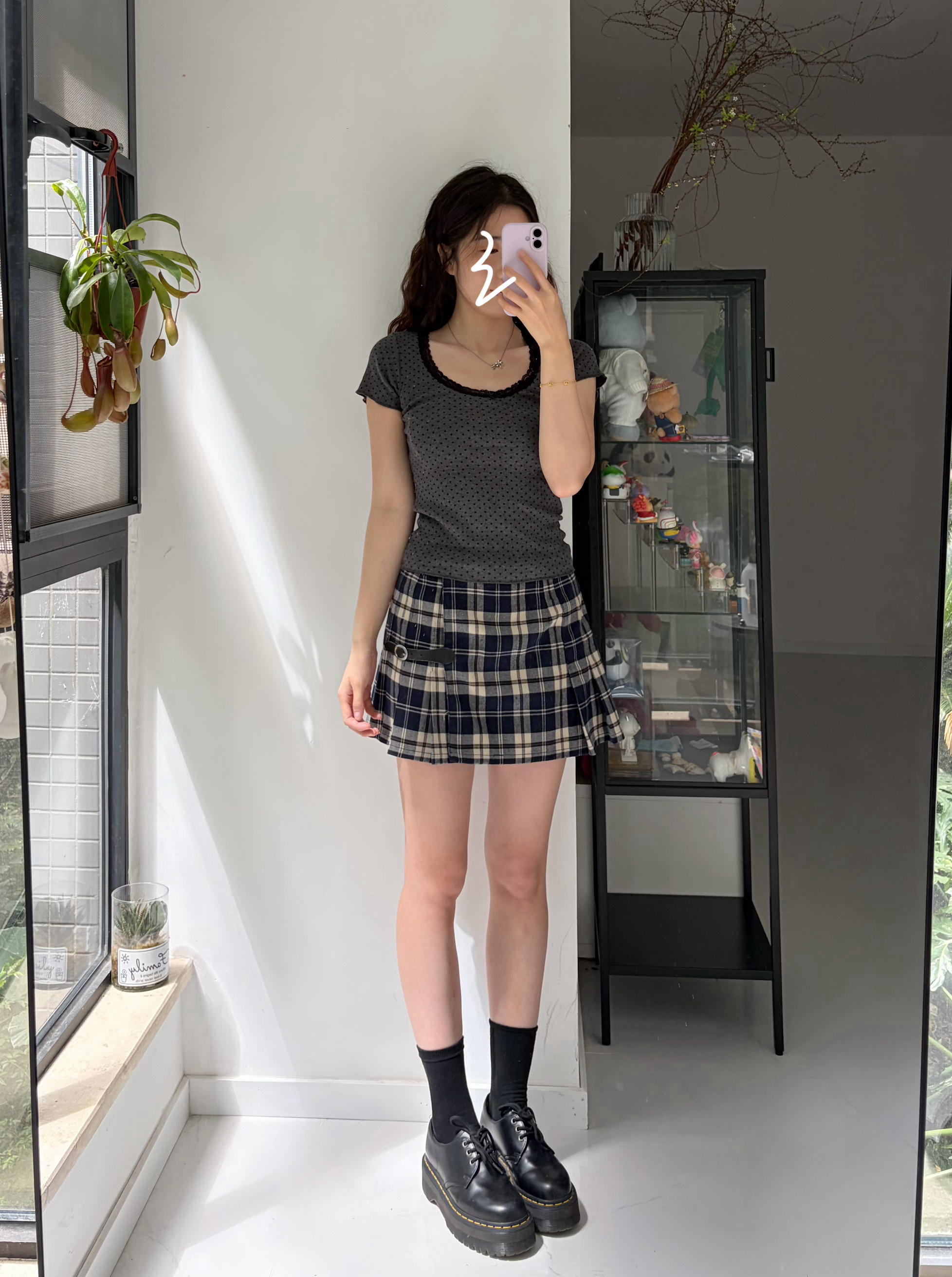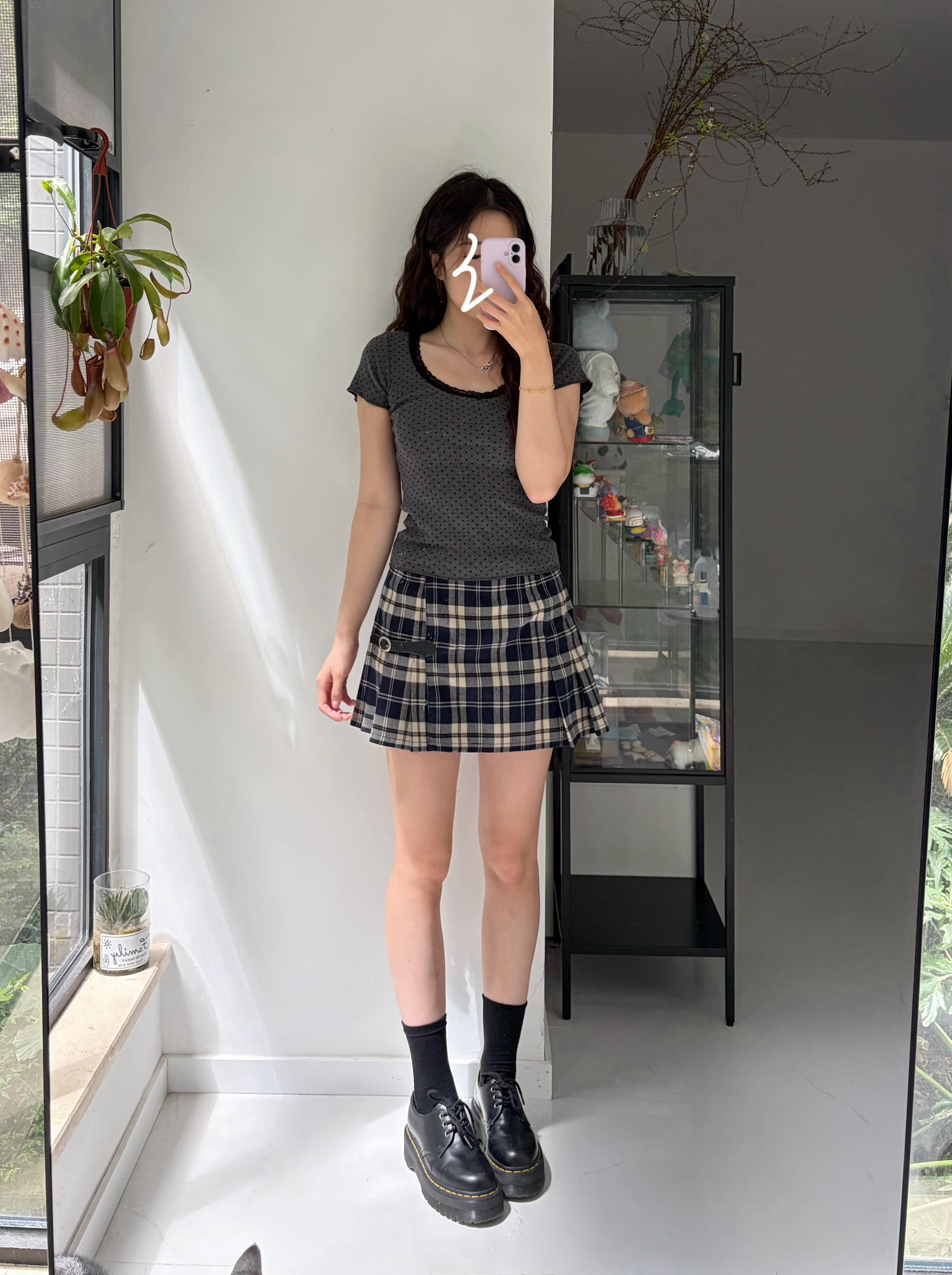 一衣多穿的快乐✨ 同一件波点蕾丝边T恤 搭配牛仔裤是松弛随性的日常感 搭配条纹百褶裙是满满的学院风📕 基础款的无限可能,永远不会出错。 👕:bm 👗:bm 👖:veryrareme