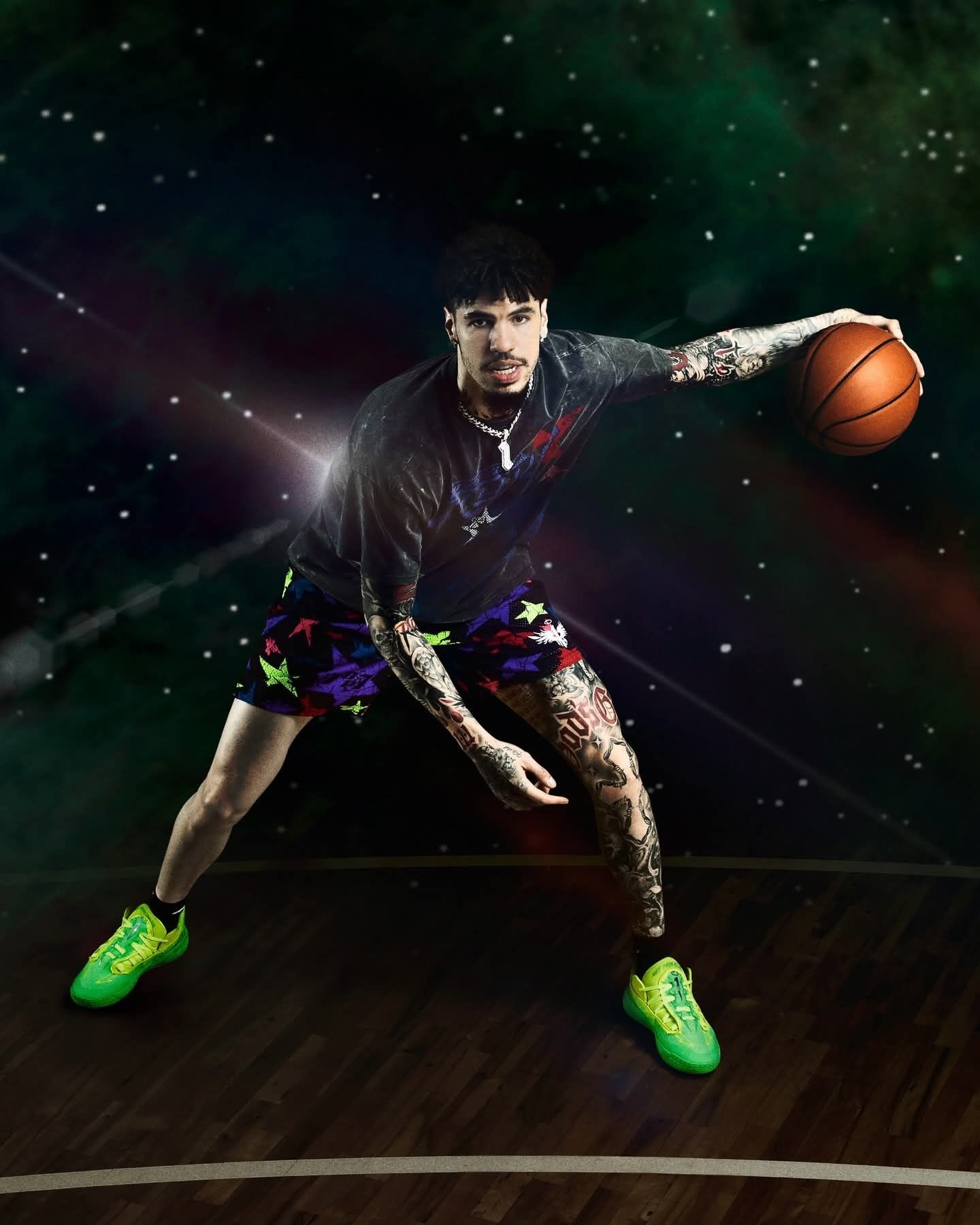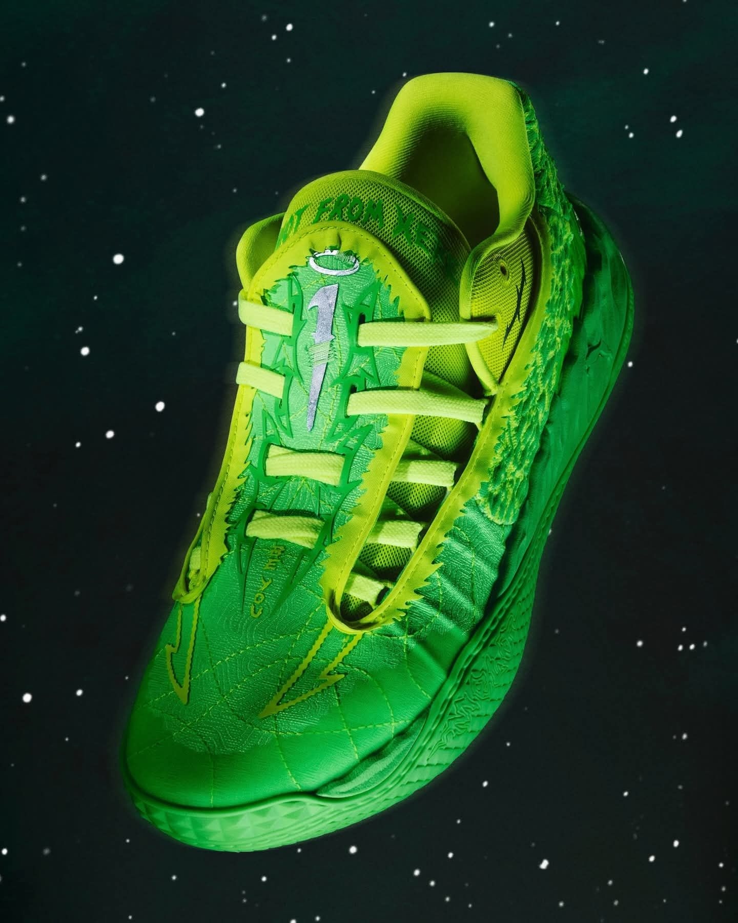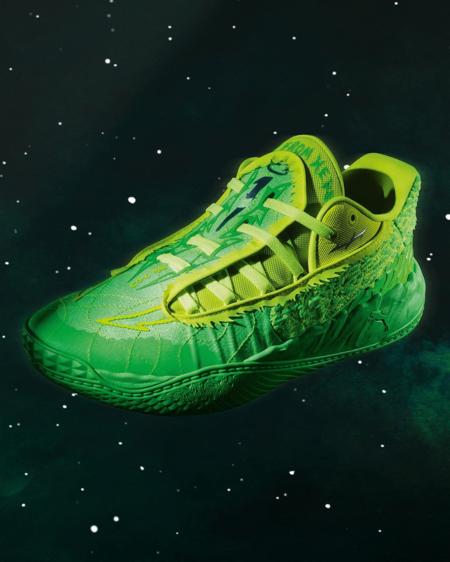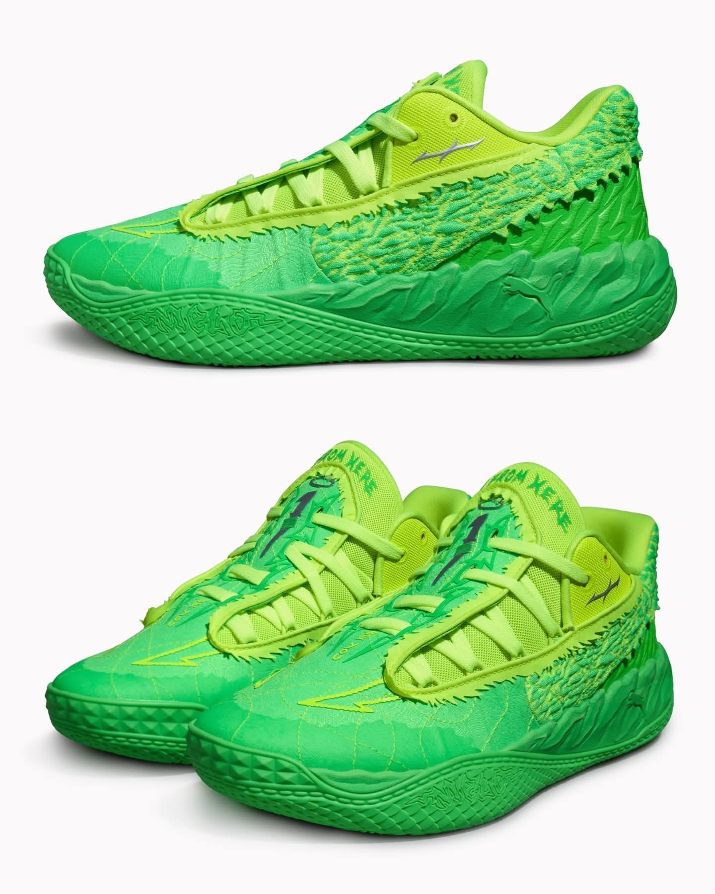 谁懂啊家人们!三球LaMelo Ball第五代PUMA签名鞋MB.05低帮版直接炸场✨ 通体荧光绿+锯齿状鞋身设计,把拉梅洛的个性和球场气场直接拉满! 鞋舌、鞋身的细节设计感拉满,低帮造型更灵动,完全踩中潮流与实战的双需求! 黄蜂队魂的新战靴,这颜值谁看了不迷糊啊!