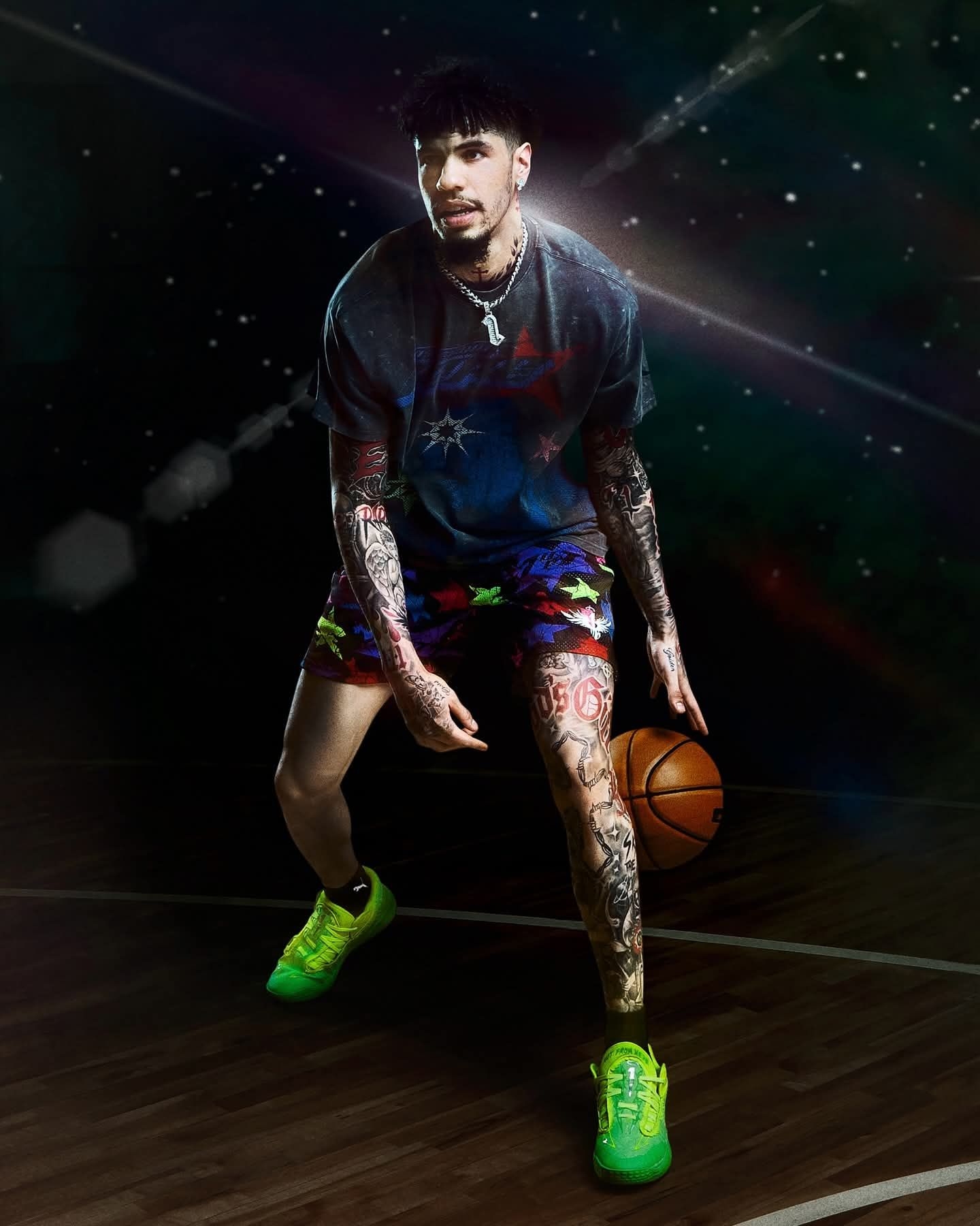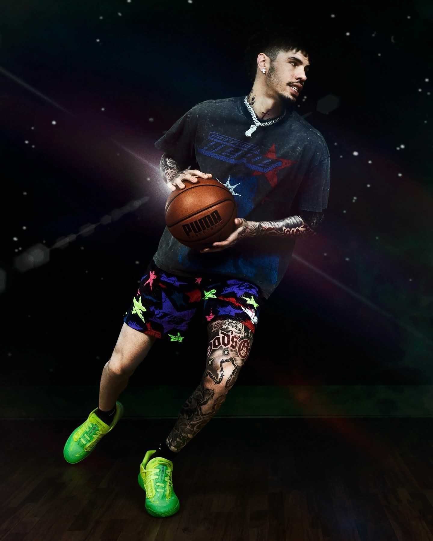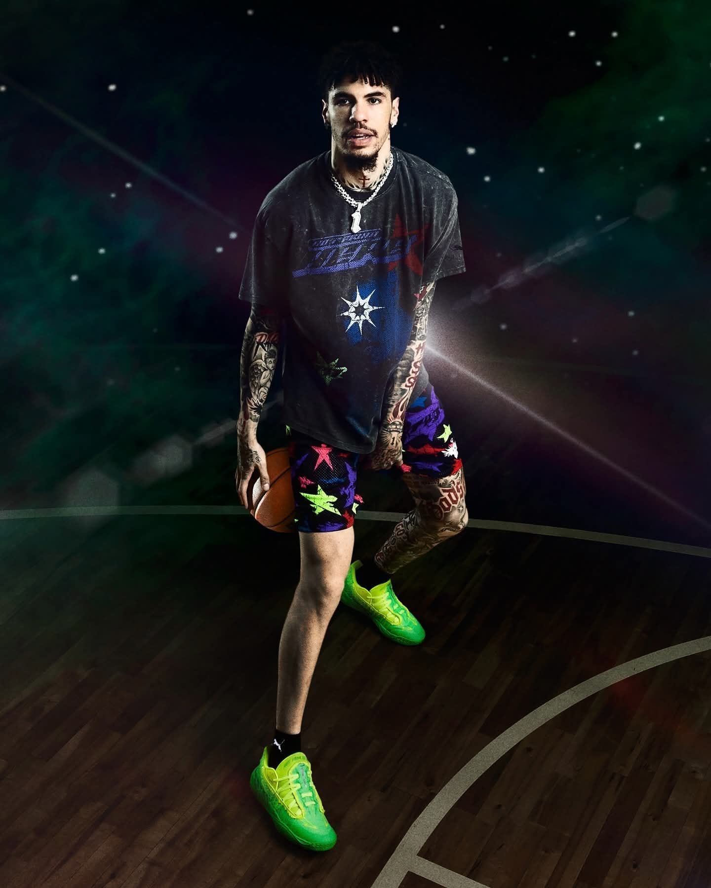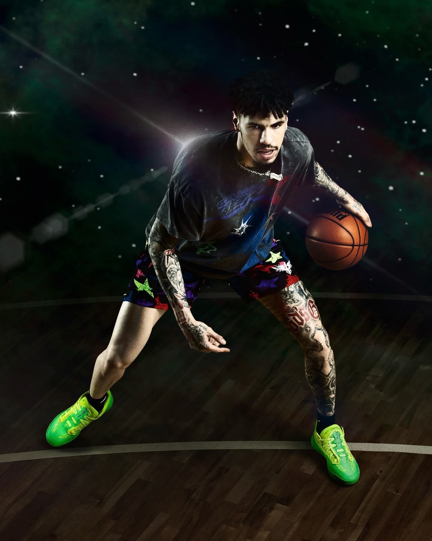 谁懂啊家人们!三球LaMelo Ball第五代PUMA签名鞋MB.05低帮版直接炸场✨ 通体荧光绿+锯齿状鞋身设计,把拉梅洛的个性和球场气场直接拉满! 鞋舌、鞋身的细节设计感拉满,低帮造型更灵动,完全踩中潮流与实战的双需求! 黄蜂队魂的新战靴,这颜值谁看了不迷糊啊!