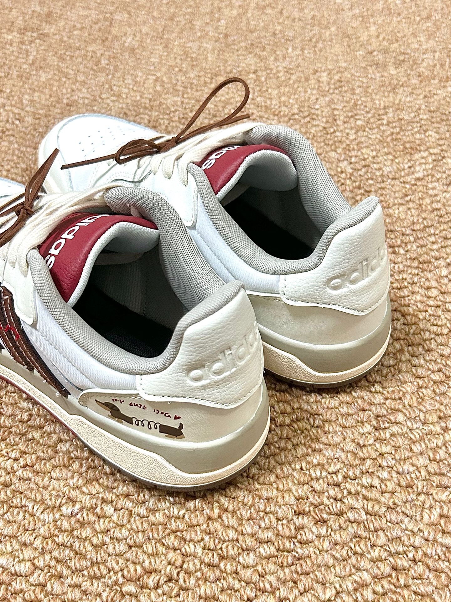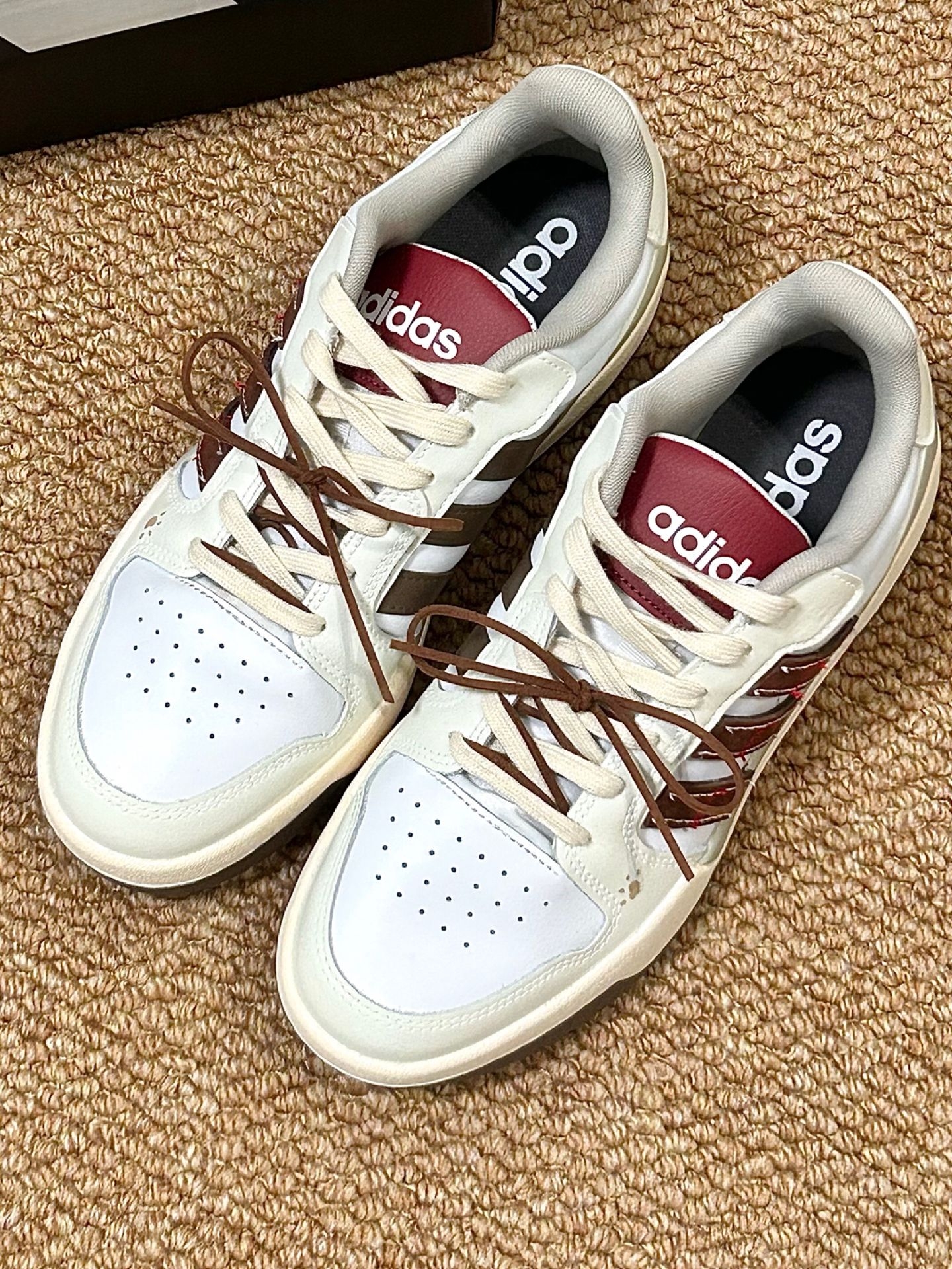 救命!这双阿迪复古板鞋直接封神😭 奶白+焦糖棕+酒红的撞色也太有氛围感了吧 做旧米白底+麂皮三道杠,复古美式感直接拉满 鞋后跟还有超可爱的萌趣小细节,小众不撞款 上脚脚感软糯超舒服,版型正还显脚小 牛仔裤、百褶裙、卫裤随便搭,校园、通勤、约会全hold住 春夏闭眼冲的百搭神鞋,颜值质感双在线💯