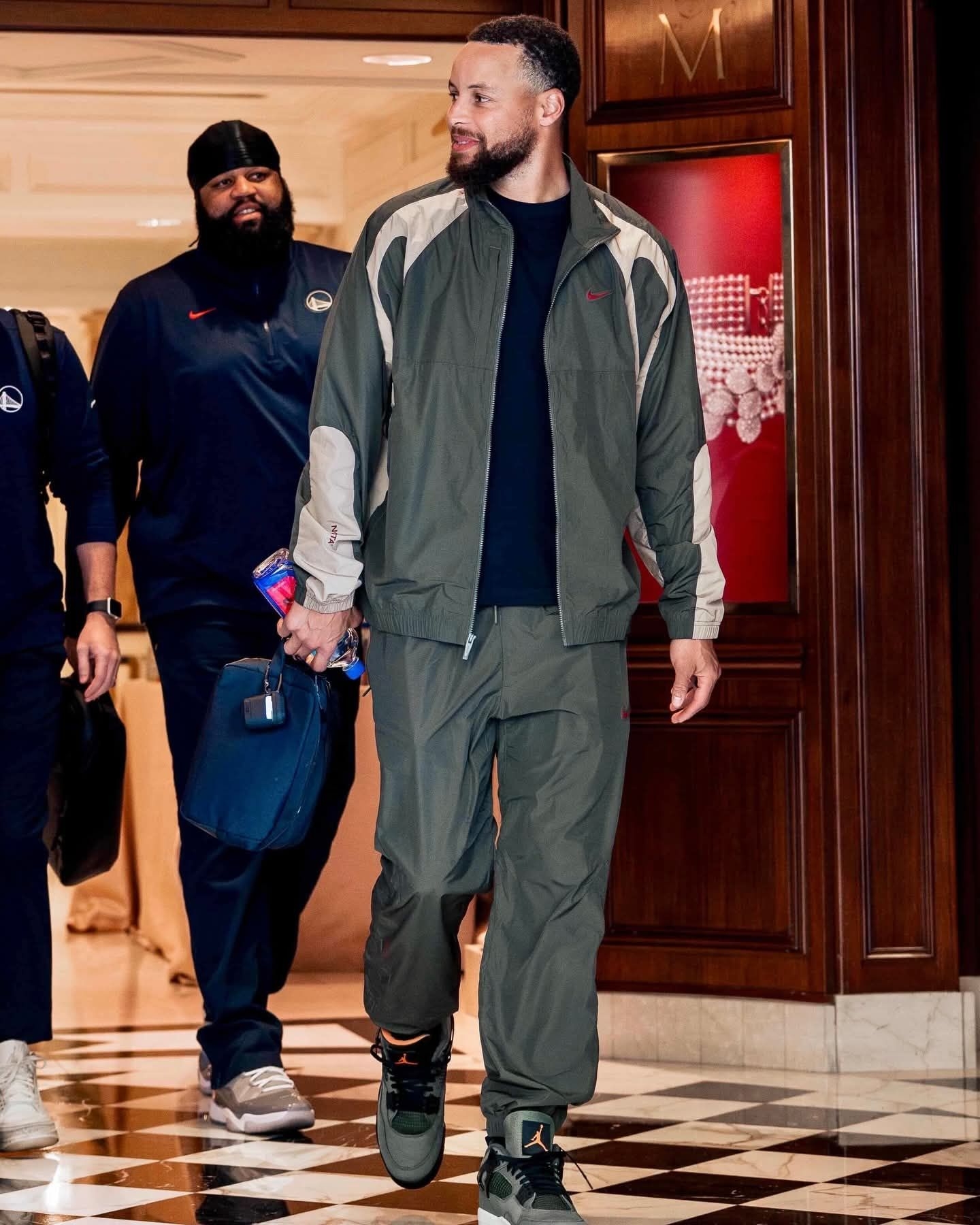 Stephen Curry洛杉矶现身,全套造型堪称潮流教科书! 上装选择Nike x Nocta 25秋冬系列Woven立领夹克,经典军绿与浅卡其的撞色拼接,兼顾机能属性与穿搭质感,立领设计适配多种风格,男生通勤/出街都能穿。 脚下搭配2025款Undefeated x Air Jordan 4联名,延续品牌标志性军绿配色,橙色飞人Logo点亮整体,AJ4经典鞋型+鞋舌“RARE AIR”标识,完...