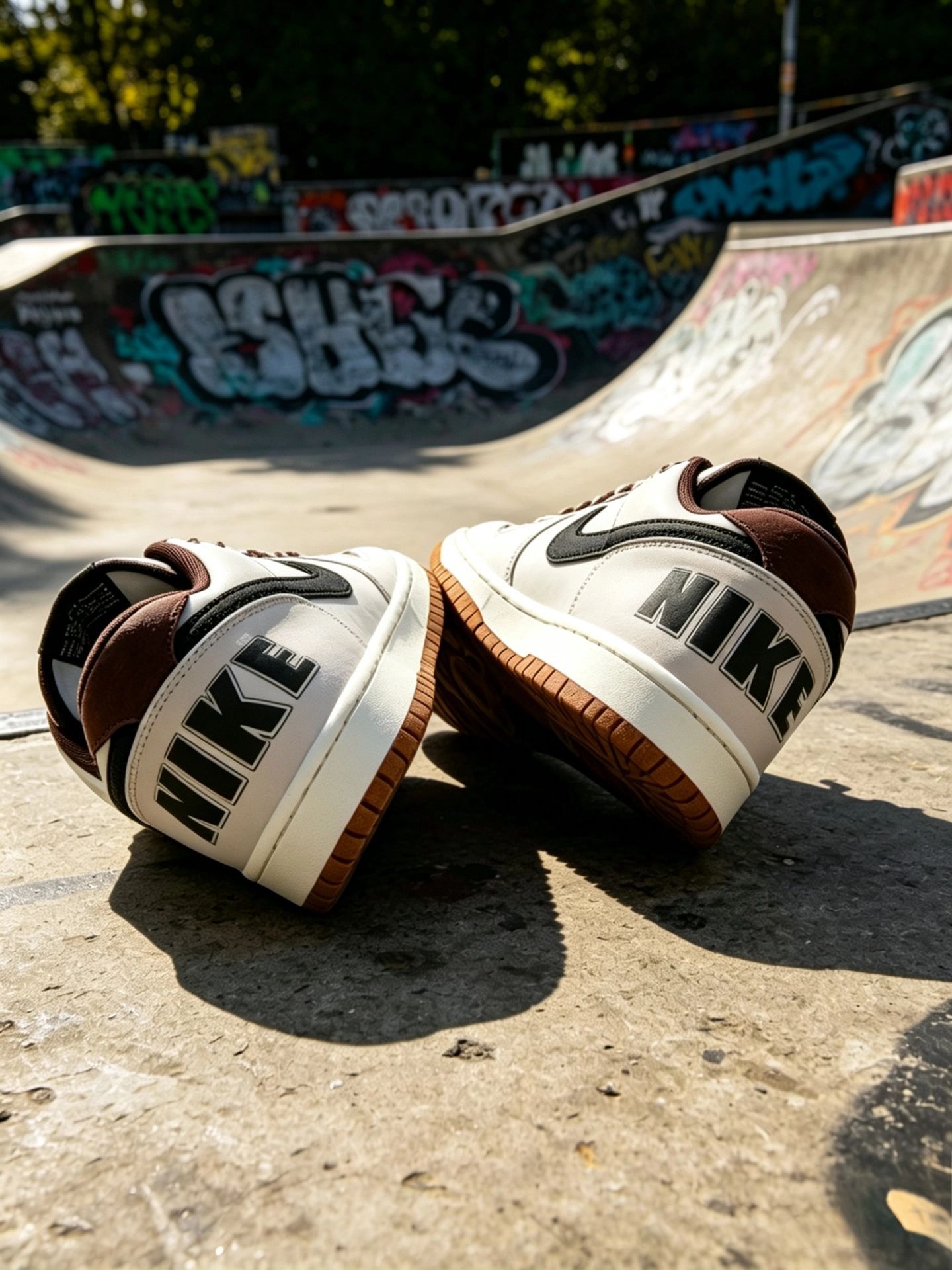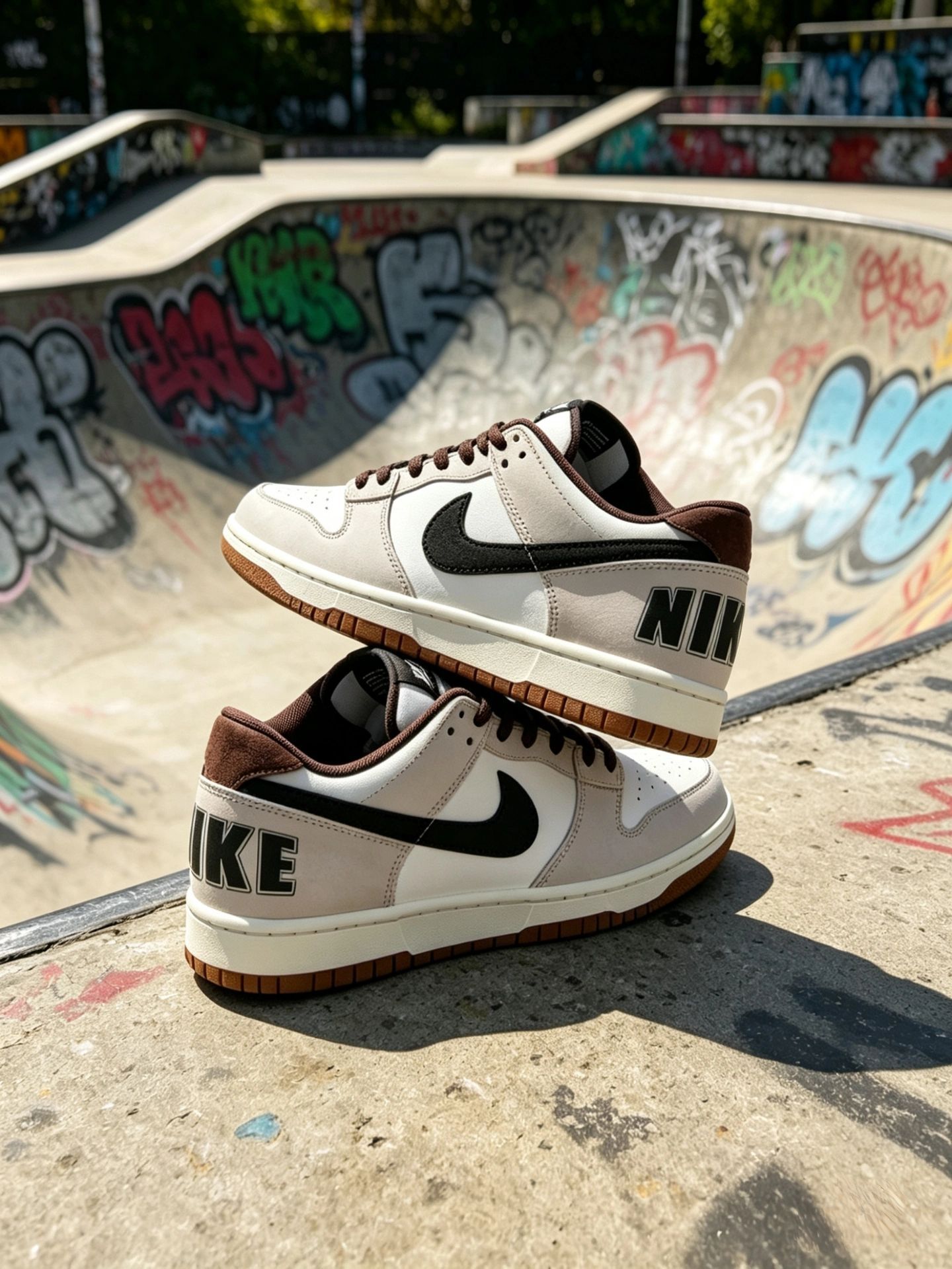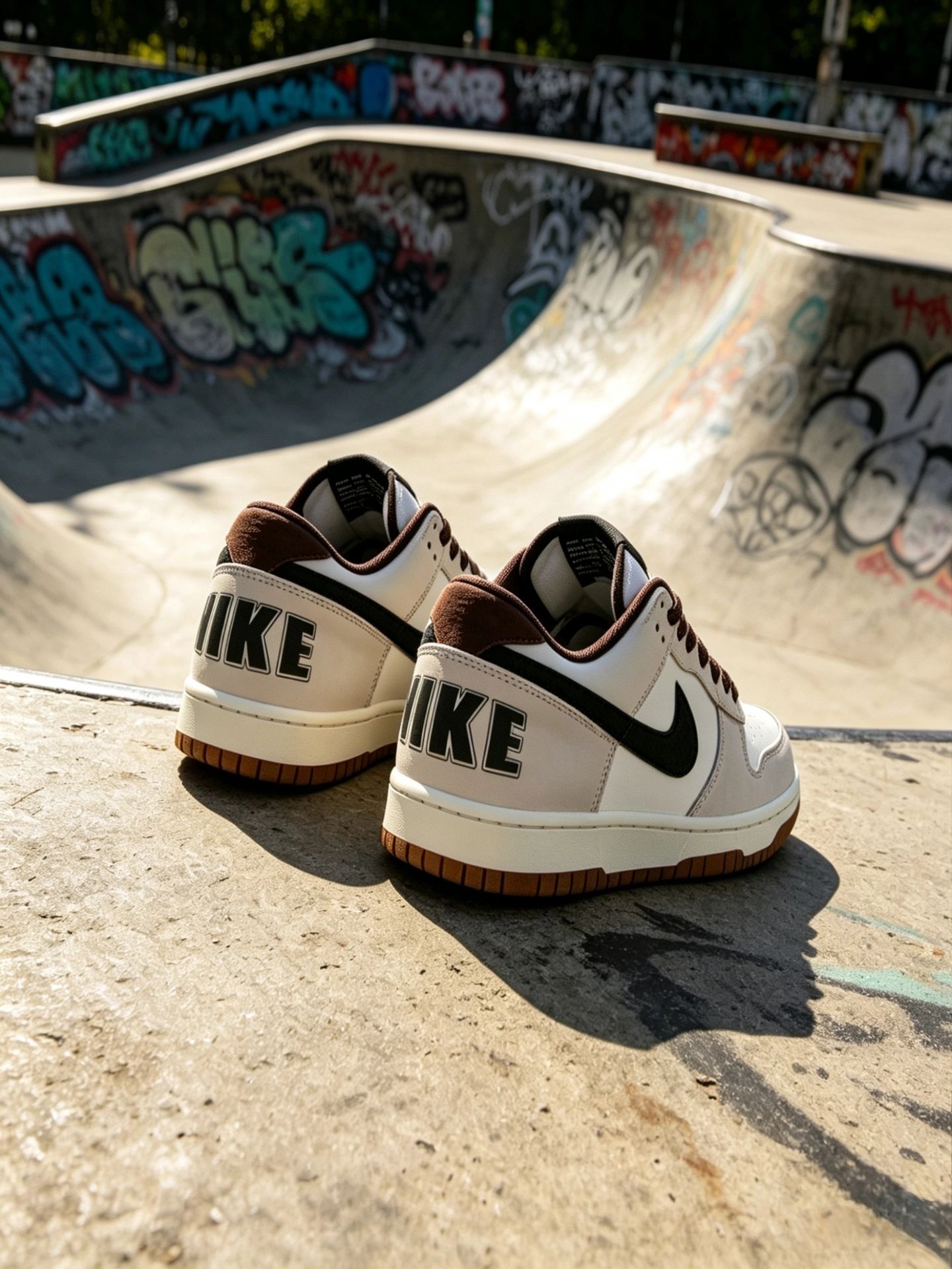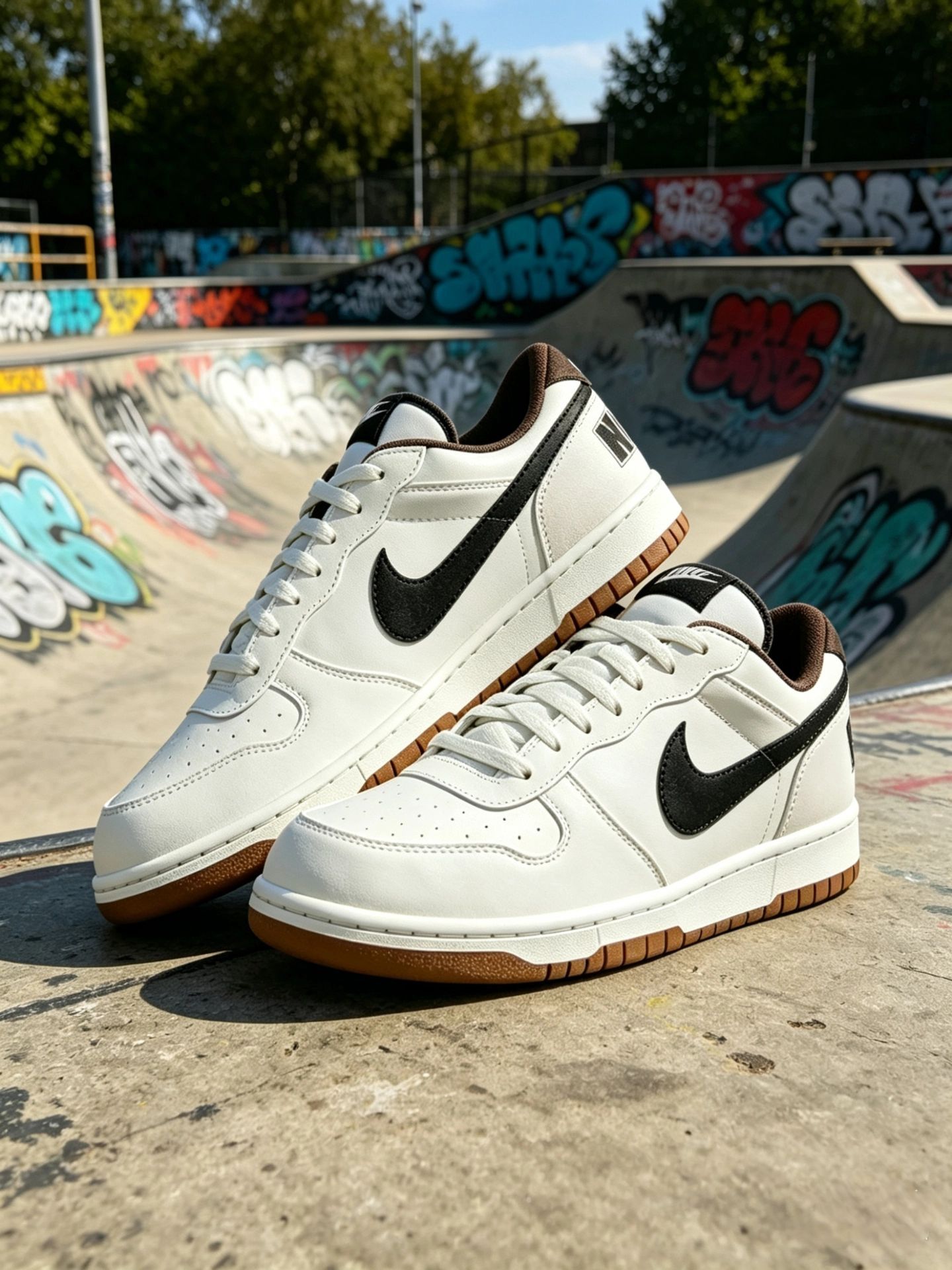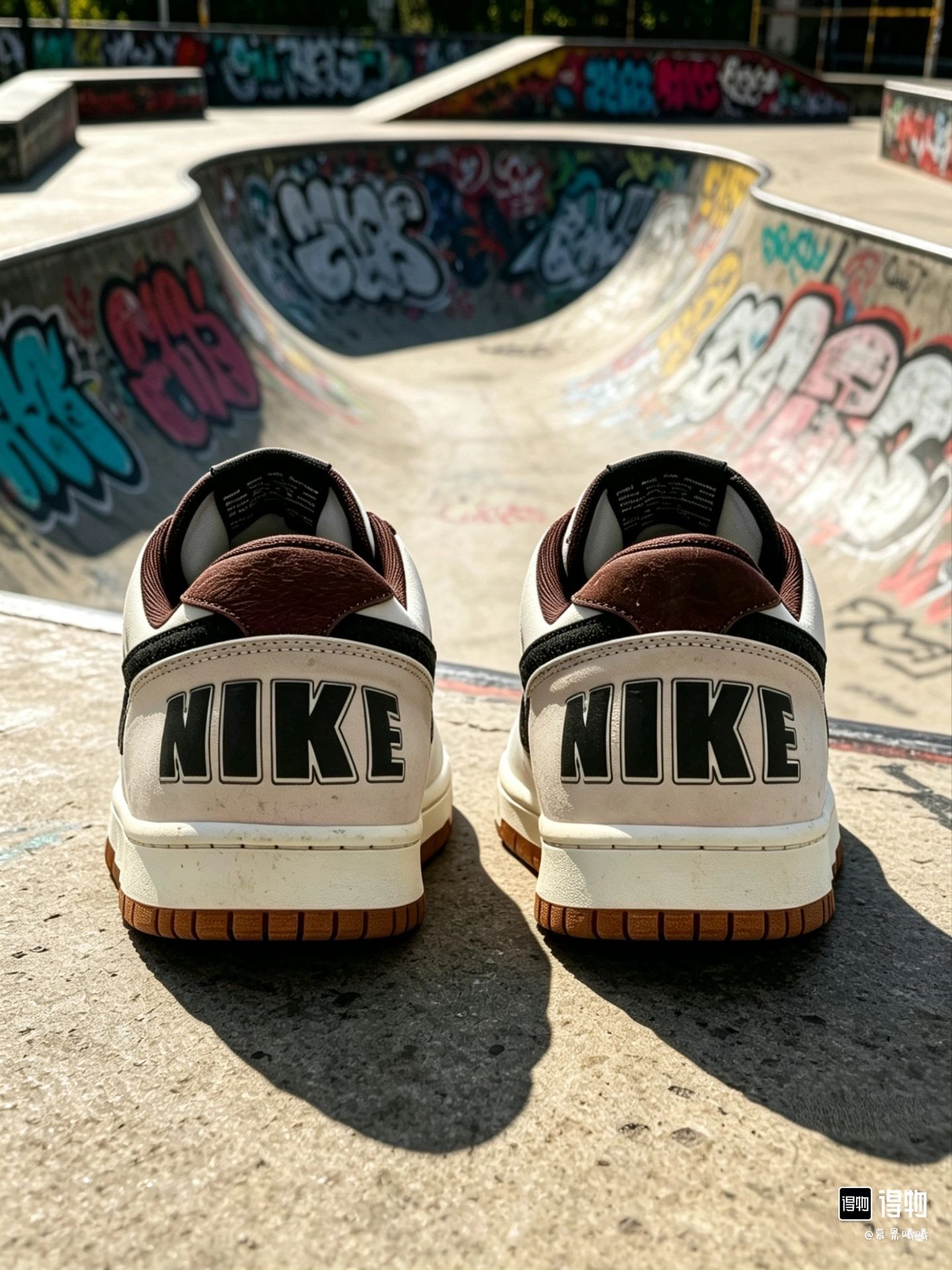 米白+黑钩+生胶底,复古感直接拉满,上脚巨百搭! 鞋后跟的NIKE字母标,在涂鸦板场拍直接出片,细节控狂喜。 皮质质感在线,日常穿或者滑板都能打,脚感也很舒服,完全不压脚。 这波复古风上脚真的帅到没朋友