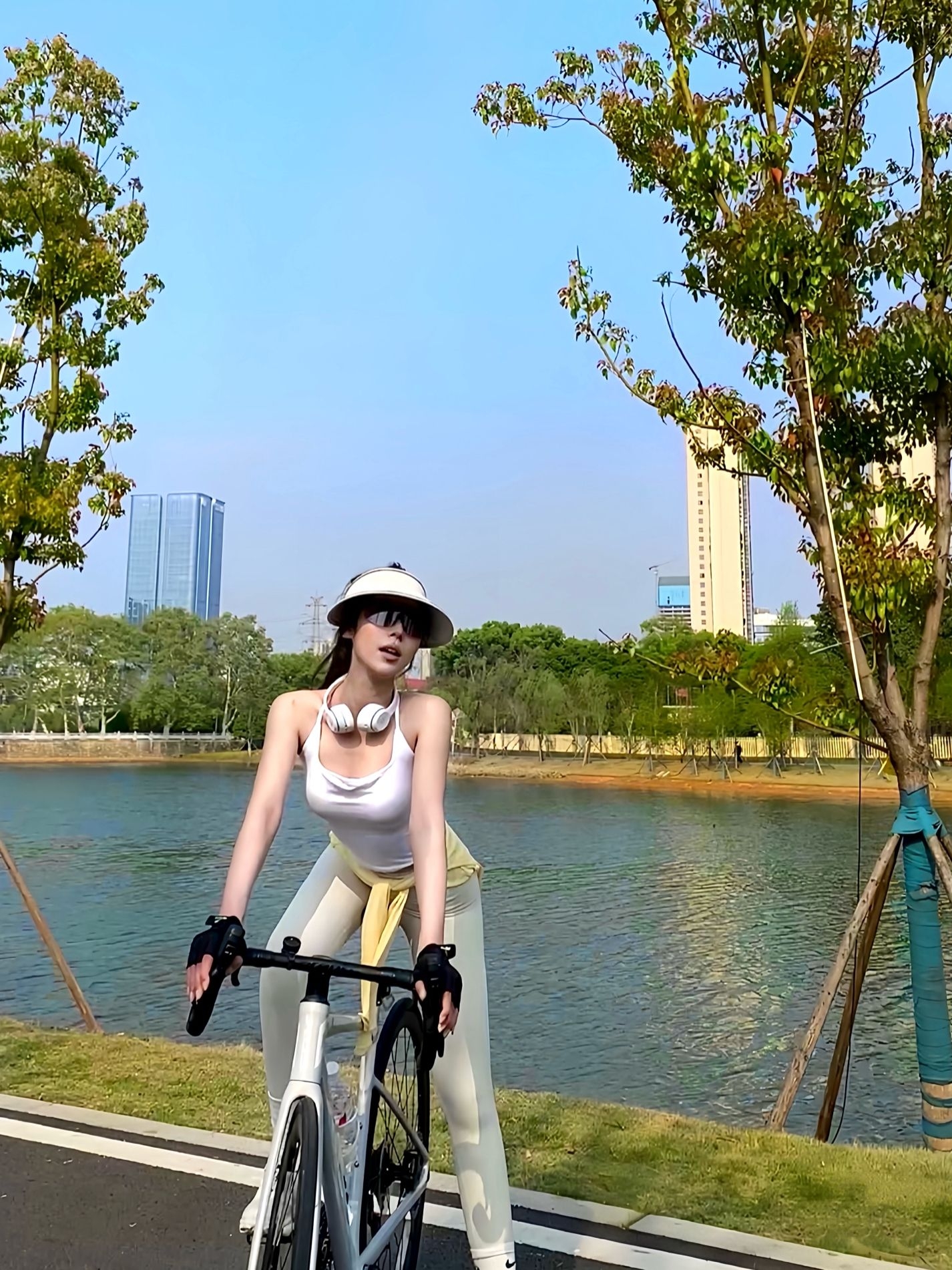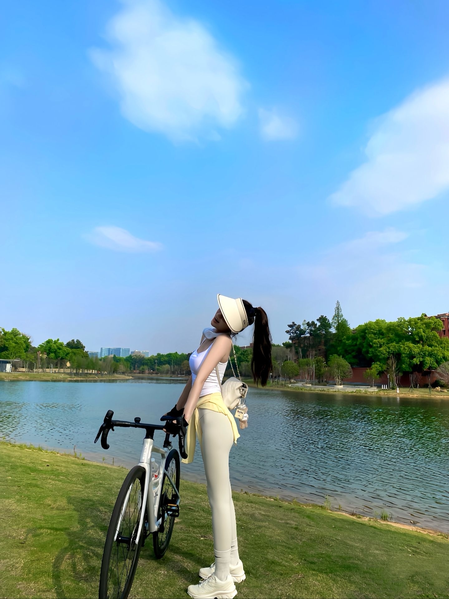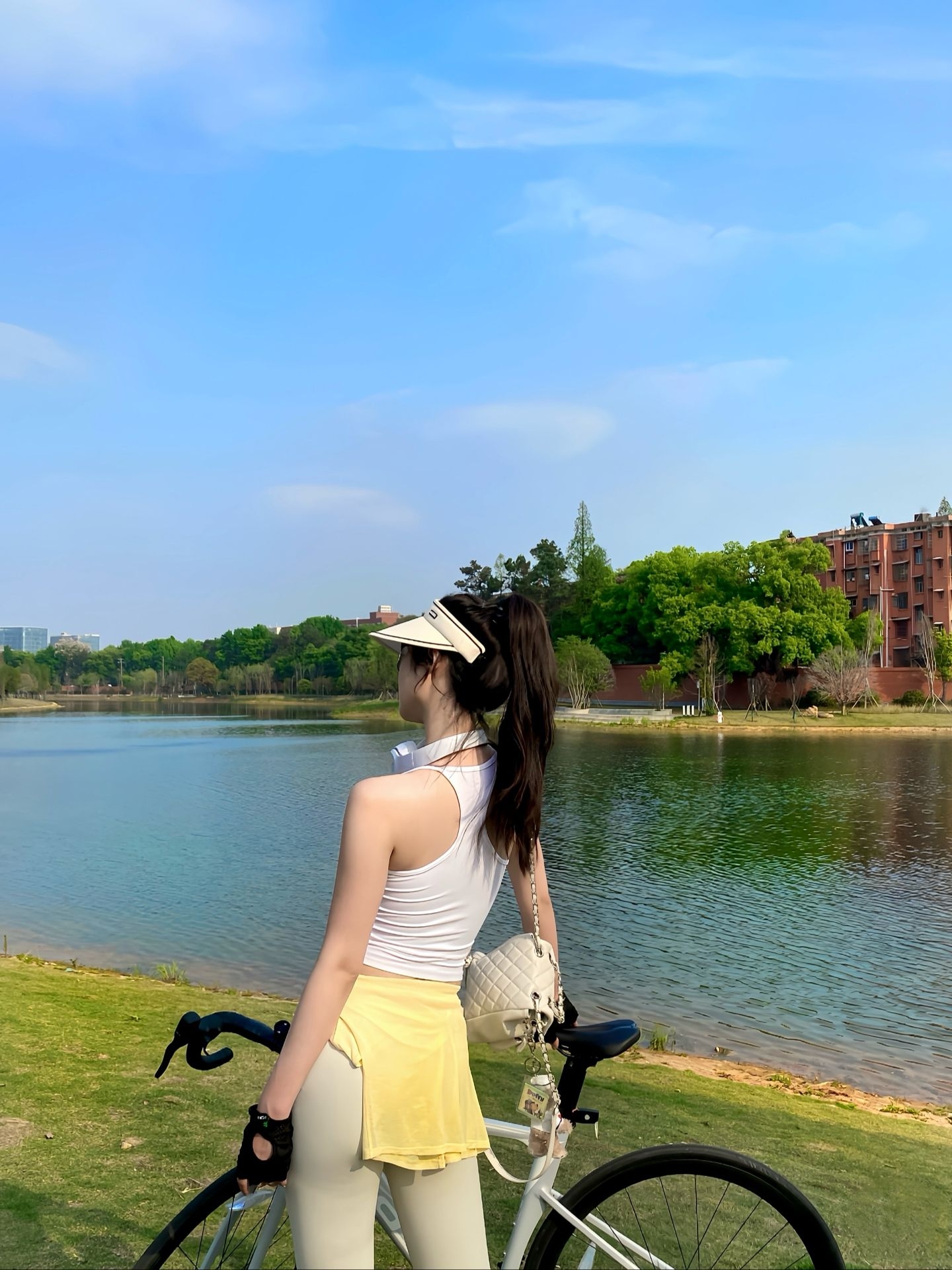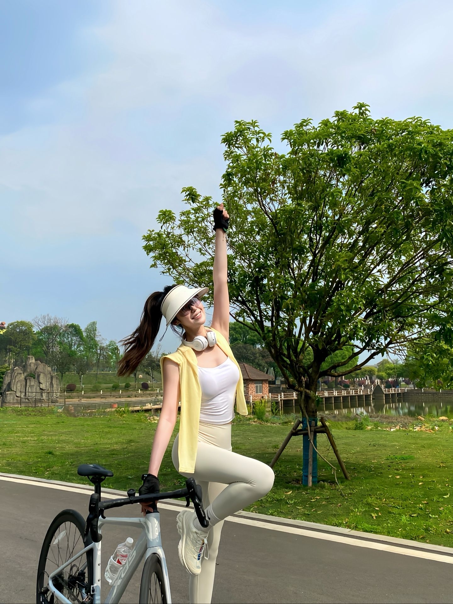 上身的白色无袖运动背心,面料轻薄透气,贴合身形却毫无束缚感,很适合春日里的户外活动。肩带的简约设计清爽利落,骑乘时也不会妨碍肢体伸展。腰间随意系着的浅黄针织衫,不仅呼应了整体的柔和色调,还能应对户外的早晚温差,增添了几分随性的层次感。