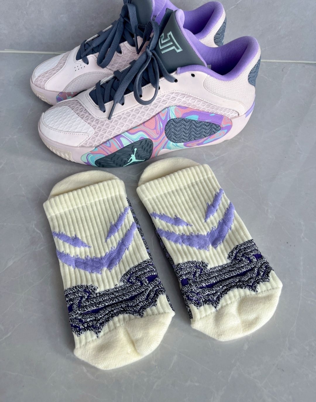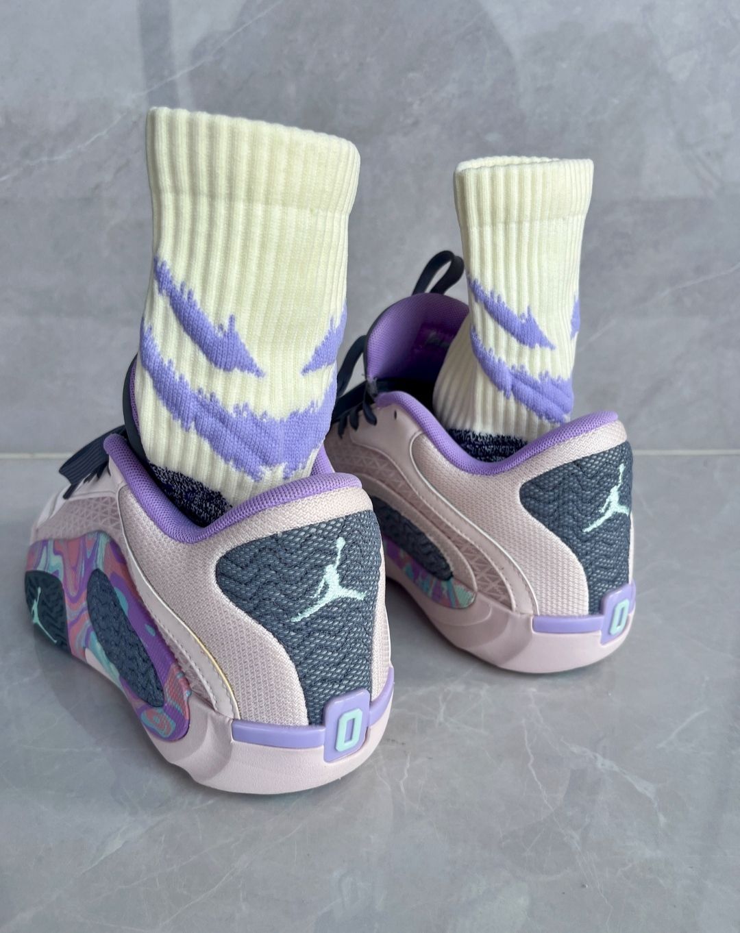 谁懂啊家人们!这双Jordan Tatum 2真的长在审美上了😭 颜值直接拉满 - 淡粉底色+马卡龙晕染,紫/粉/蓝渐变太绝了,甜酷感直接拉满 - 鞋侧经典AJ飞人logo+塔图姆个人标识,细节感拉满 - 低帮造型+网面材质,上脚显脚小,出街穿搭完全不违和 实战性能在线 - 缓震拉满:全掌ZoomX中底,起跳落地完全不震脚 - 抓地力超强:人字纹大底,急停变向不...