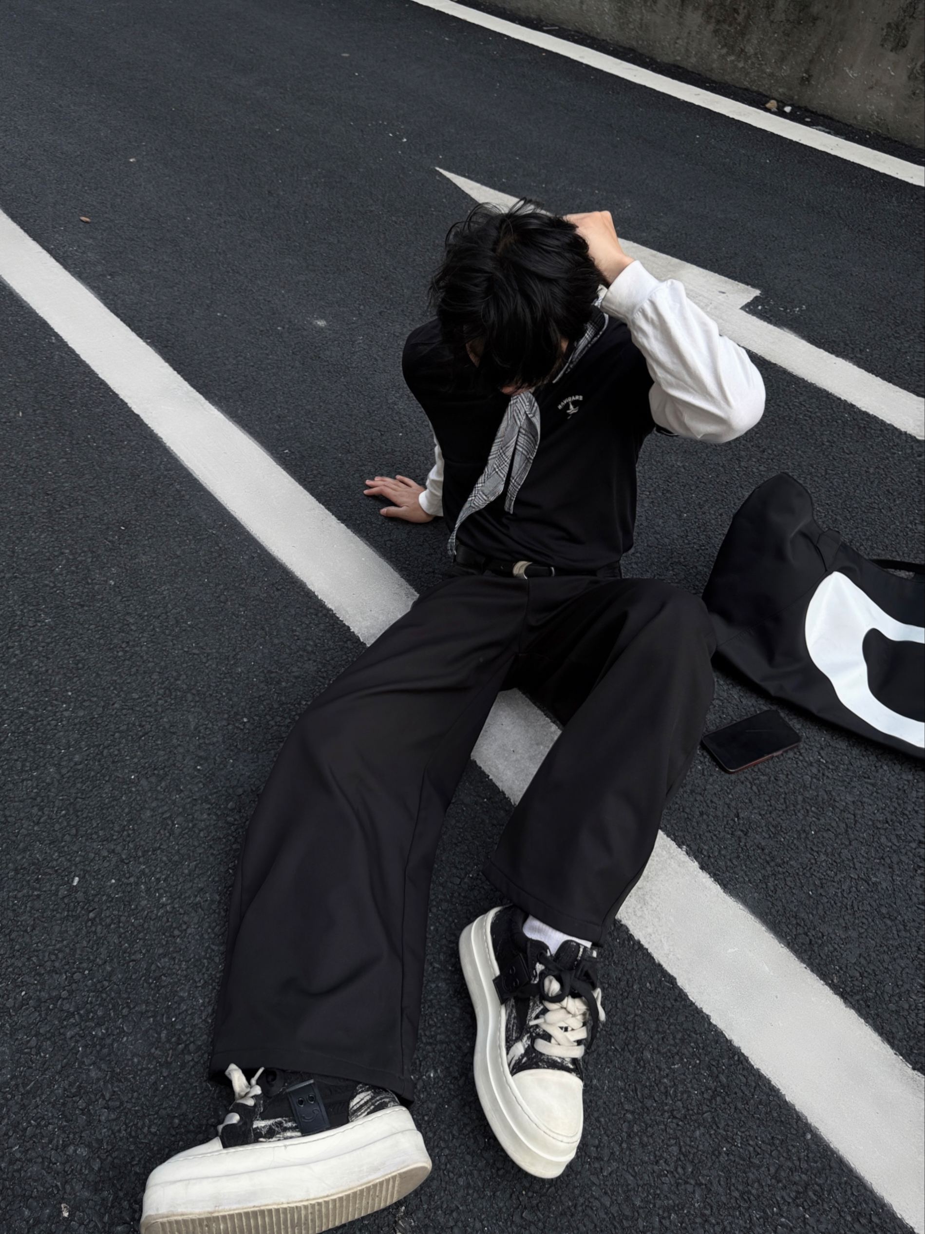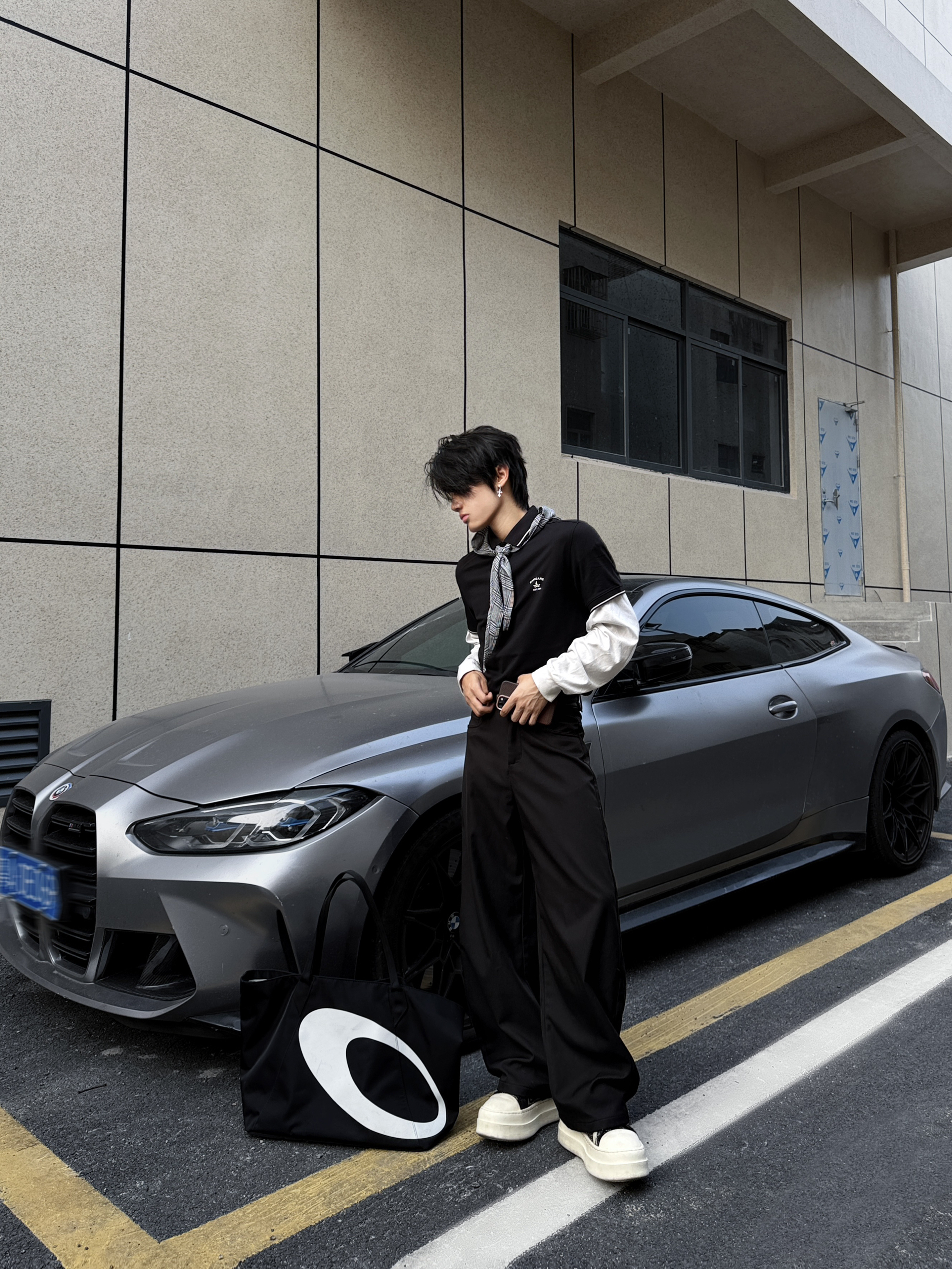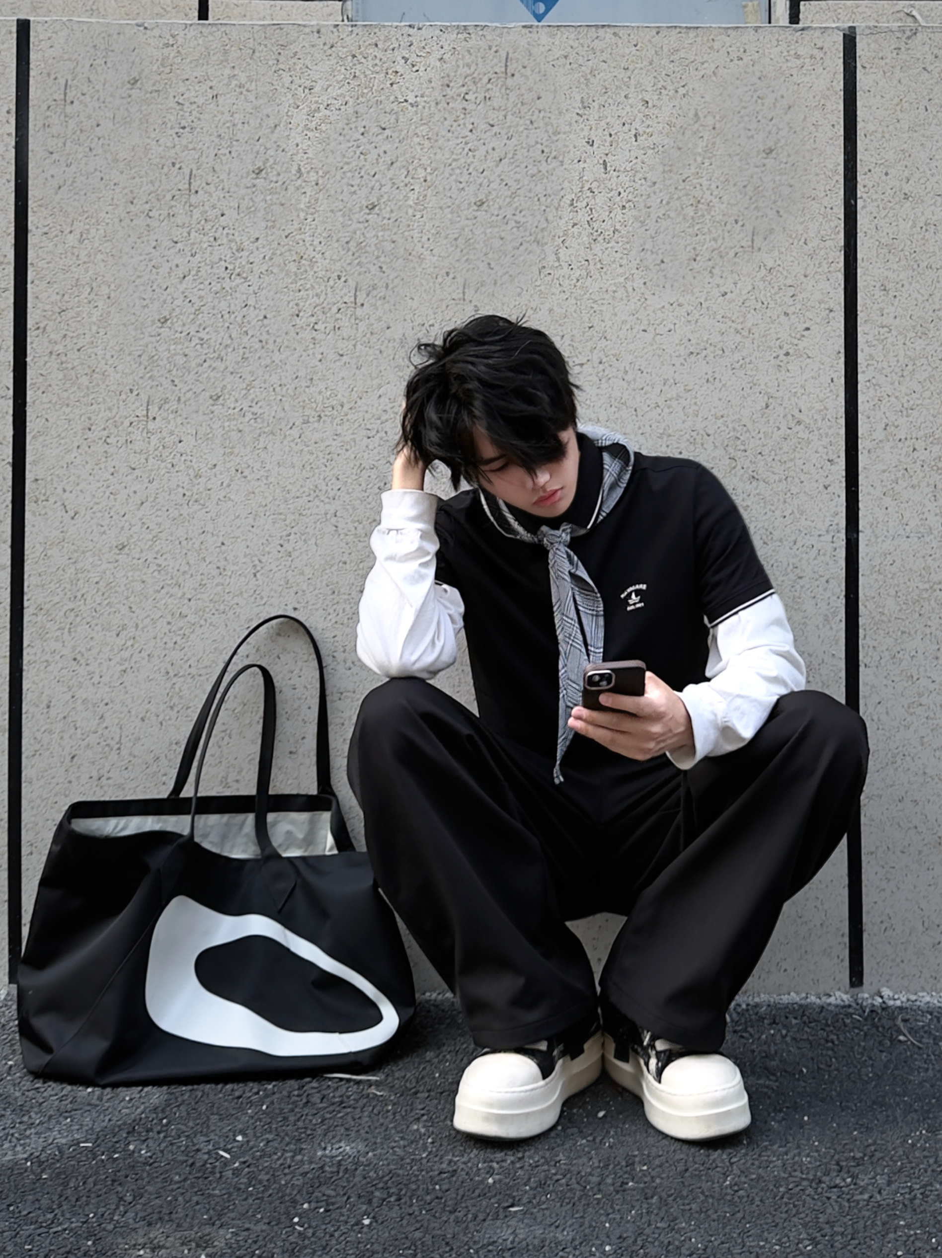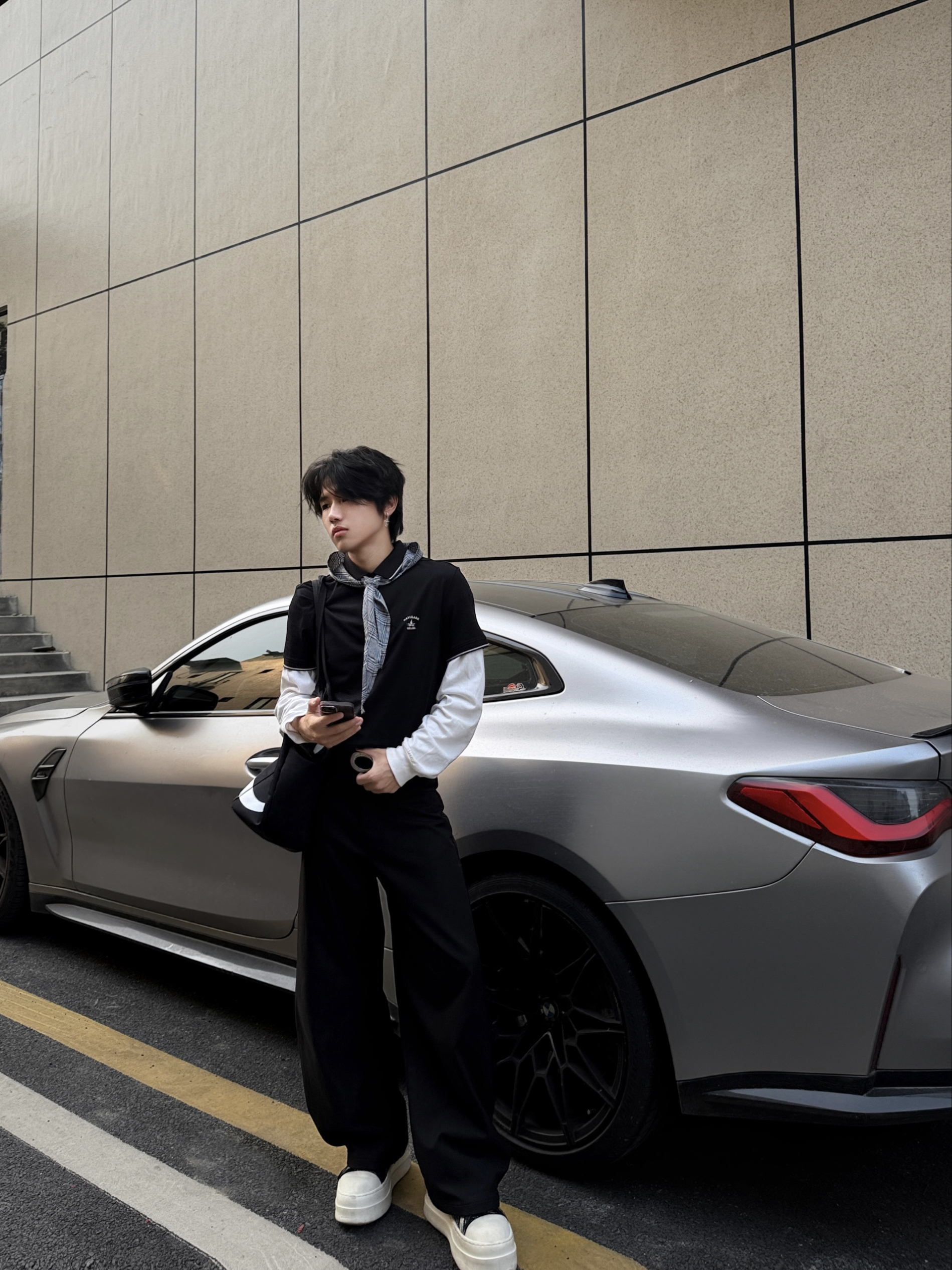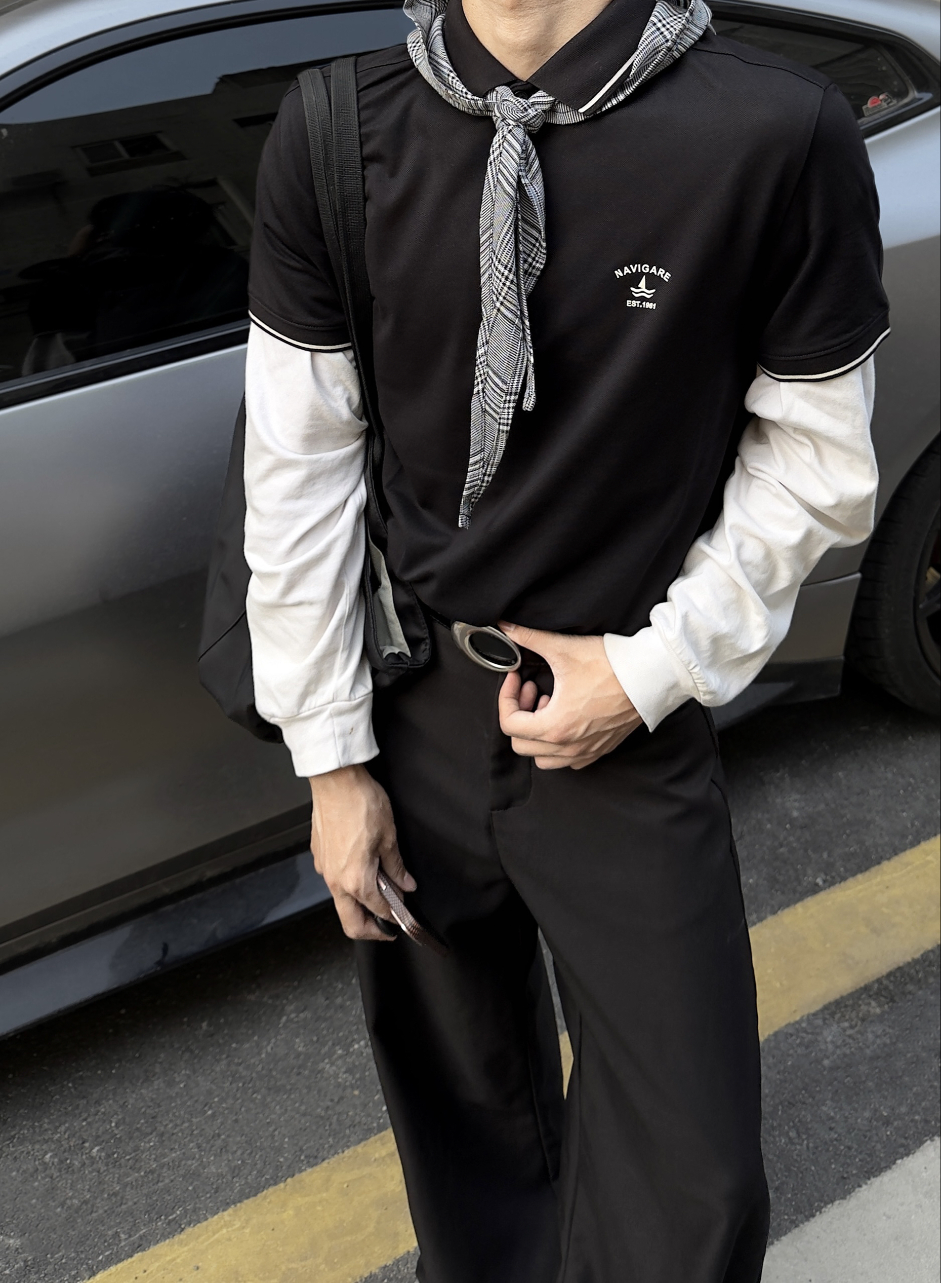 那当然要帅一下了 用一套松弛感穿搭拿捏韩系男主感 我选择叠穿黑白撞色的Polo, 用格纹丝巾做点缀, 瞬间打破基础款的沉闷, 搭配垂感阔腿西裤, 上紧下松的版型直接拉满慵懒氛围, 厚底鞋悄悄增高, 整套不费力却自带高级感, 日常出街、通勤都能穿, 韩系松弛感直接焊在身上