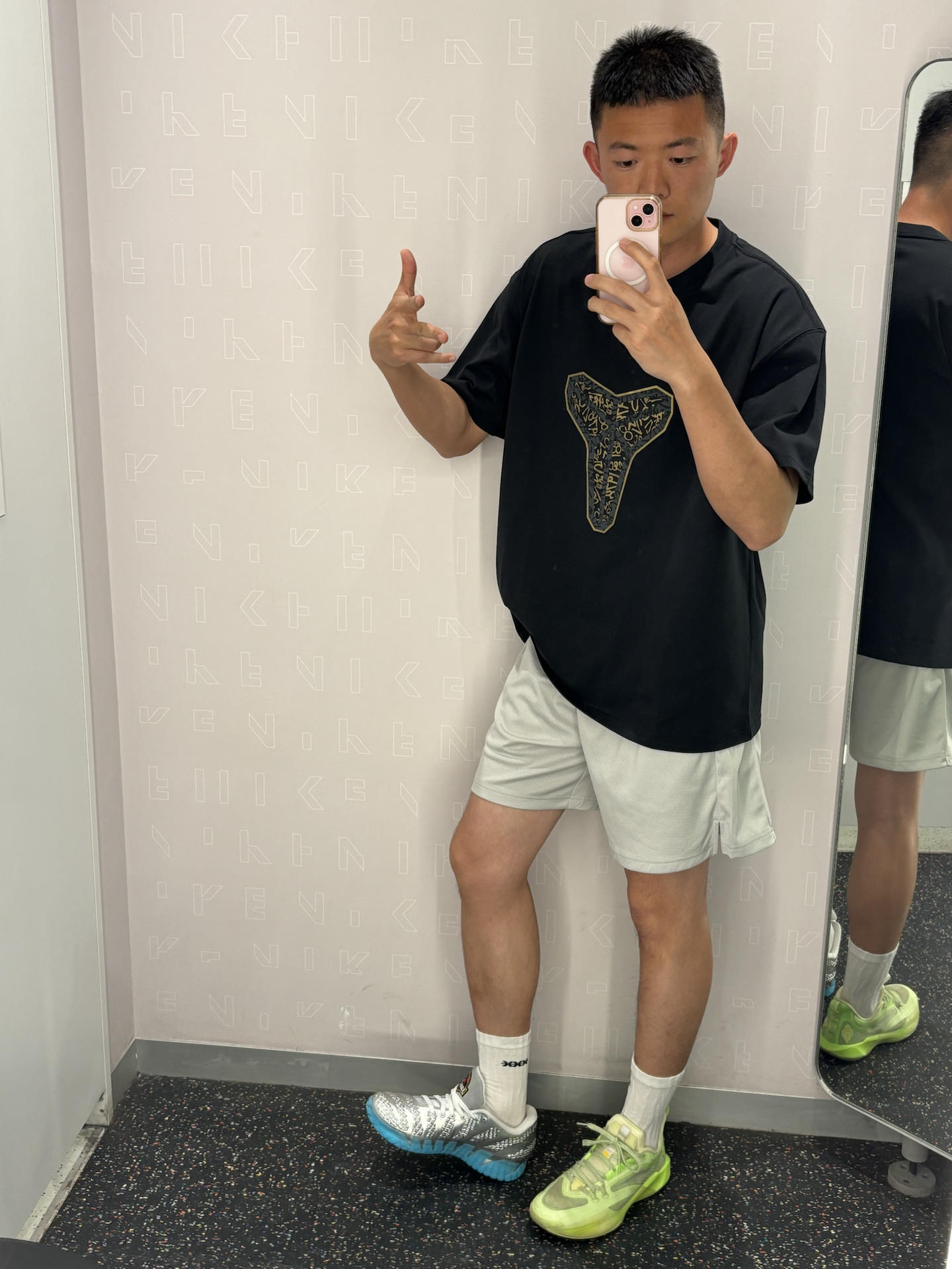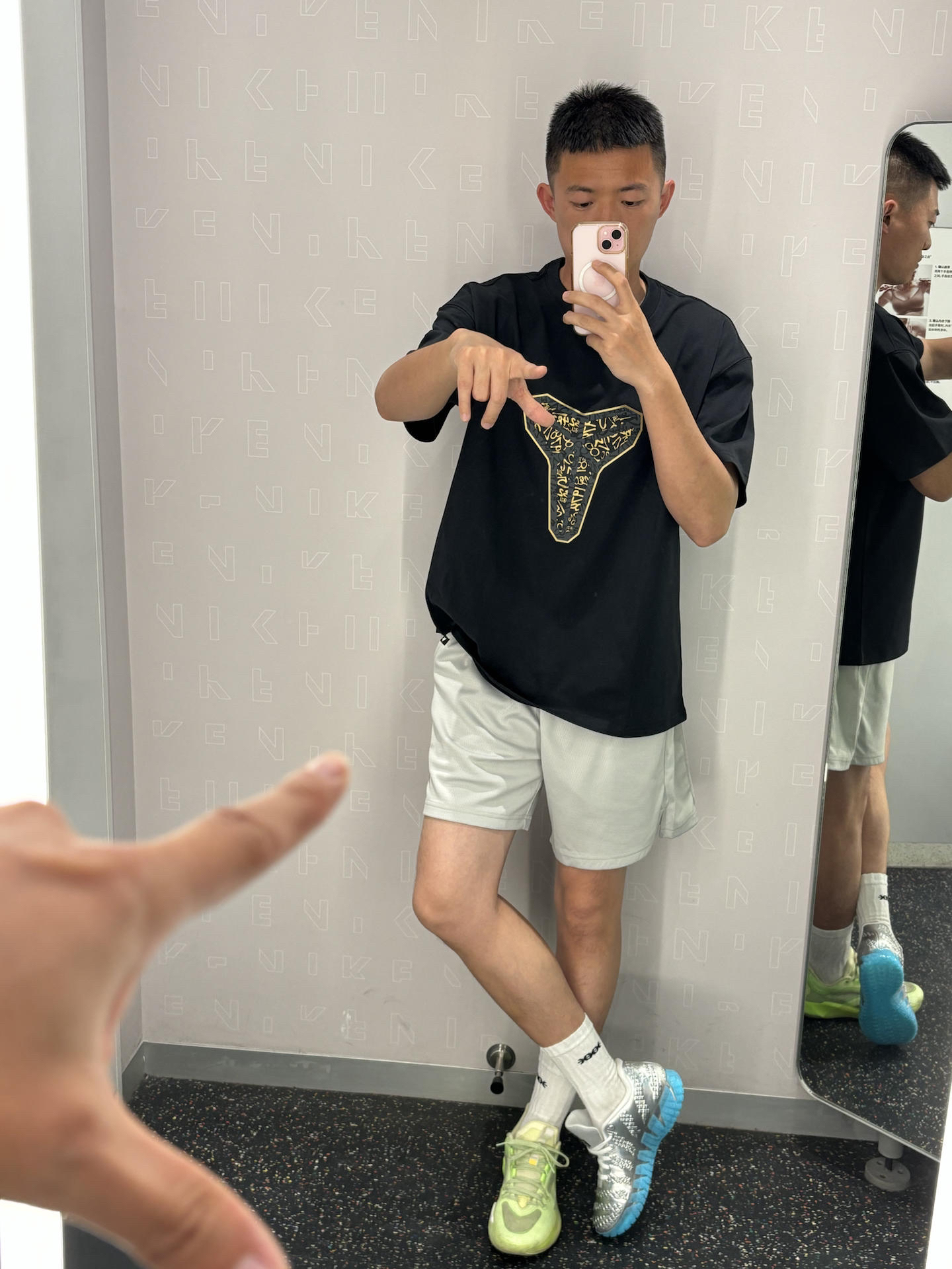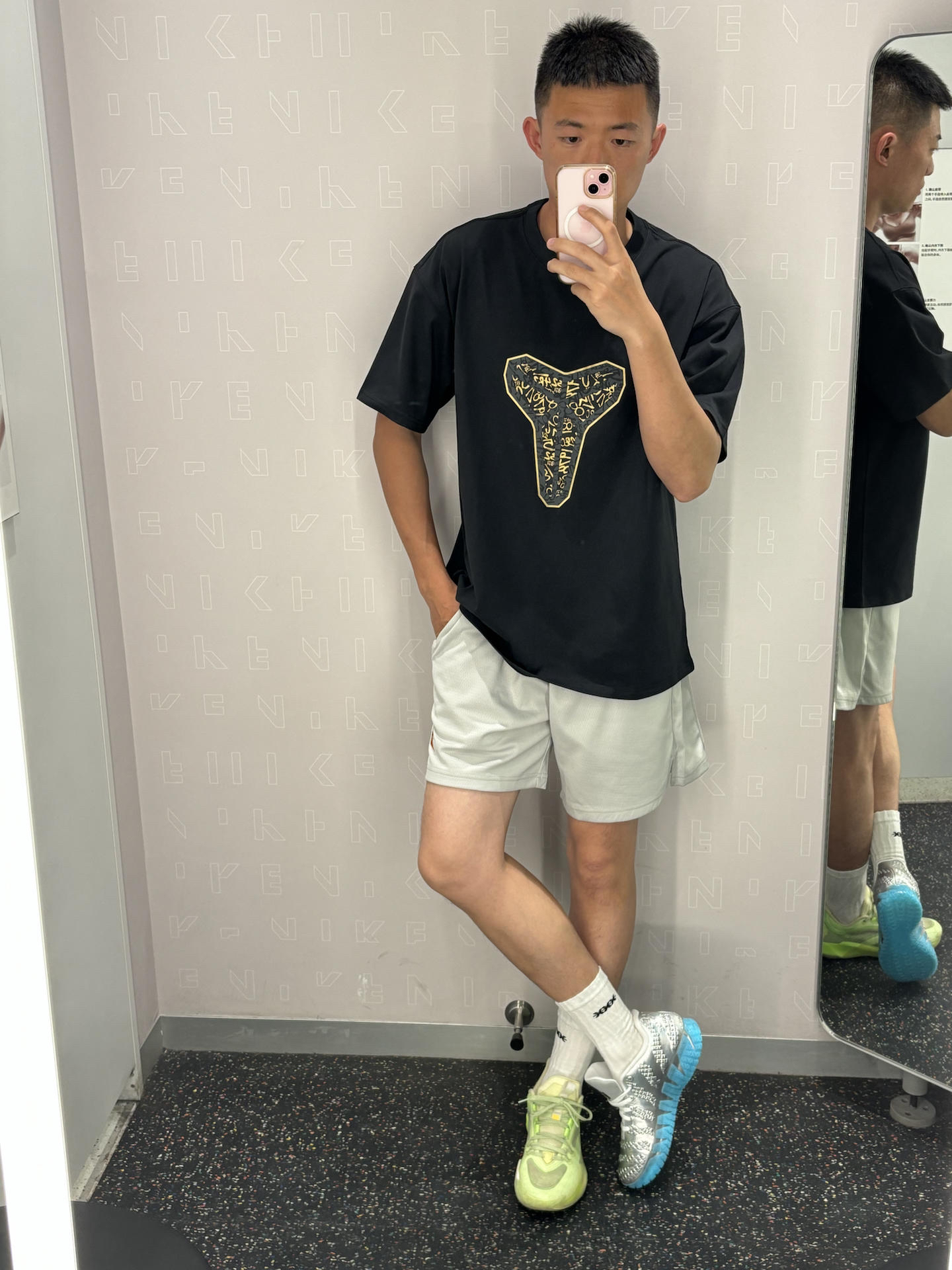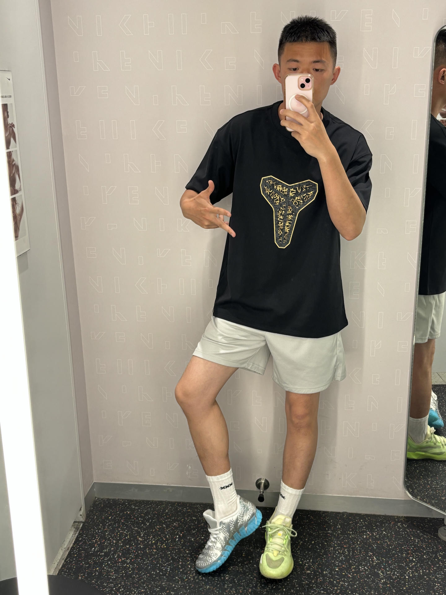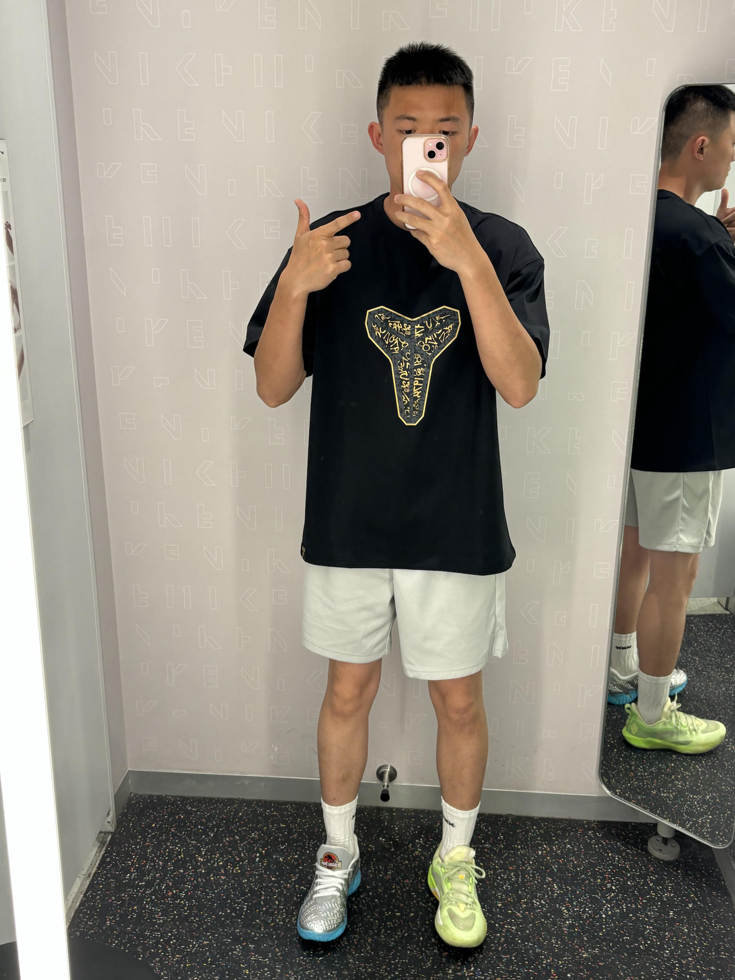 科比球迷的基础穿搭公式 黑+白+灰 上身宽松+下半身失踪+亮色球鞋 黑色科比短袖基础款简单百搭 白灰色短裤显腿长 银色球鞋亮色系点缀球鞋 👔耐克科比曼巴logo短袖 👖uzis 👟莫兰特3银色侏罗纪公园