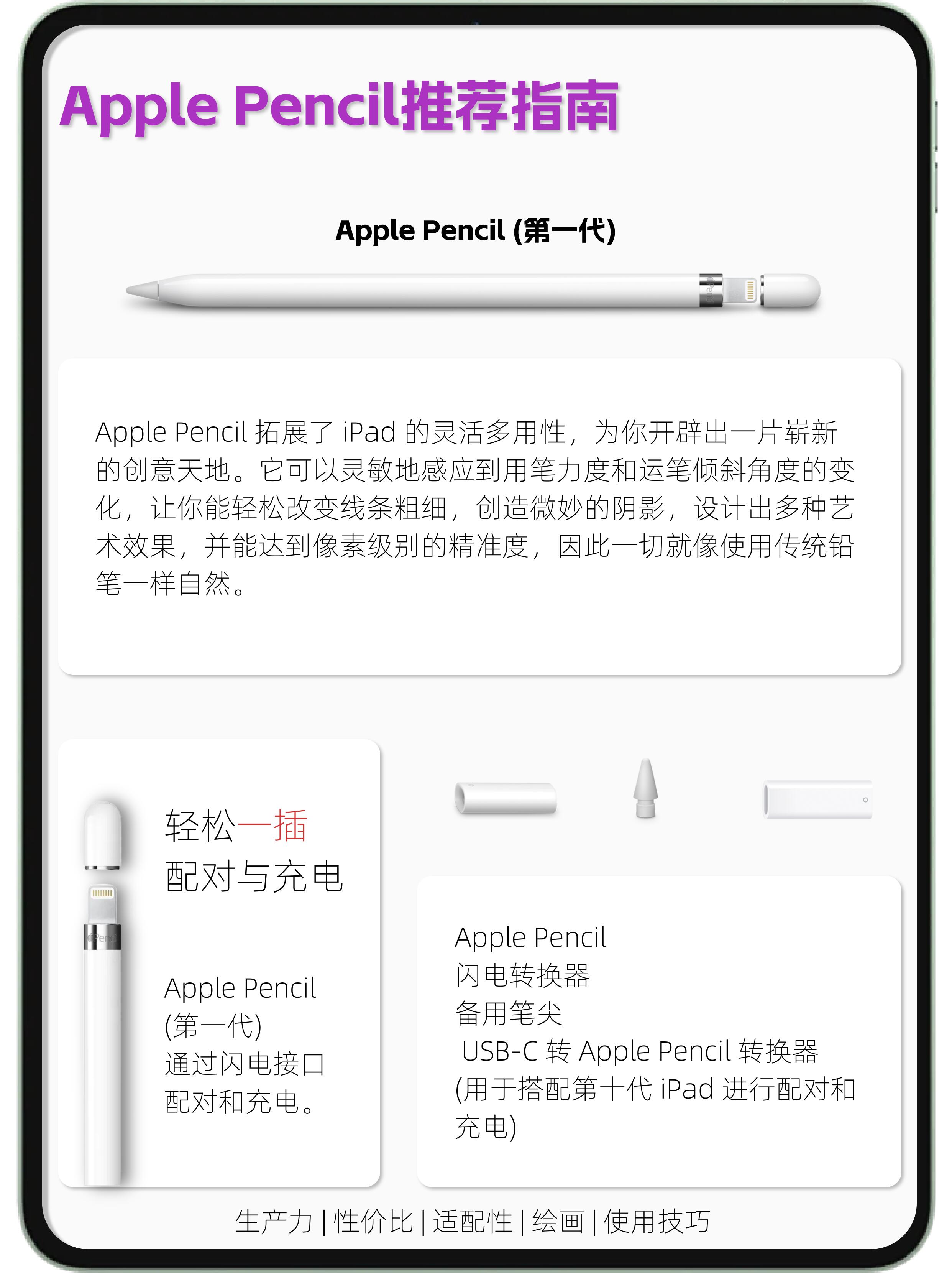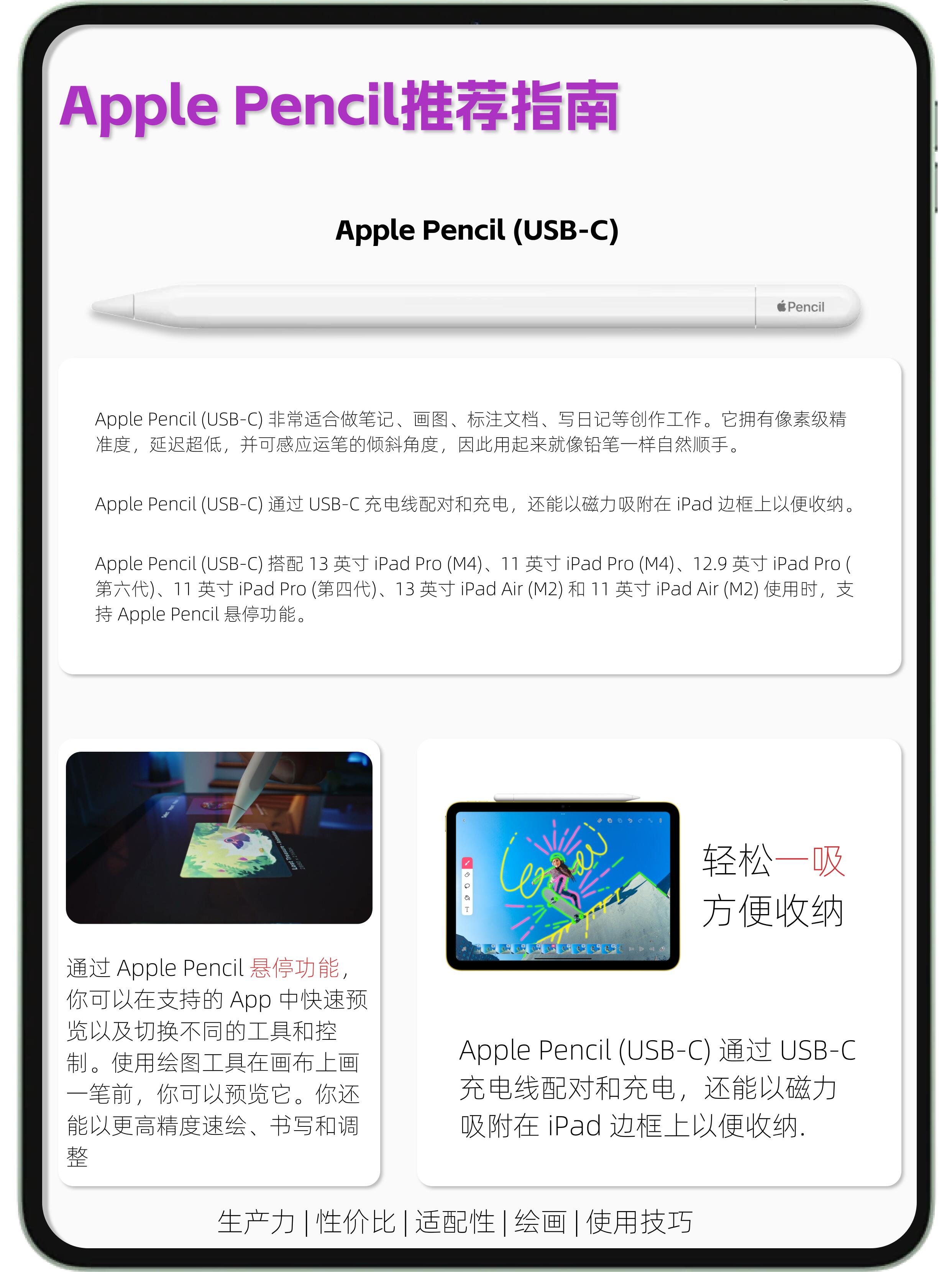 今天整理了4款Apple Pencil的对比,以及适配的ipad机型,相信可以对大家会有所帮助! 选购必知: 1️⃣支持磁吸的iPad不能使用Apple Pencil 一代哦 2️⃣C口版,除了Lightning接口的老款iPad,其它iPad都能用; 3️⃣只是用来无纸化学习的话,选择一代或者USB-C就可以啦~ 4️⃣如果有画画需求,不要选USB-C的,这个没有压力感应;专业画画,建议选Pro...
