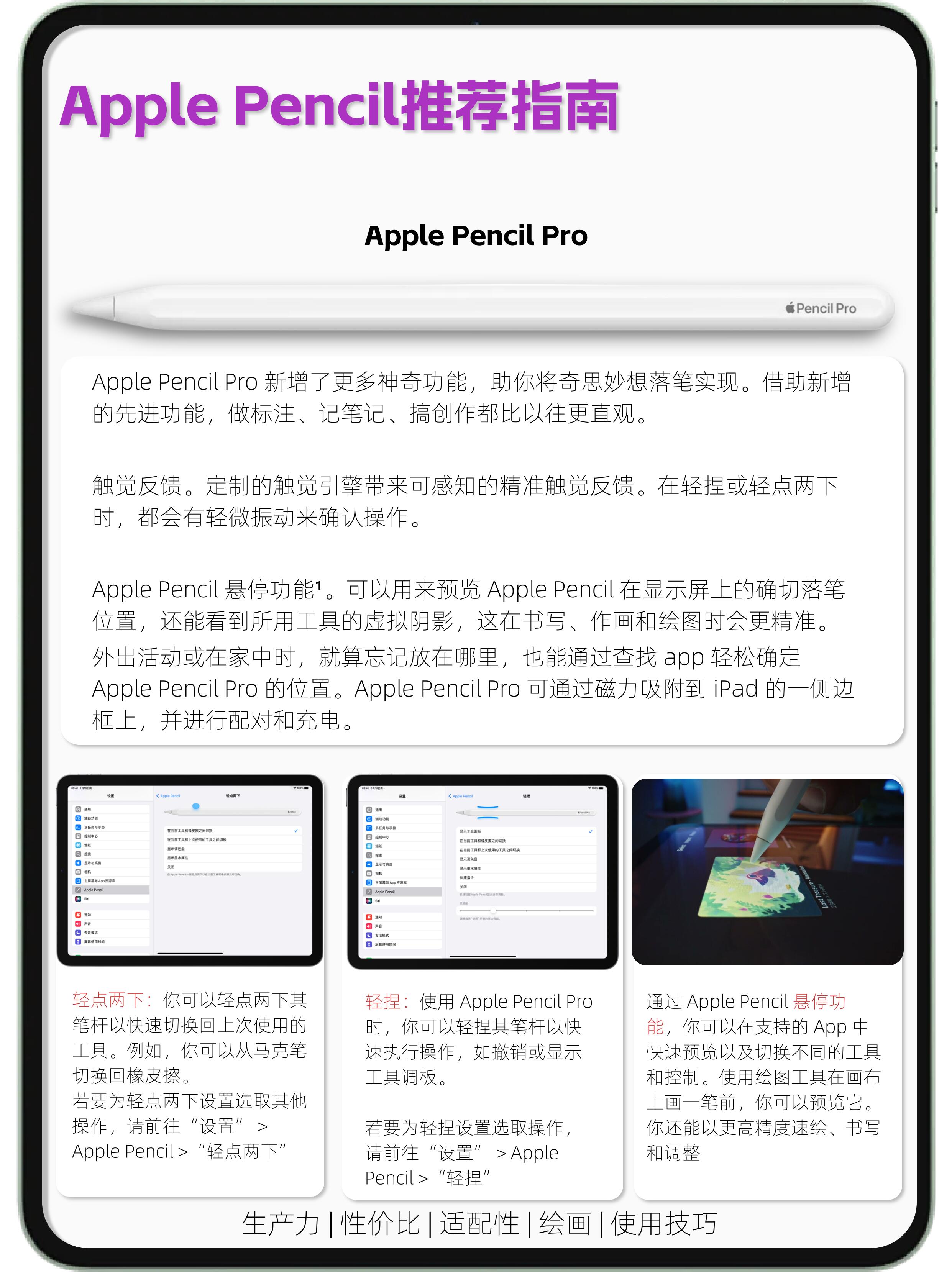 本篇笔记关联了Apple/苹果 Apple Pencil二代 触控笔 适用于ipad mini/air/pro 高度灵敏 格外精准 压感 ipencil 国行、Apple/苹果 Apple pencil USB-C款 电容笔手写触控笔 平板可磁吸 iPencil 白色、Apple/苹果 Apple Pencil Pro 触控笔手写笔 适配M4 书写流畅 iPencil 白色等商品,为用户提供真实的使用体验和购买参考。