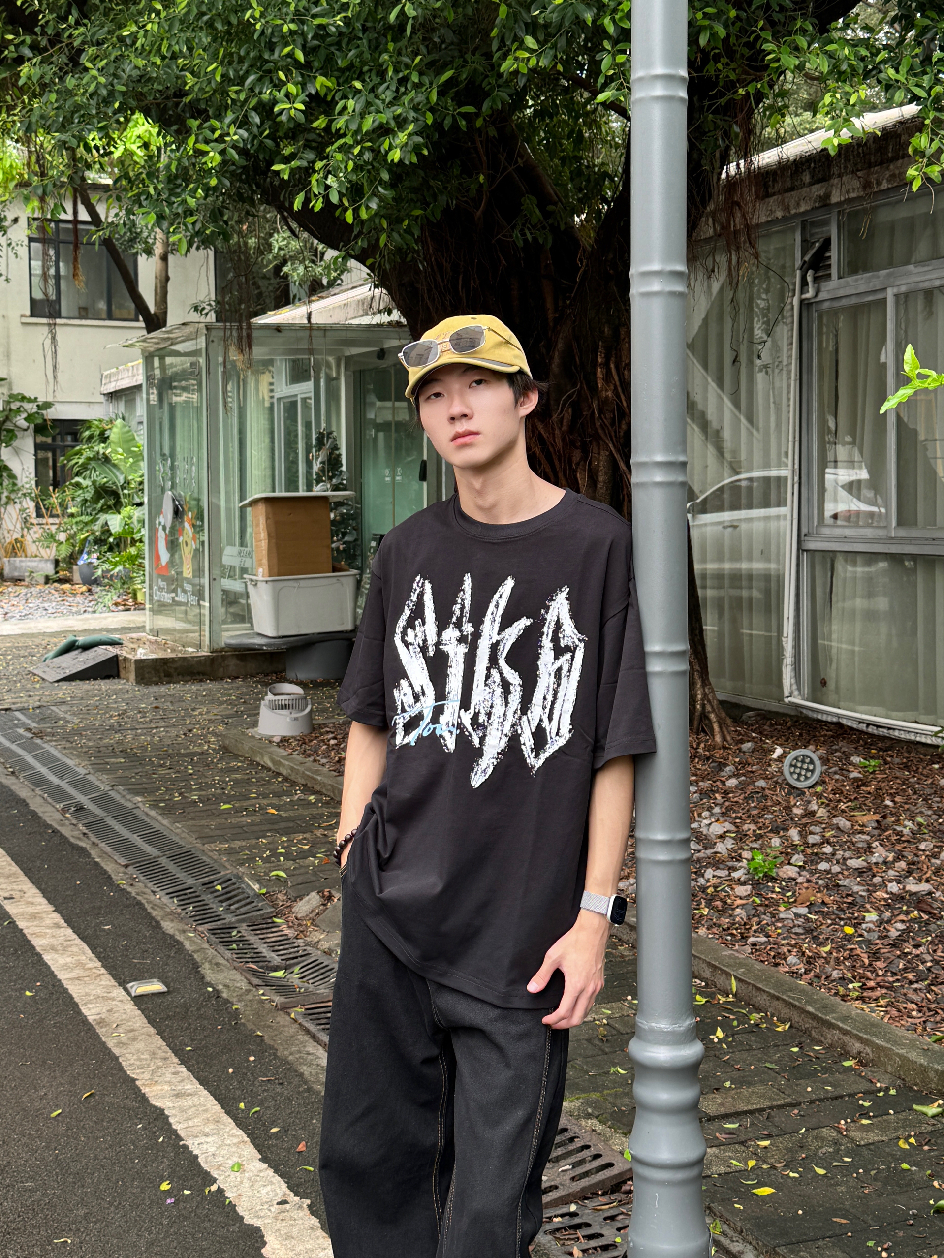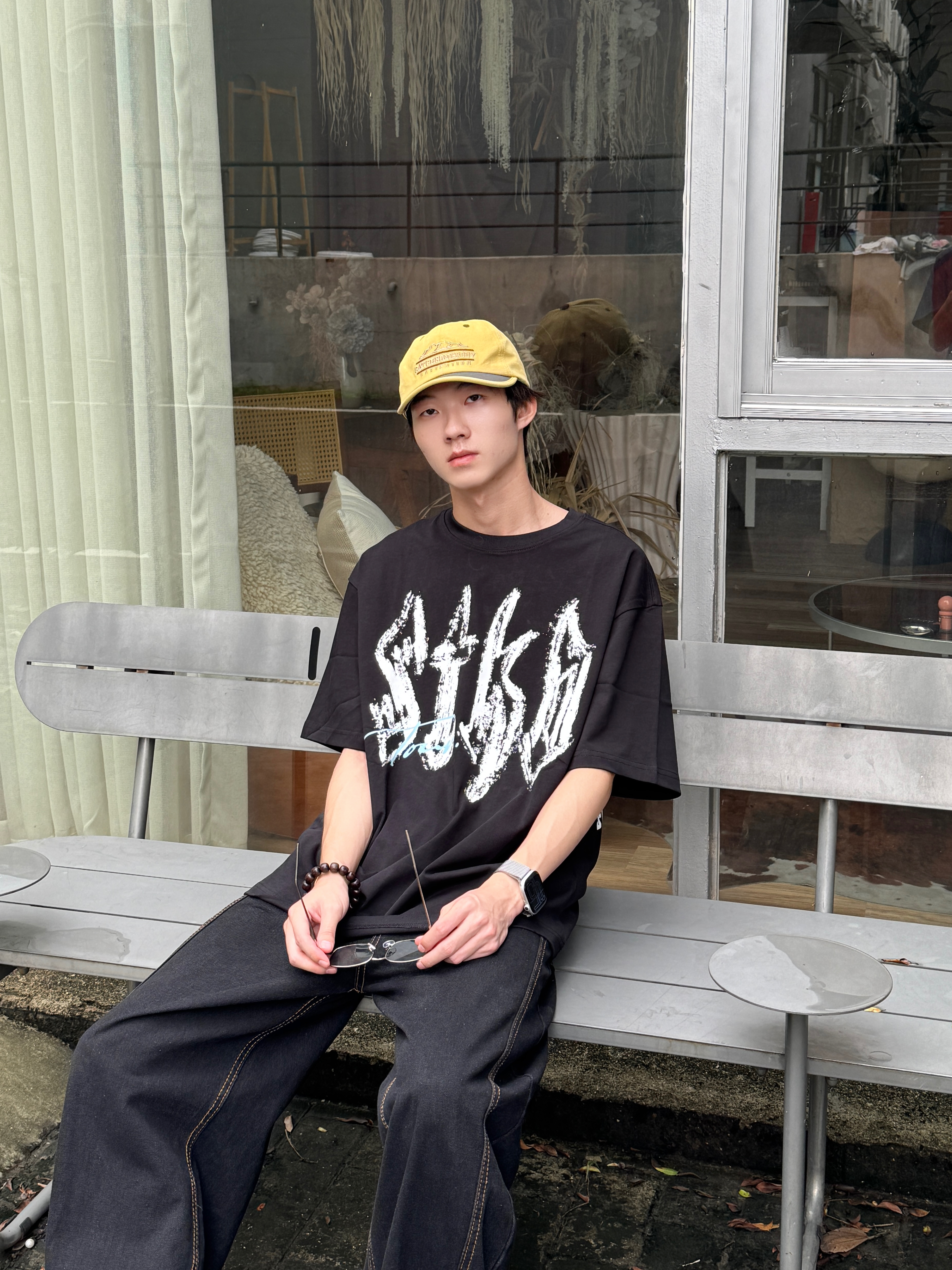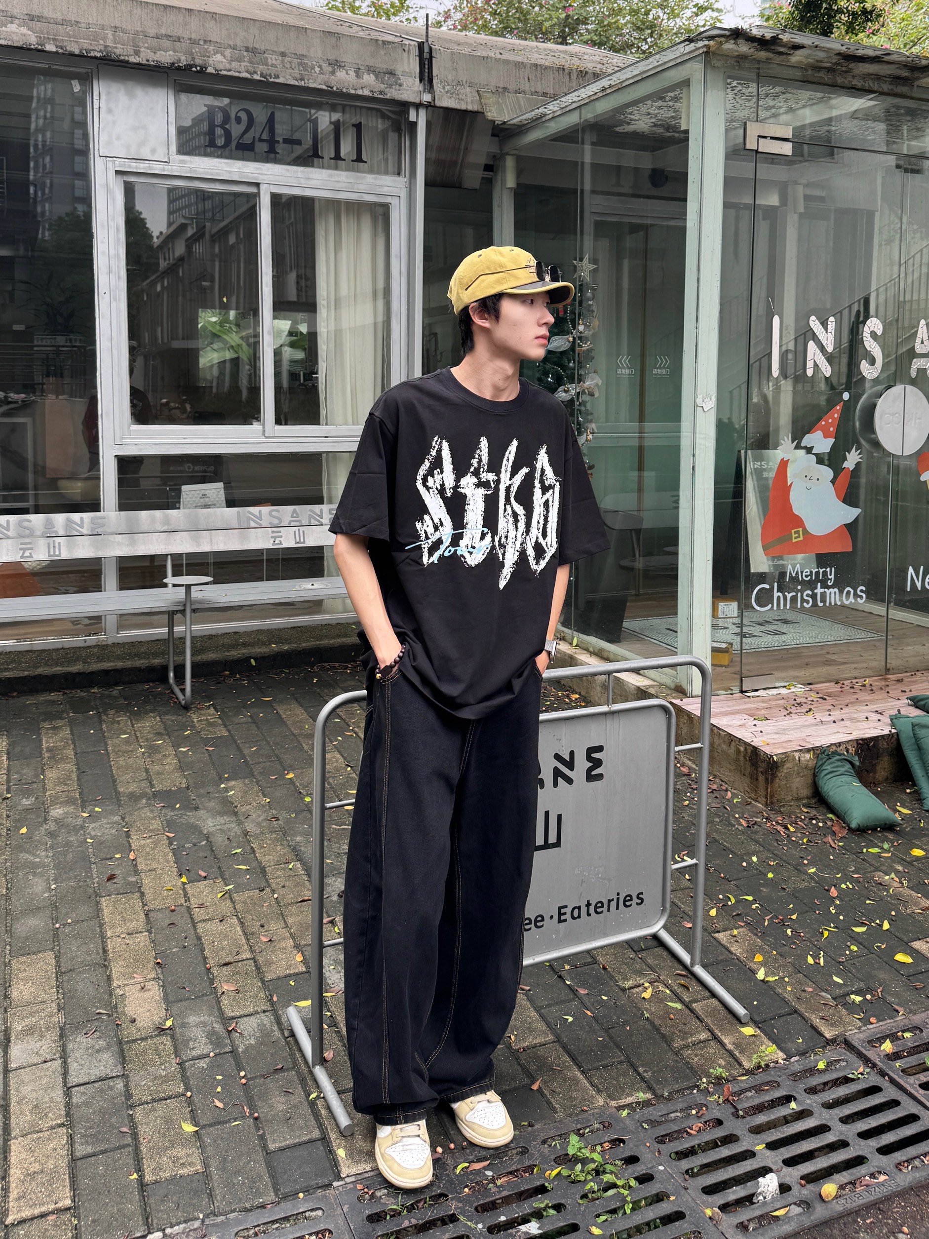 黑T自带的松弛感真的绝了,做旧涂鸦印花打破沉闷,搭配同色系明线阔腿牛仔裤,宽松版型藏肉又显高,整套黑调穿搭酷感拉满 黄帽点亮造型,复古板鞋收尾,随性又有态度,日常出街、探店都适配,轻松拿捏不费力的街头少年感✨