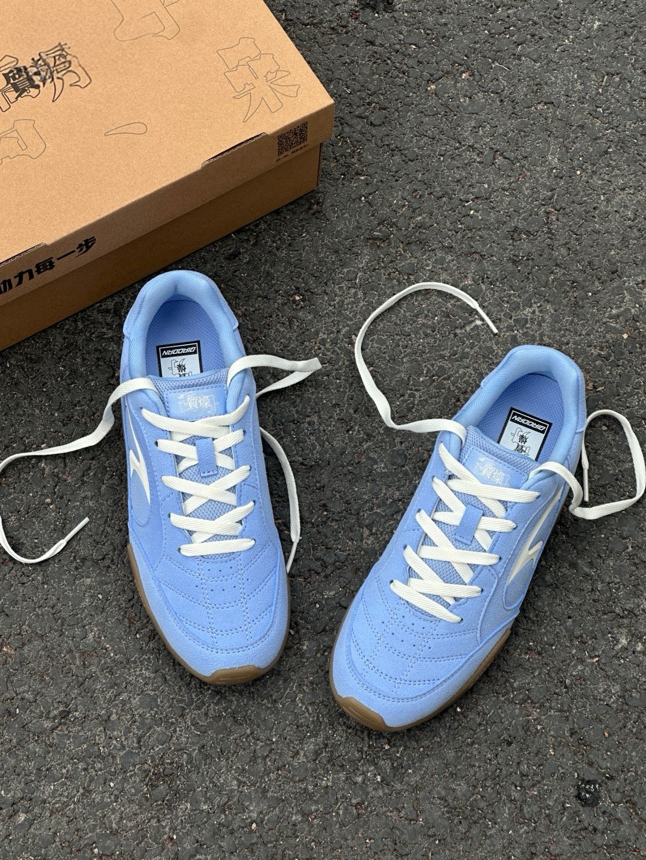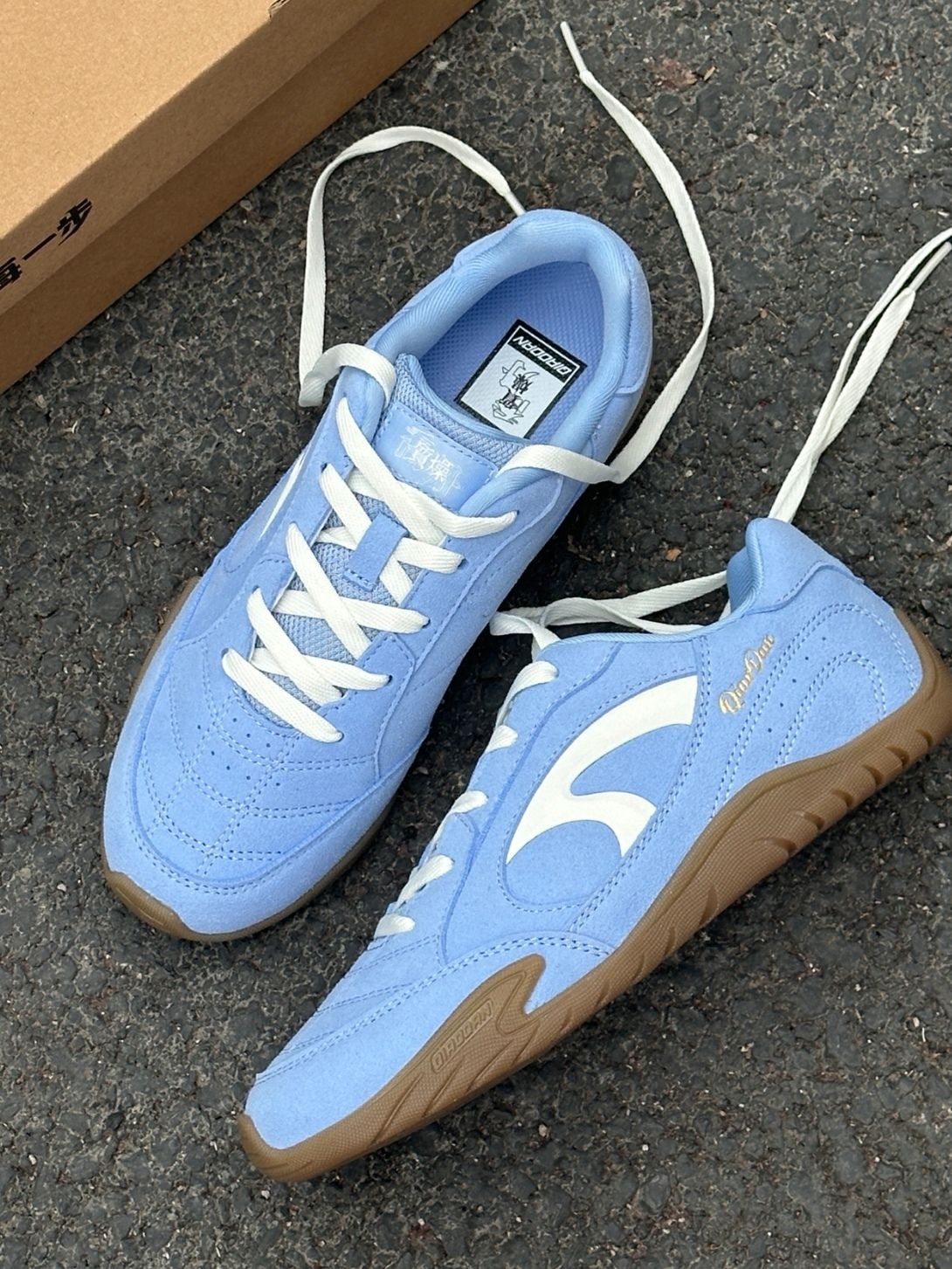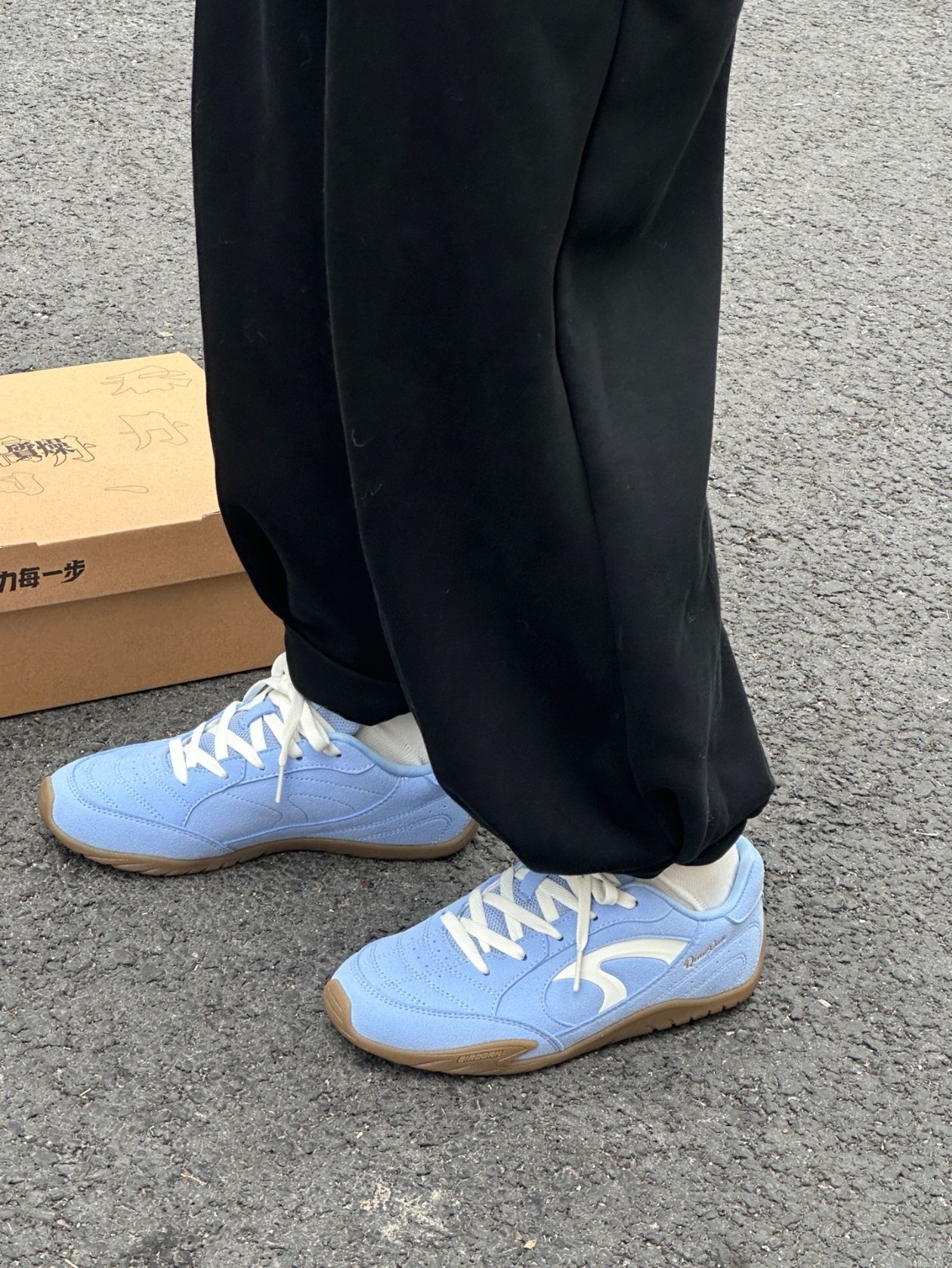 乔丹介双海盐蓝德训鞋,一整个清爽校园感Get!! 海盐芝士蓝+赛车风鞋型 复古又清新 尊的一眼心动啦.... 鞋子很秀气上脚好显脚小,麂皮拼接材质很柔软,行走舒适度、长时间穿着刷街也不累脚,出街搭配上运动裤休闲裤都很OK!