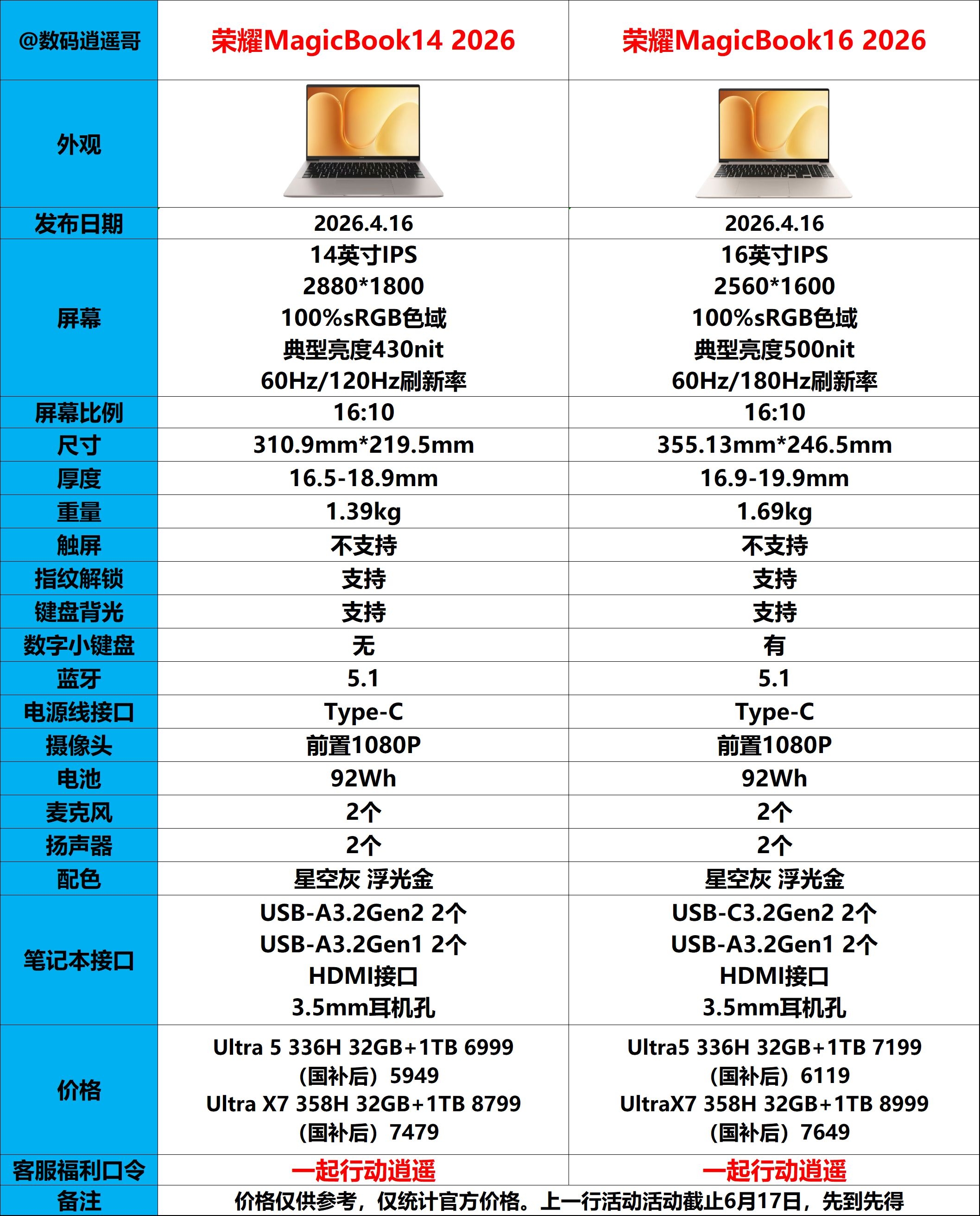 一图看懂|新款荣耀MagicBook14 |16 荣耀轻薄本阵营分为HonorBook(X/X Plus入门款)和MagicBook(数字/Pro/Art中高端全能款)两大系列。 MagicBook 14/16 2026属于MagicBook N系列,全系标配92Wh超大电池,对续航有高要求的同学可以重点考虑。 14英寸款仅1.39kg,极致便携,适合通勤党、学生党、荣耀全家桶用户;16英寸款...