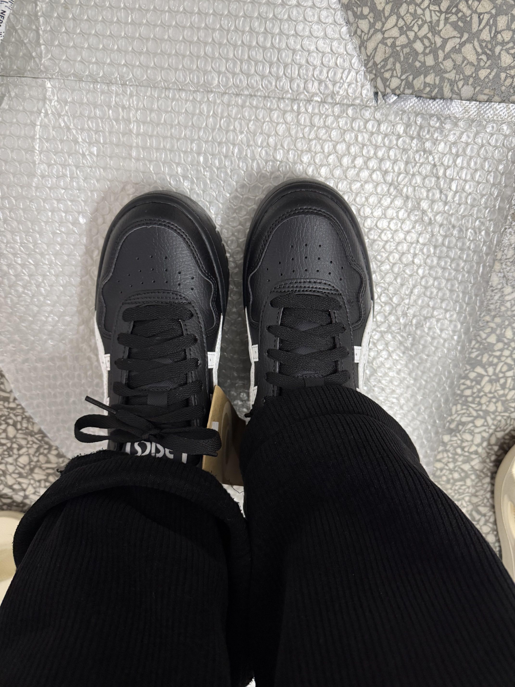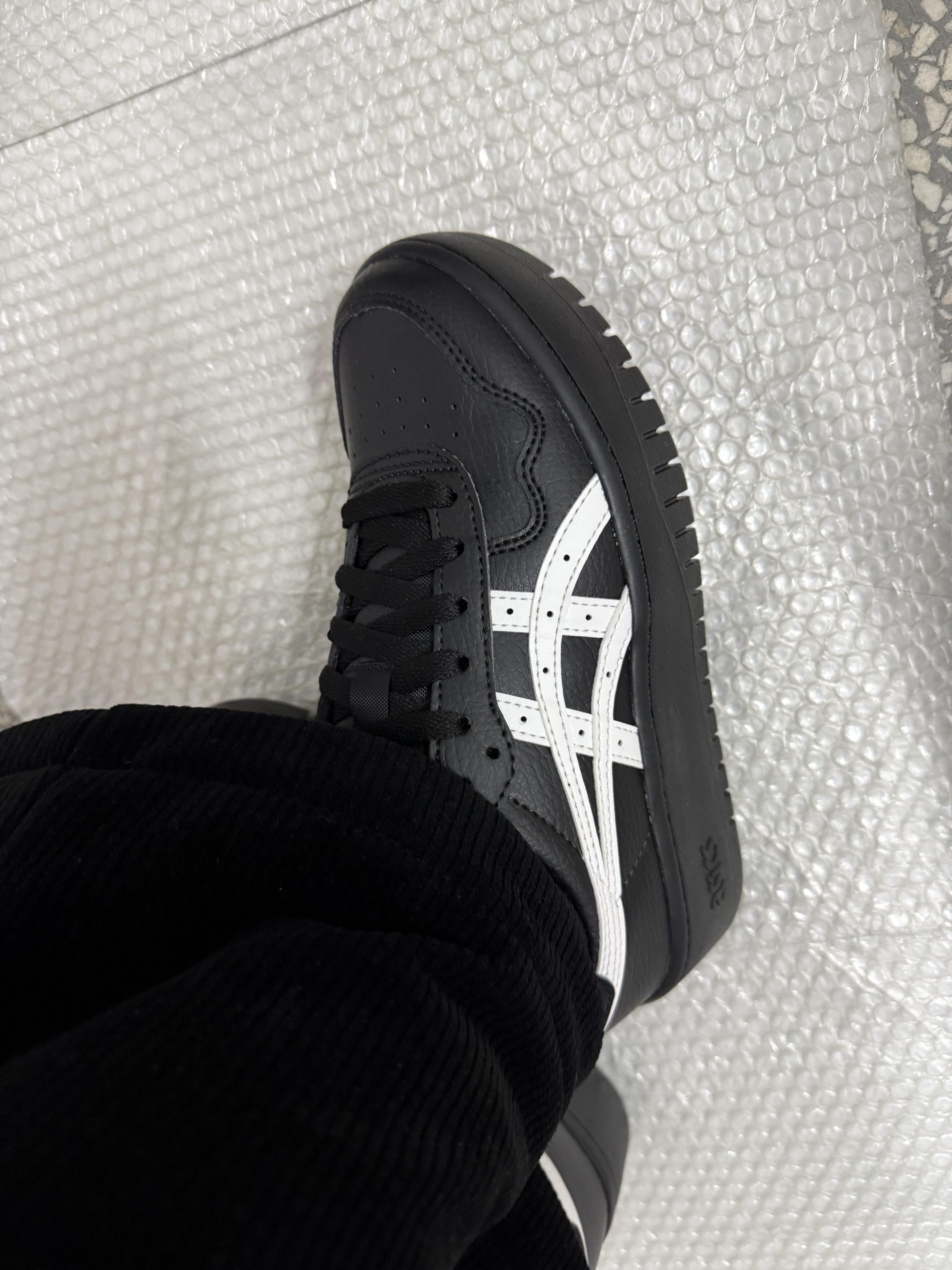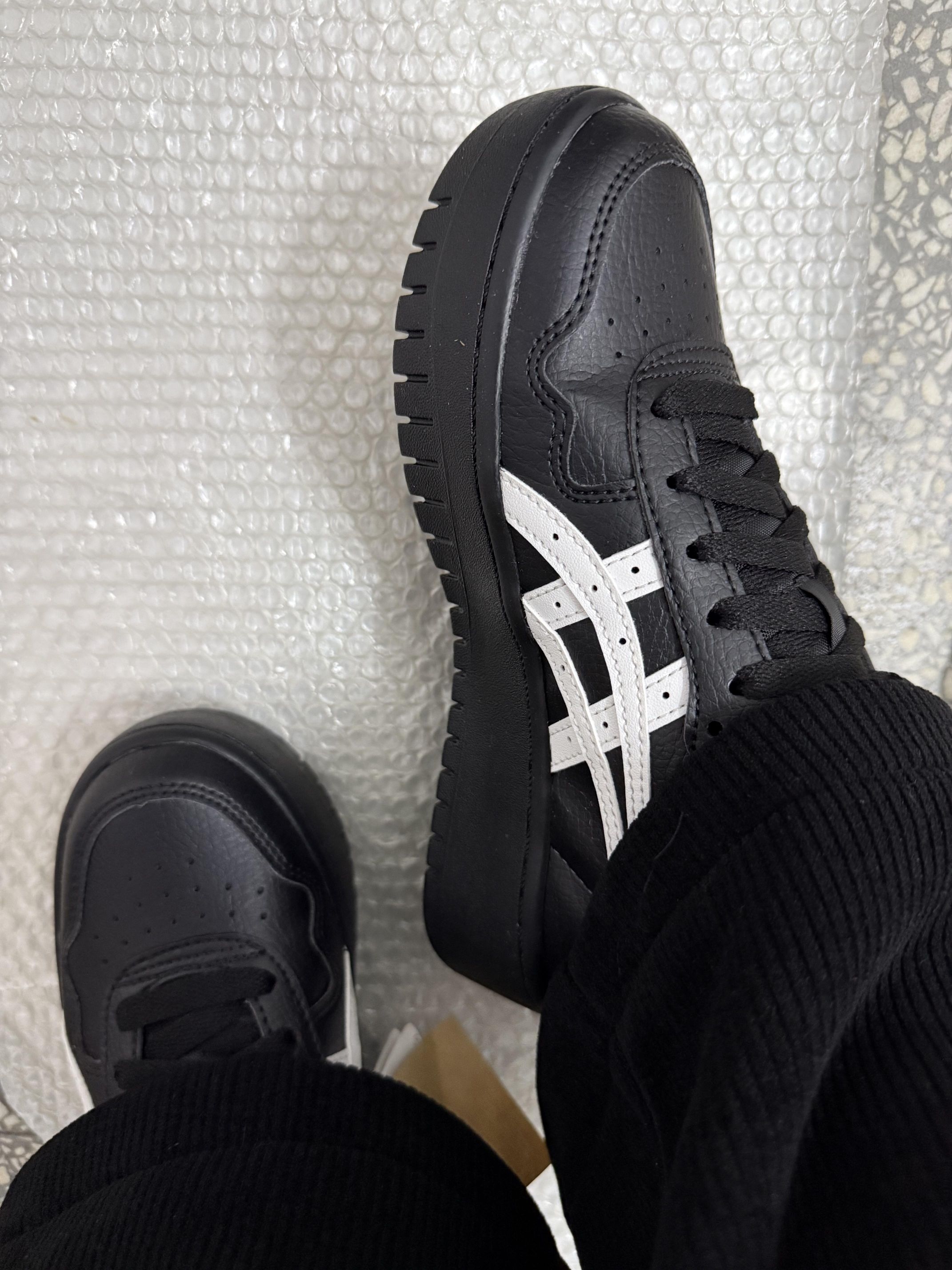 试穿了一下亚瑟士这款很火的小黑鞋 鞋子很美丽百搭,厚底的有增高效果,也挺轻的。 但穿起来像穿小皮鞋,鞋底硬,有点厚的,鞋型偏瘦,前面有点挤脚,建议:脚瘦的可以正码正拍,不然需要拍大一码
