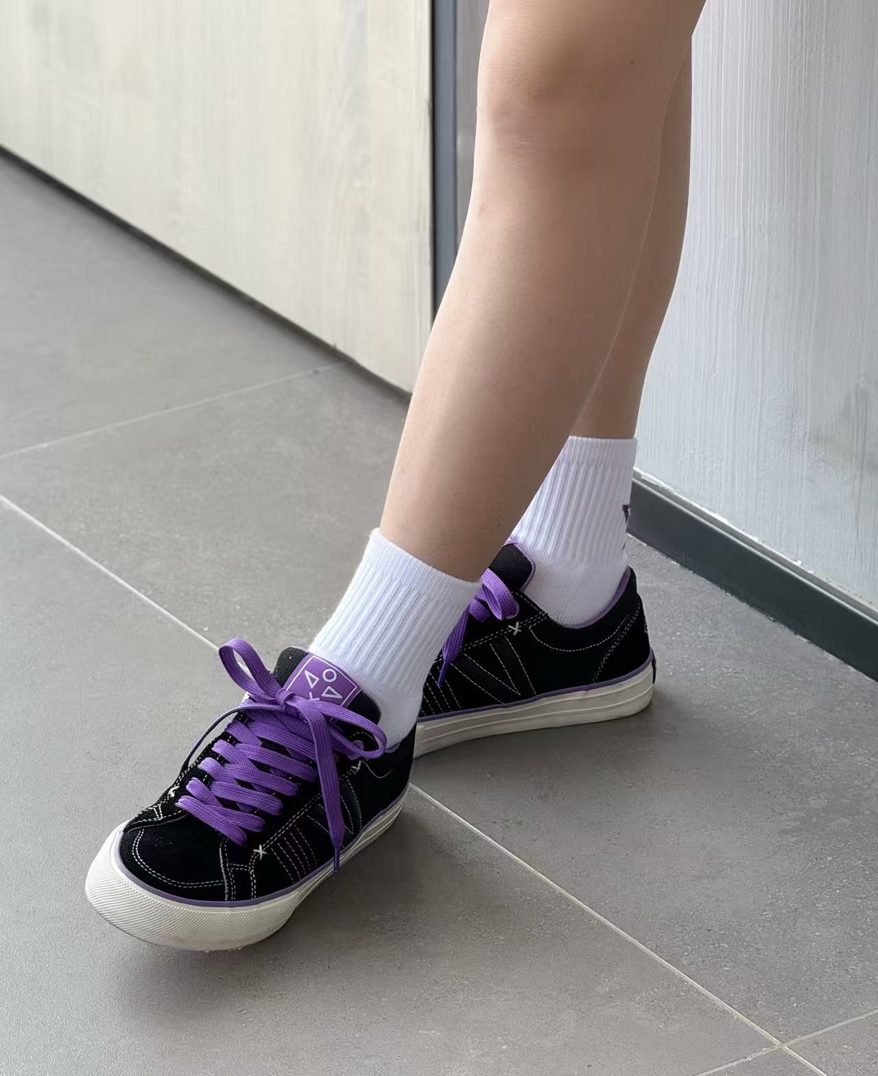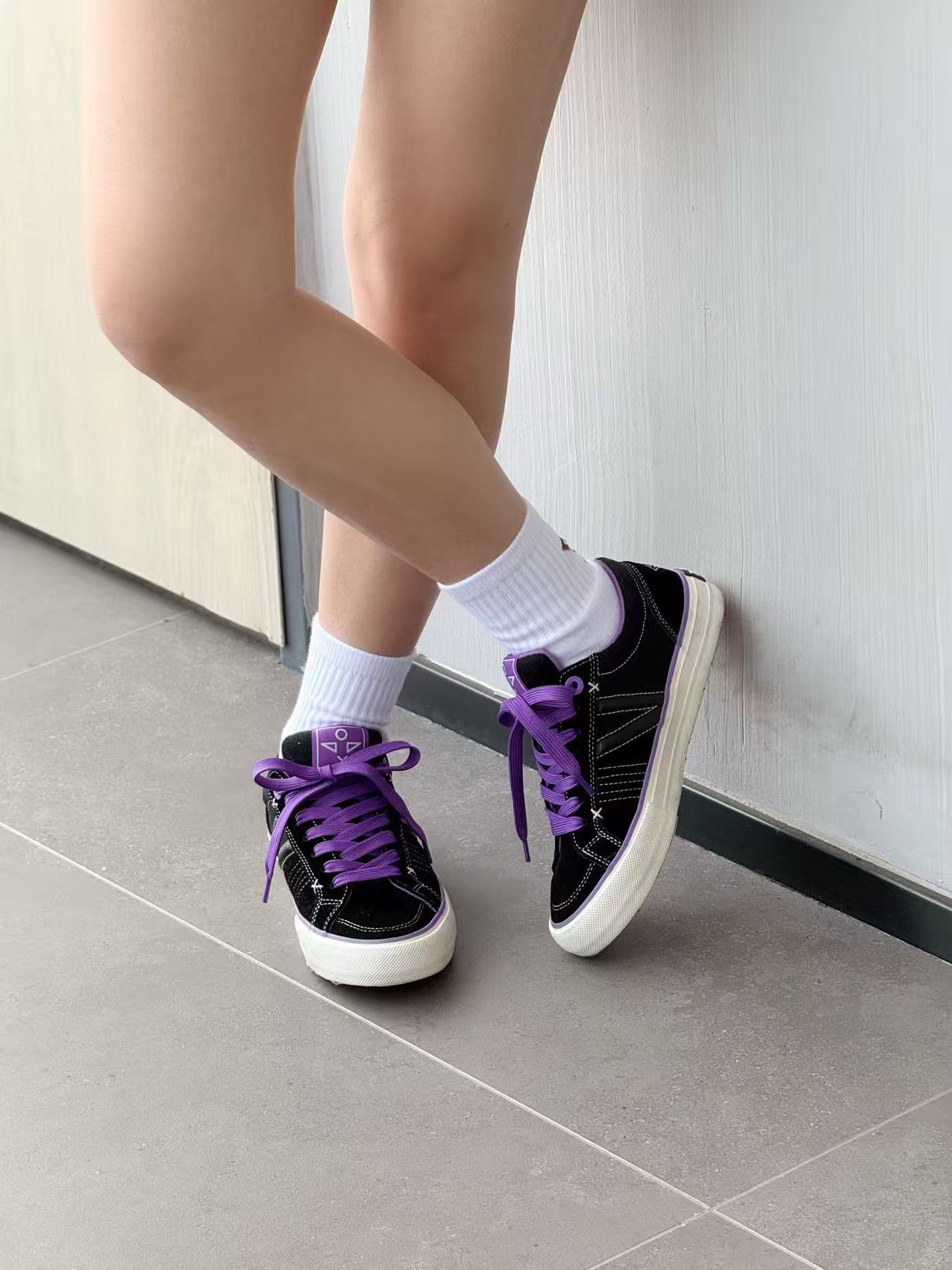 “谁能拒绝这双自带紫气东来buff的清华紫板鞋啊!黑绒面搭亮眼紫鞋带,撞色直接封神~不管是校园上课还是街头炸街,上脚秒变穿搭焦点,脚感软乎乎还巨显腿长,潮人姐妹闭眼冲就完事!#板鞋推荐 #清华紫穿搭 #校园潮鞋