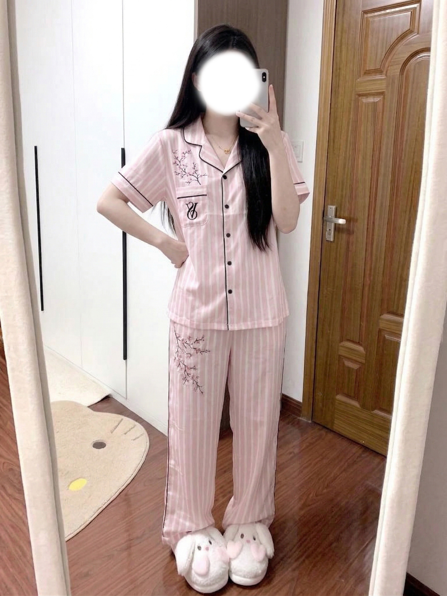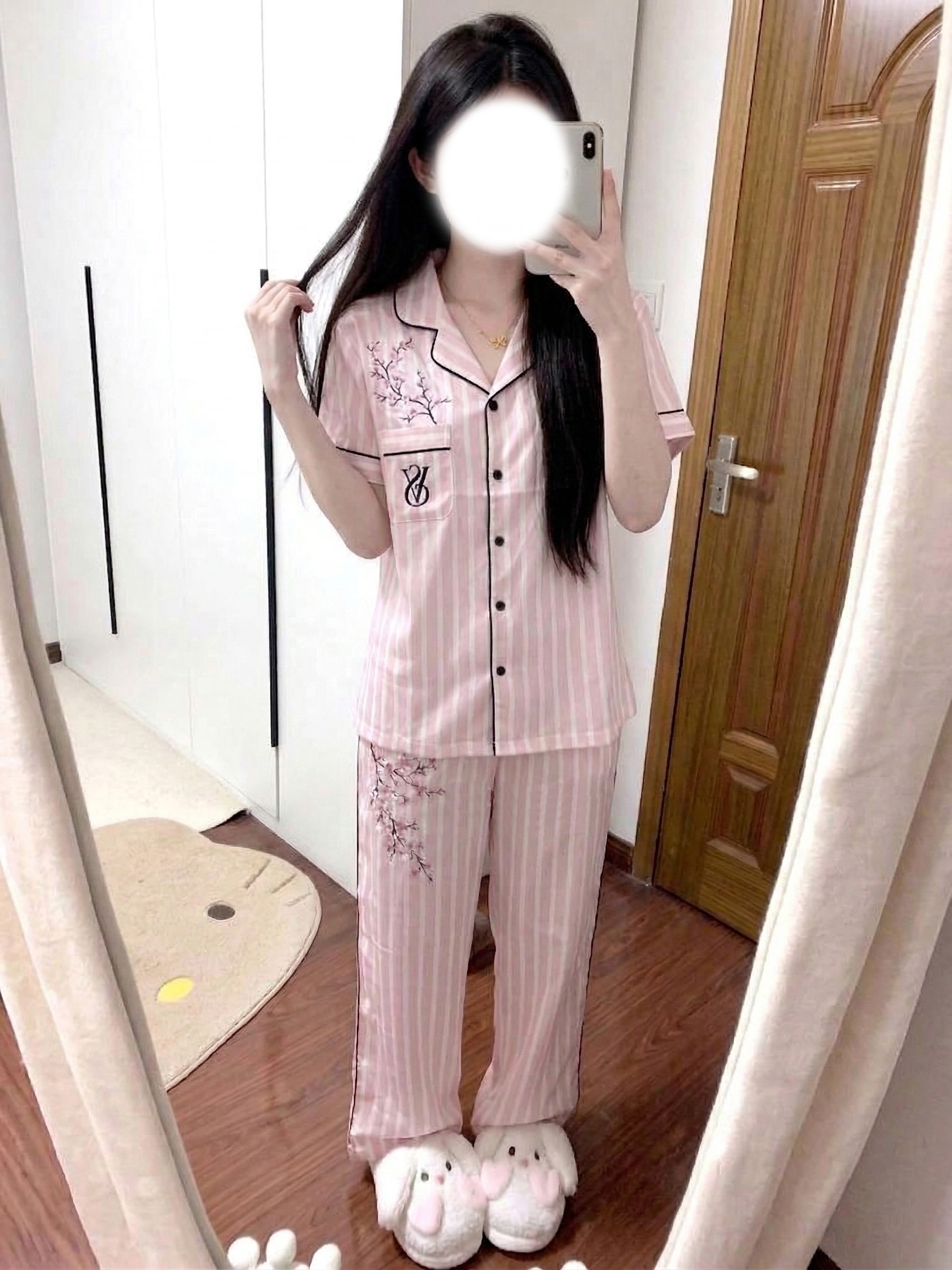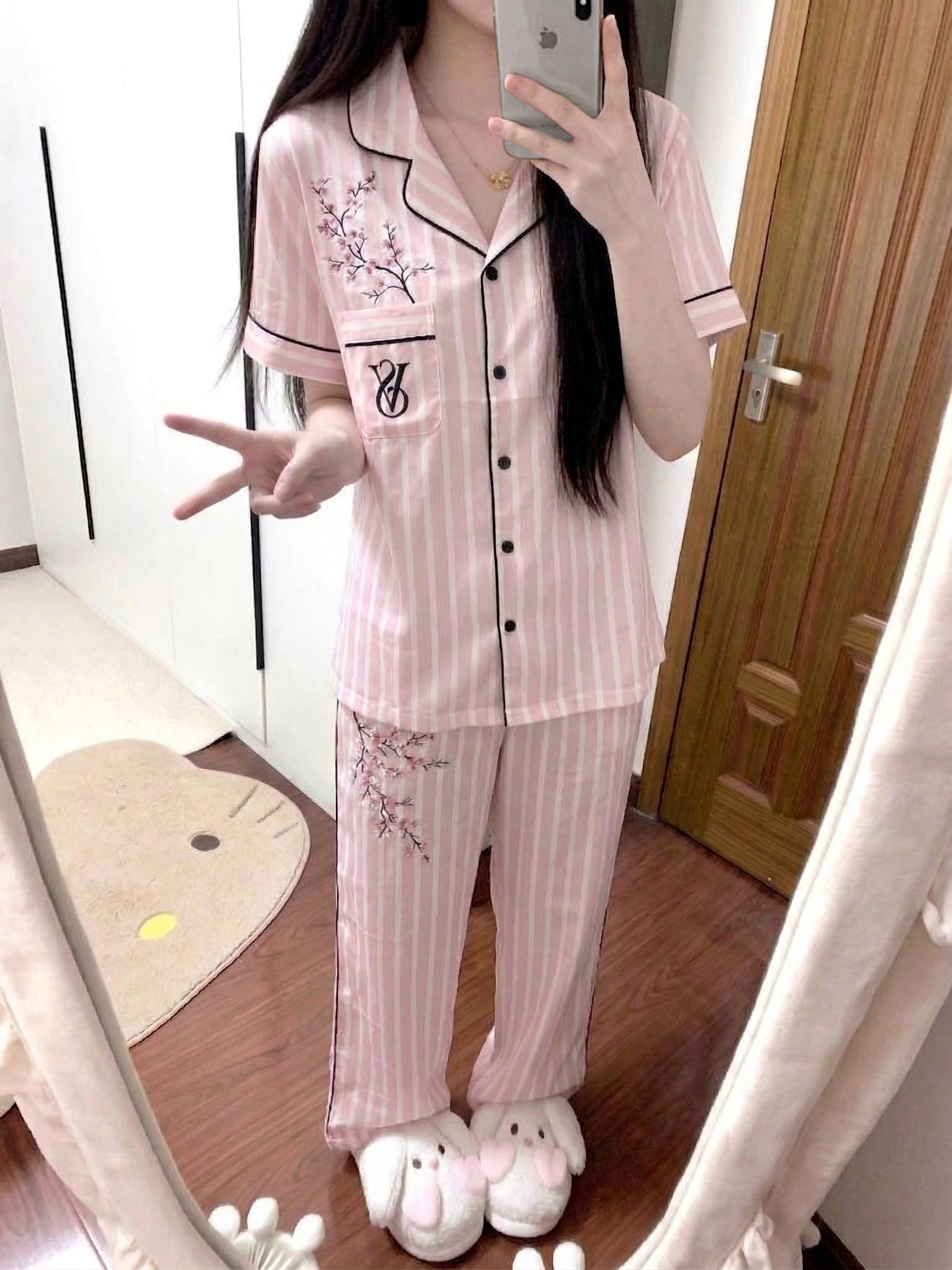 谁懂啊! 这套粉白条纹+樱花刺绣的维密睡衣 直接戳中我的心巴💖 温柔到骨子里的樱花粉 衬得肤色超显白 经典西装领版型自带慵懒高级感 出门拿快递、取外卖都超有范儿~ 面料软乎乎的像云朵一样亲肤 夏天穿透气又凉快 完全不闷汗! 口袋上的经典logo搭配枝桠感绣花 细节精致又不浮夸 少女感拉满✨