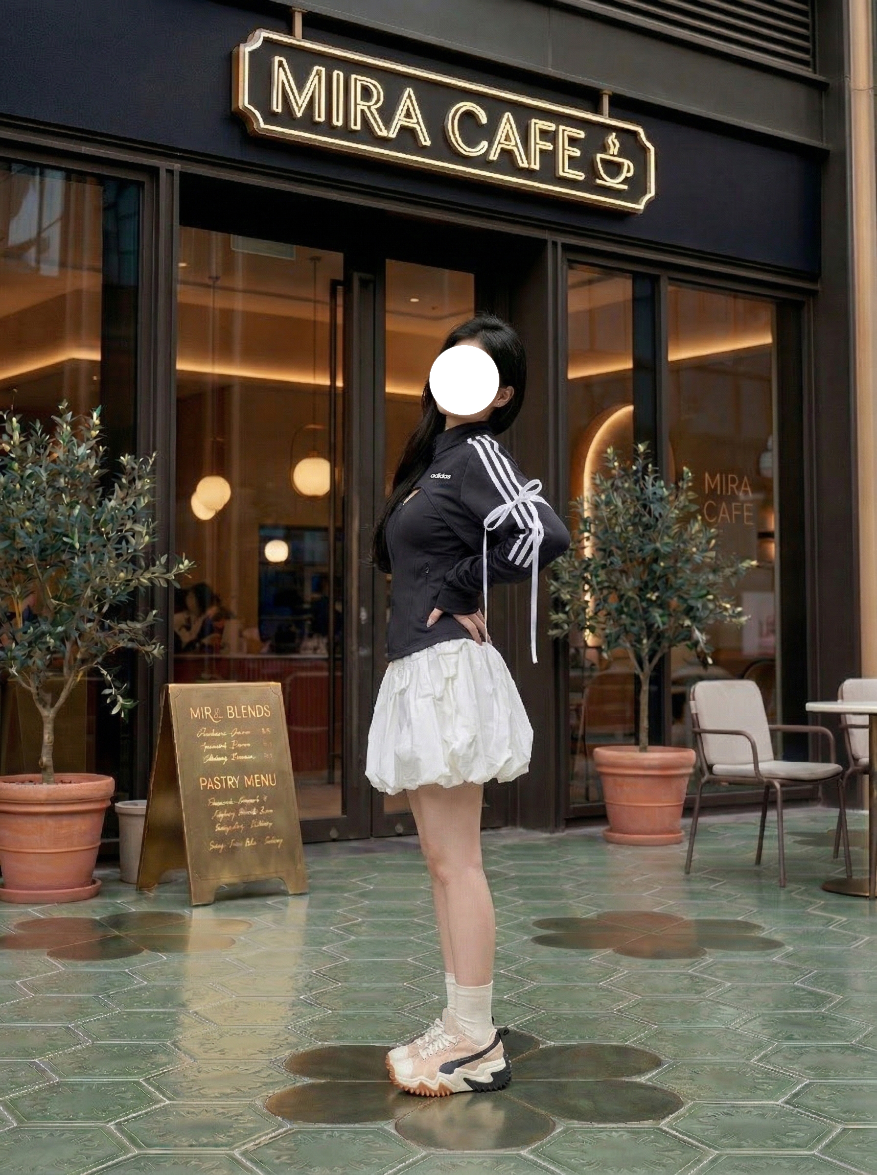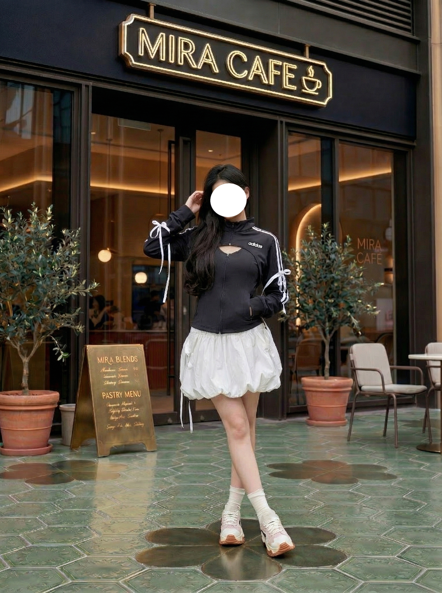 Adidas外套+花苞裙的组合,直接把甜酷感焊在身上! 黑白色调自带清爽滤镜,绑带细节又甜又飒, 搭配厚底鞋和堆堆袜,妥妥的韩系街头甜妹! 出门喝咖啡、逛街穿这套,回头率直接拉满✨ 谁说运动服只能搭运动裤?这波混搭我喜欢😘!