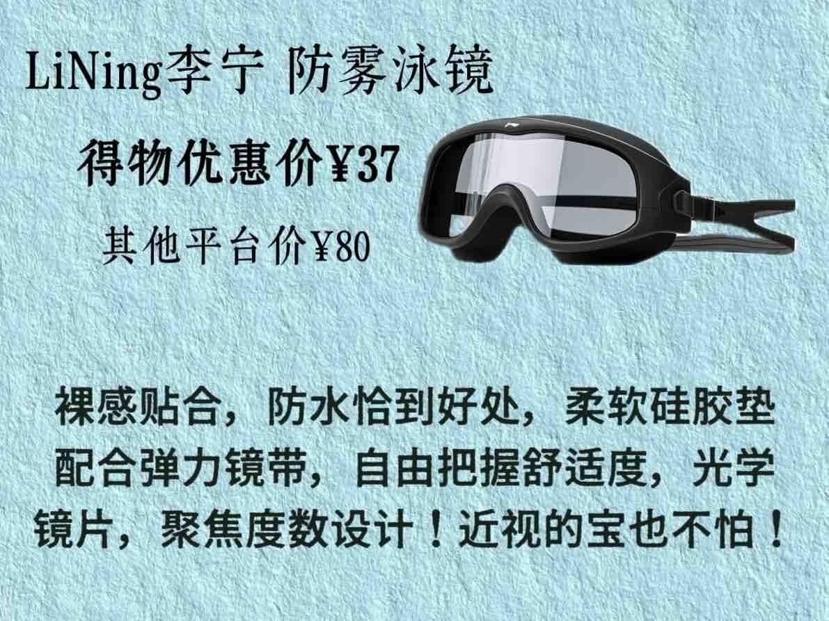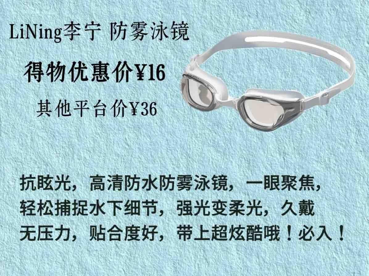✅ LI-NING 李宁 【防雾泳镜】 💰价格双杀:得物优惠价仅¥16(其他平台¥38+),入门首选! 👁️核心体验:高清防雾镀膜,水下视物清晰不模糊;硅胶密封边框,贴合眼眶不漏水。 💪适用人群:新手学游泳、儿童/青少年日常训练,性价比拉满。 ✅ LI-NING 李宁 【防雾泳镜】 ✨进阶款:优惠价¥37(其他平台¥80),比入门款视野更大、更耐用。 🌊防水黑科技:多层防雾涂层,搭配抗冲击镜片...