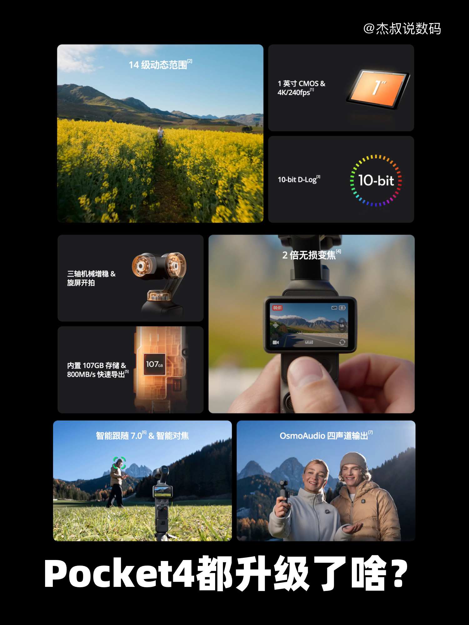 千呼万唤,大疆今天终于把Osmo Pocket 4给端出来了。 作为Vlog圈的“年度理财产品”,大家都在盯这次到底挤没挤牙膏。 刚看完首发参数的我只能说,大疆这次是真的听劝,直接踩在咱们的痛点上蹦迪。 图里我盘点了这台机器最戳我的几个升级点。 但挑几个最离谱的在这儿跟你们唠唠。 比如那个自带107G内存,这绝对是全场最佳。 谁懂那种到了绝美风景区,掏出机器却发现没插卡的绝望?现在哪怕忘带...