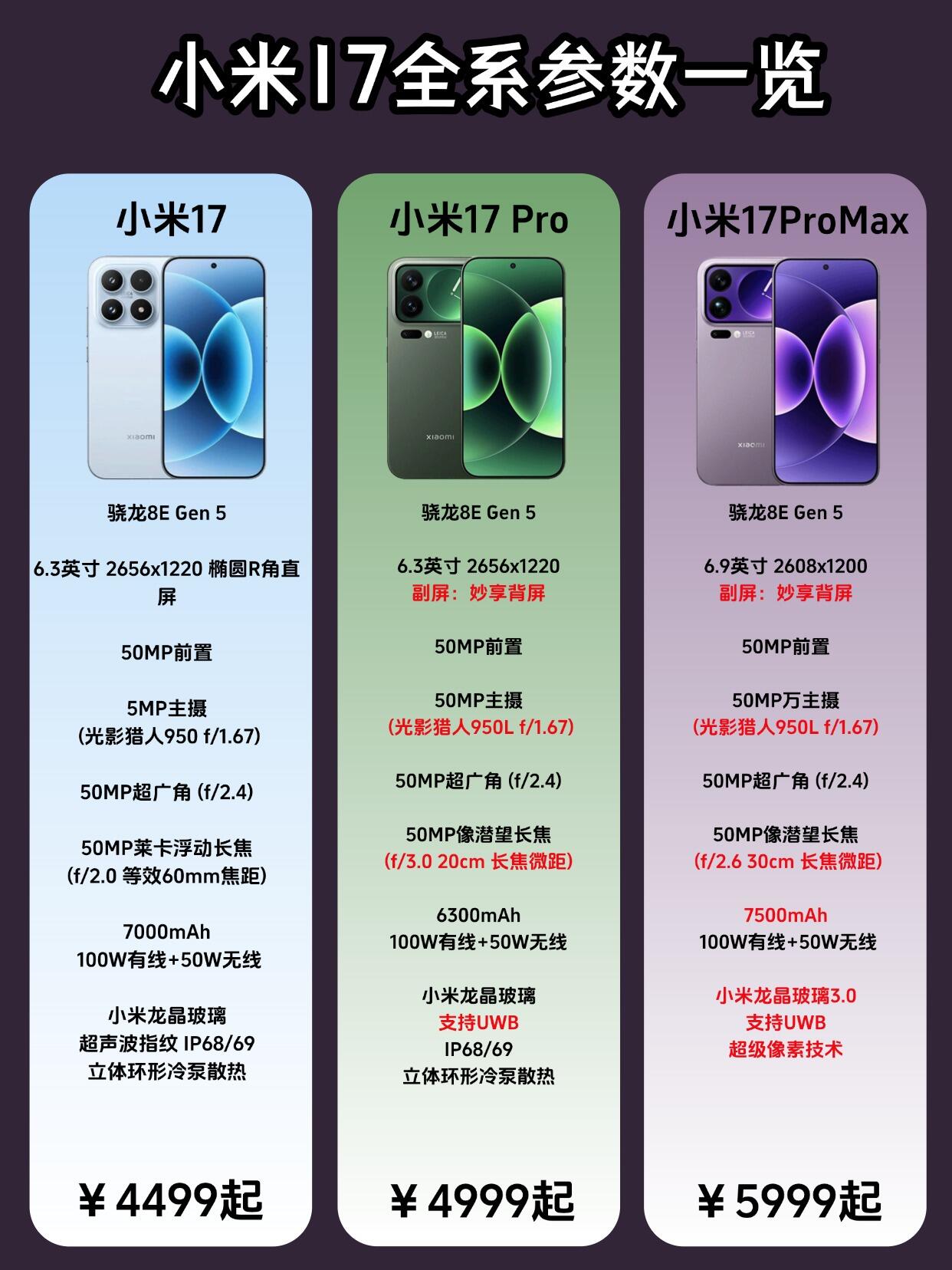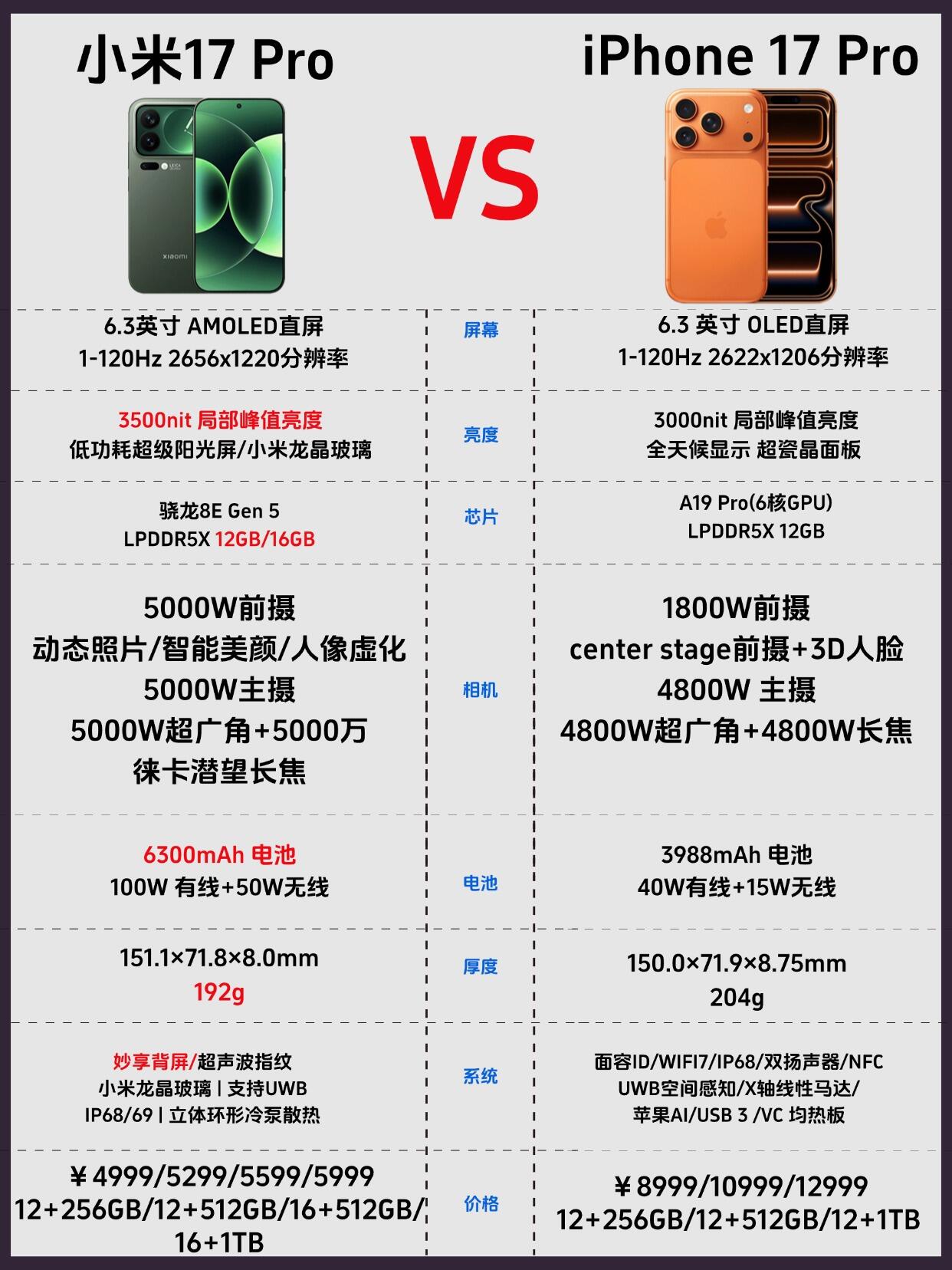 还在纠结换哪款旗舰?小米17系列和iPhone17的详细对比来啦!帮你一眼看清差异,选机不迷茫~ 📱 基础对比(标准版) 屏幕:小米17(6.3″直屏,3500nit亮度)🆚 iPhone17(6.3″直屏,3000nit亮度) 性能:小米17(骁龙8E Gen5)🆚 iPhone17(A19芯片) 续航:小米17电池容量(7000mAh)远超iPhone17(3692mAh),续航焦虑终结者! ...