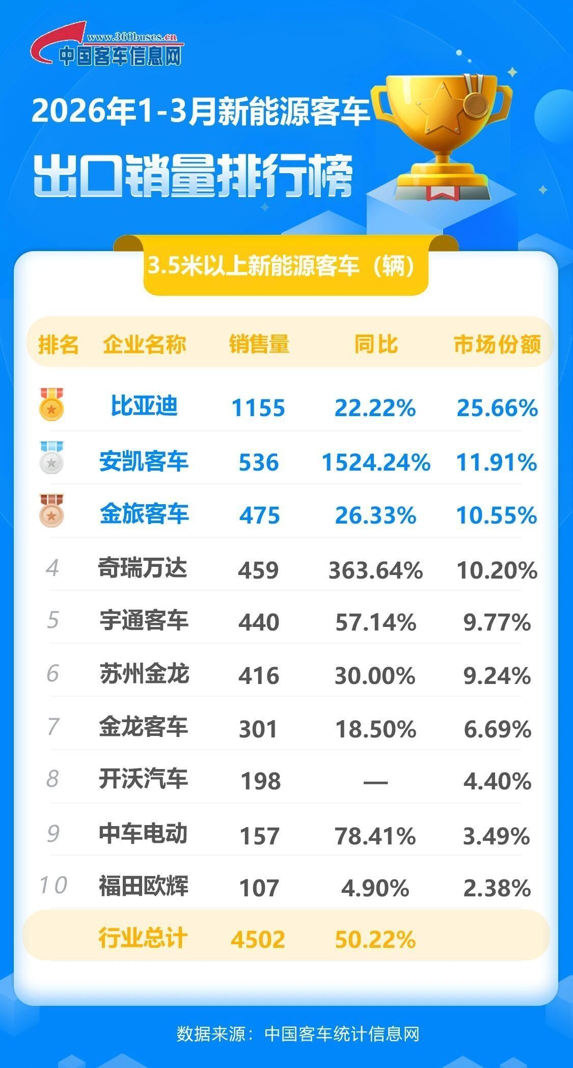 比亚迪赢麻了!冠军拿到手软!新能源客车出口量23年第一,24年第一,25年还是第一,最气人的是26年才过了一个季度,又遥遥领先了! 一直以为比亚迪的乘用车没有对手,没想到商用车也是卖到了世界各地,出口量连续多年都是冠军! 今年才过一个季度,新能源客车销量已经把友商甩了好几个身位,1155辆比第二名多了一倍还多!亚洲已经实现了全覆盖,欧洲和美洲的主要国家也都卖的不错! 其实早在2023年,比亚...