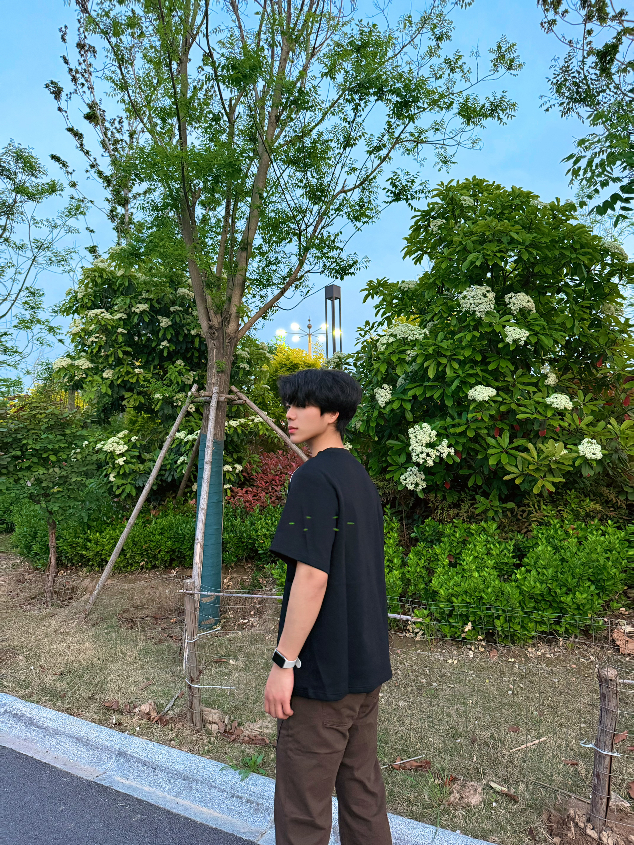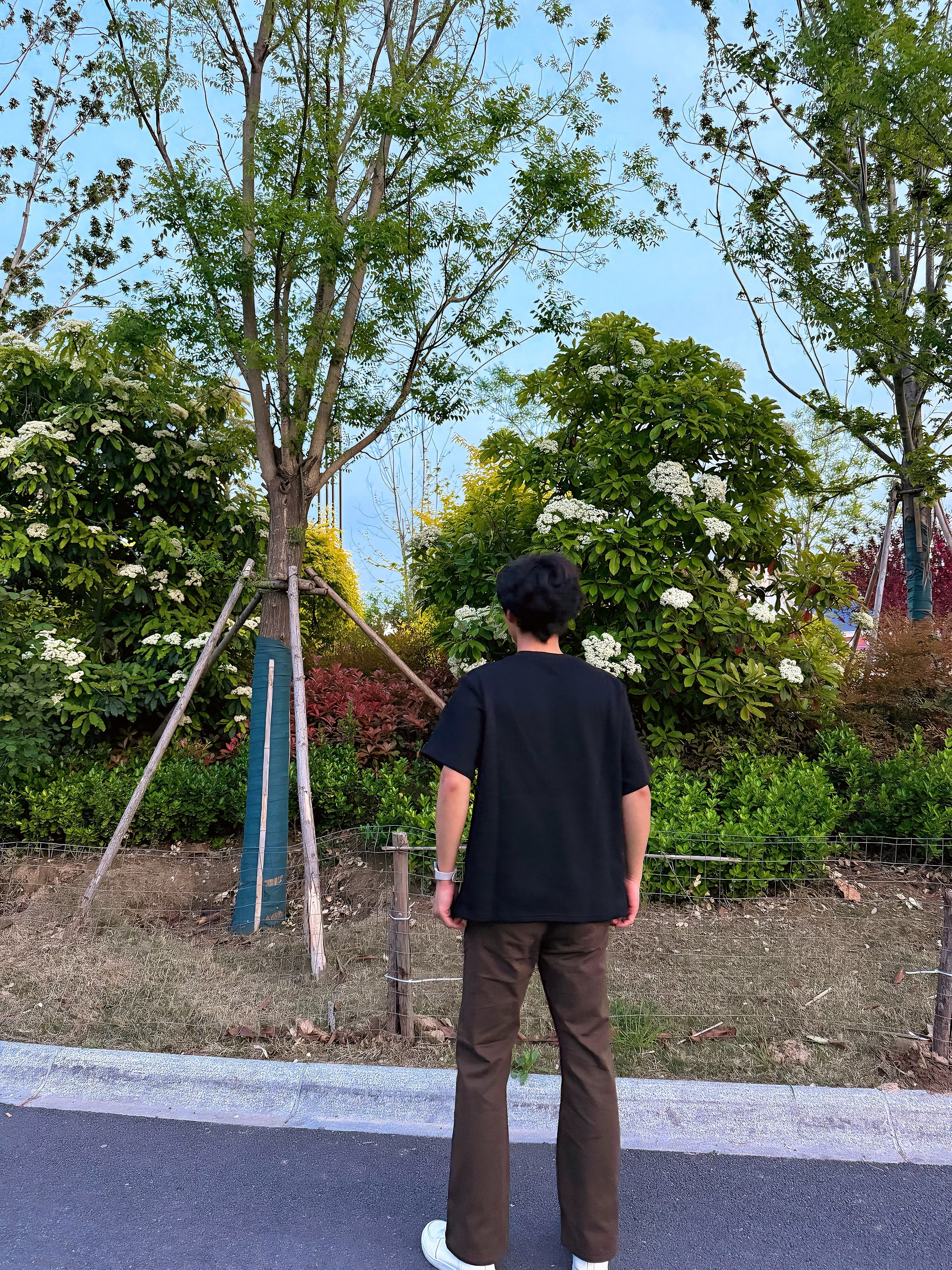 上身这件黑色短袖,面料很舒服,肩部的线条设计很有细节感,简约的款式里藏着小心思。下身的深棕色微喇裤垂坠感不错,版型利落,刚好和白鞋搭配起来,干净又清爽。