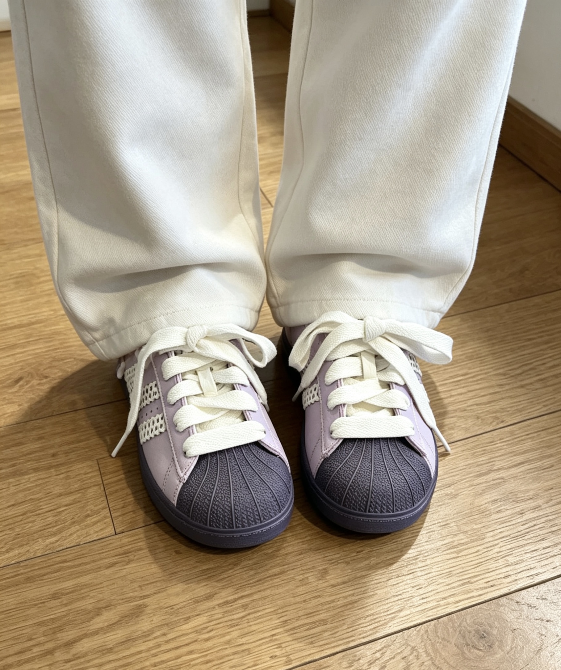 香芋紫贝壳头真的太绝了!😭 实物颜色超级温柔,是那种低饱和度的薰衣草紫,深紫鞋头做撞色,层次感直接拉满。最惊喜的是鞋侧的蕾丝三条纹,真的很精致,不是那种廉价的设计,穿出去完全不怕撞款。上脚巨显脚白,而且贝壳头版型很修饰脚型,显腿细!搭配宽松牛仔裤真的随性又好看,脚感也很软,不磨脚。春天搭配卫衣、裙子都绝了,紫色控直接冲!