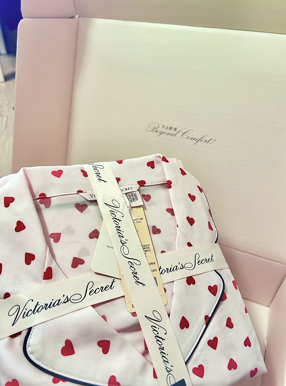 全新维多利亚的秘密爱心翻领睡衣礼盒装🎁 奶呼呼浅底+复古小红心印花,少女感直接拉满 顺滑亲肤缎面面料,软糯透气,居家睡觉巨舒服 翻领包边版型,慵懒又精致,睡觉/居家外穿都好看 礼盒丝带全套配齐,自留温柔氛围感拉满,送闺蜜送对象都超有心意 正品带吊牌,版型显瘦不挑身材,贴身软糯裸感睡眠💤 细节做工在线,维密经典款闭眼入不踩雷