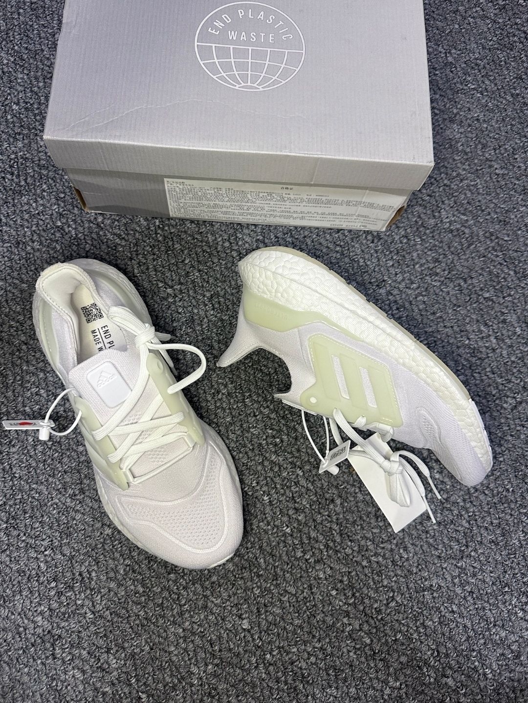 拆开包装拿出鞋子,第一眼就是干净利落的全白配色,真的太戳中简约控了!鞋身是透气的网面材质,摸上去手感细腻,夏天穿肯定能保证透气性,完全不用担心闷脚。标志性的三条纹设计做了半透明的质感处理,和纯白鞋面搭配起来,高级感直接拉满。 鞋底是超有质感的爆米花材质,肉眼看就能感受到满满的回弹感,上脚应该会特别软弹。鞋舌和鞋带的细节也做得很精致,原装的吊牌还保留着,能看出是全新正品,连鞋带的系法都很规整,强迫...
