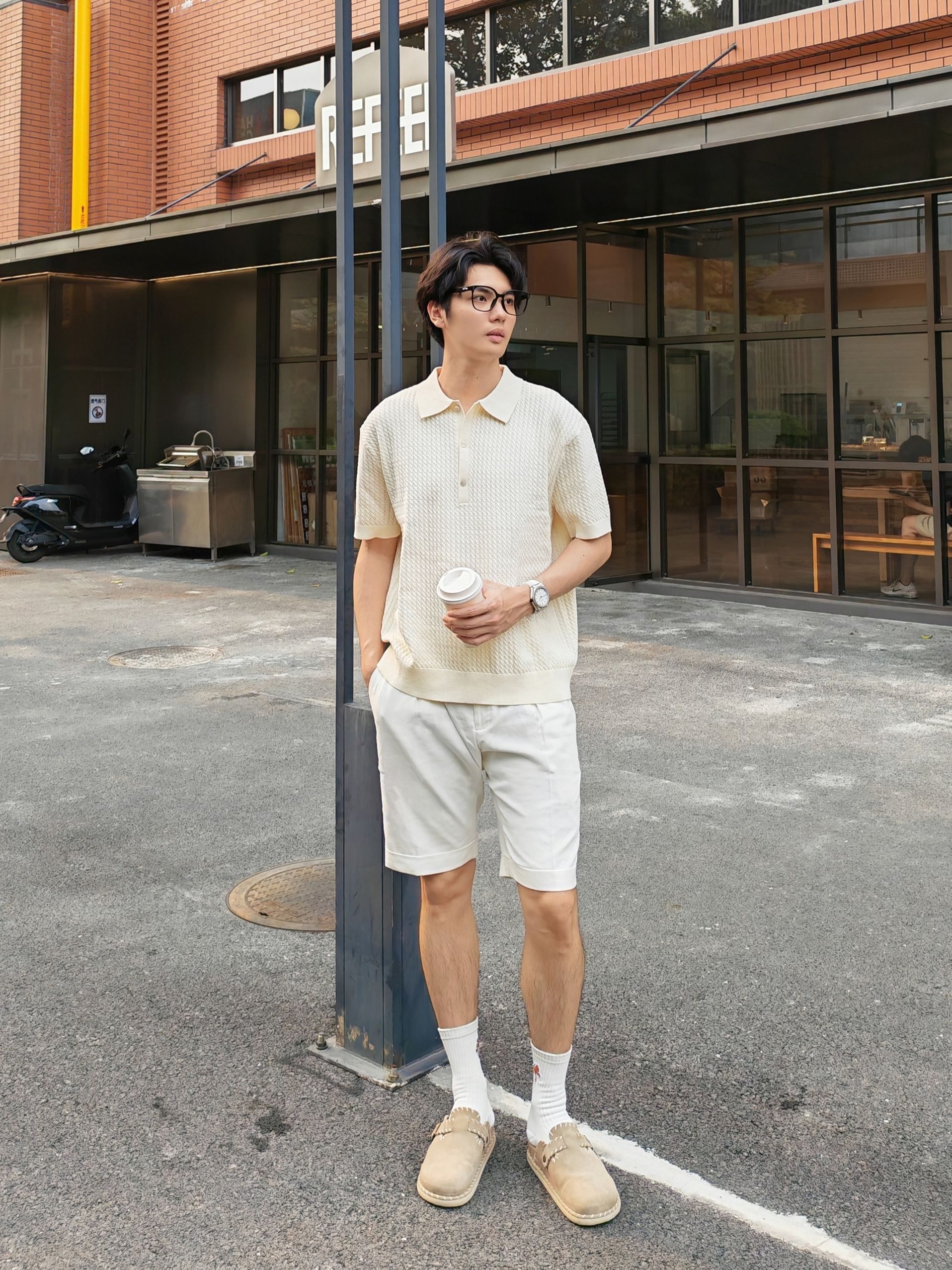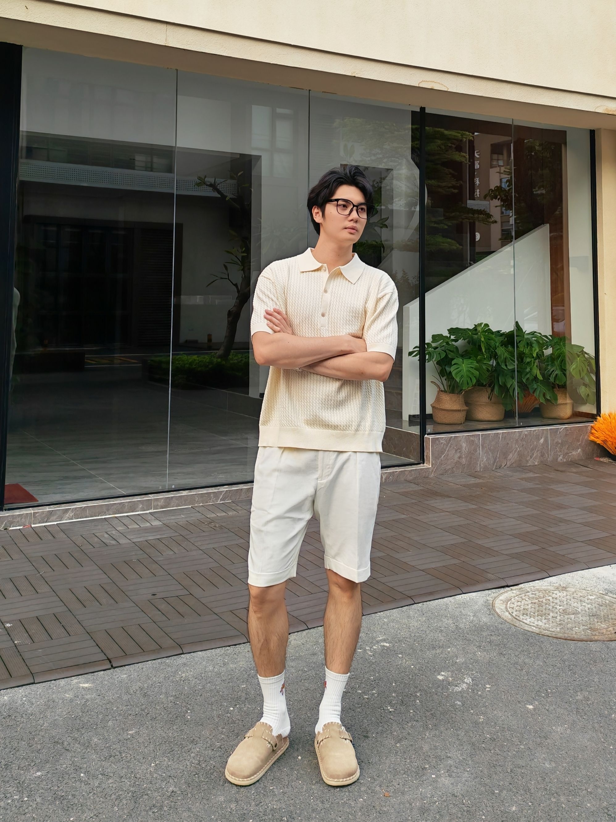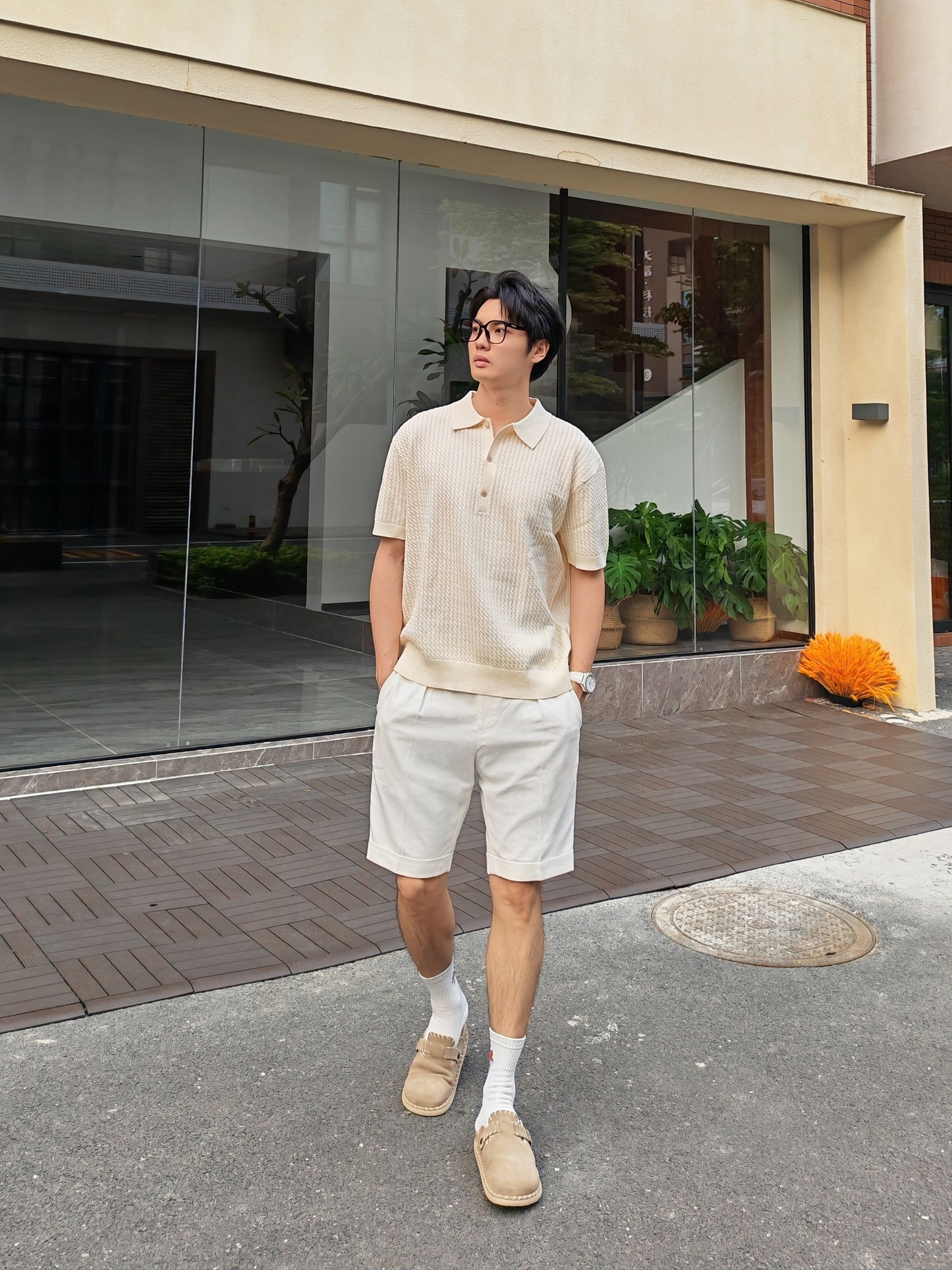 hi 这里是镭子的日常通勤出街穿搭分享 SKARO 杏色提花Polo衫真的是本命单品 肌理感拉满,宽松版型不挑身材还显干净 白色棉麻短裤顺色搭配,高腰宽松五分裤长很显腿长 白袜+勃肯鞋,慵懒感直接拉满 戴个黑框眼镜,斯文感瞬间拿捏🤌 这套不费力的通勤/约会穿搭,高个子男生闭眼冲,清爽又显贵 夏天就该这么穿!
