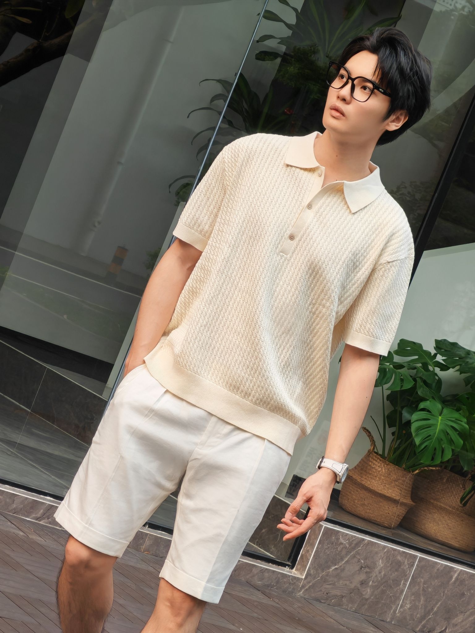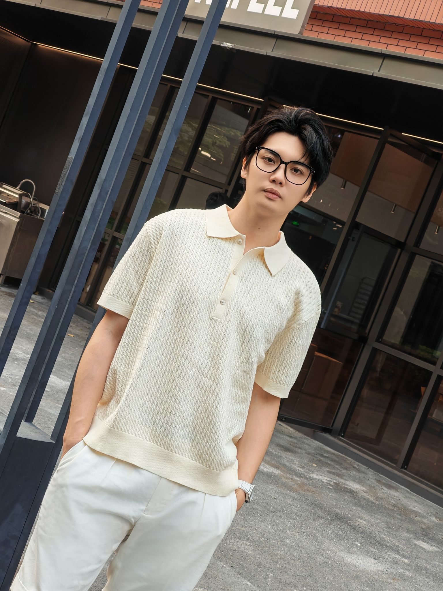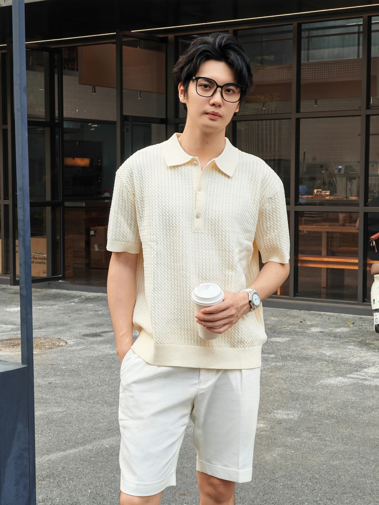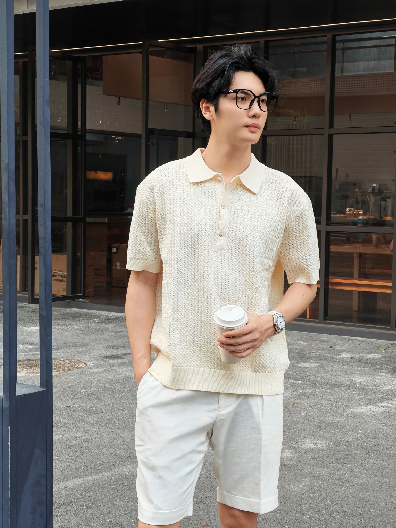 hi 这里是镭子的日常通勤出街穿搭分享 SKARO 杏色提花Polo衫真的是本命单品 肌理感拉满,宽松版型不挑身材还显干净 白色棉麻短裤顺色搭配,高腰宽松五分裤长很显腿长 白袜+勃肯鞋,慵懒感直接拉满 戴个黑框眼镜,斯文感瞬间拿捏🤌 这套不费力的通勤/约会穿搭,高个子男生闭眼冲,清爽又显贵 夏天就该这么穿!
