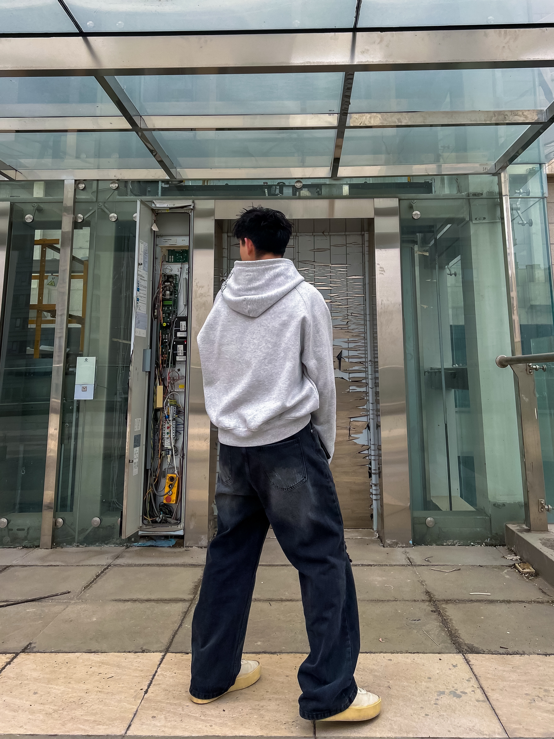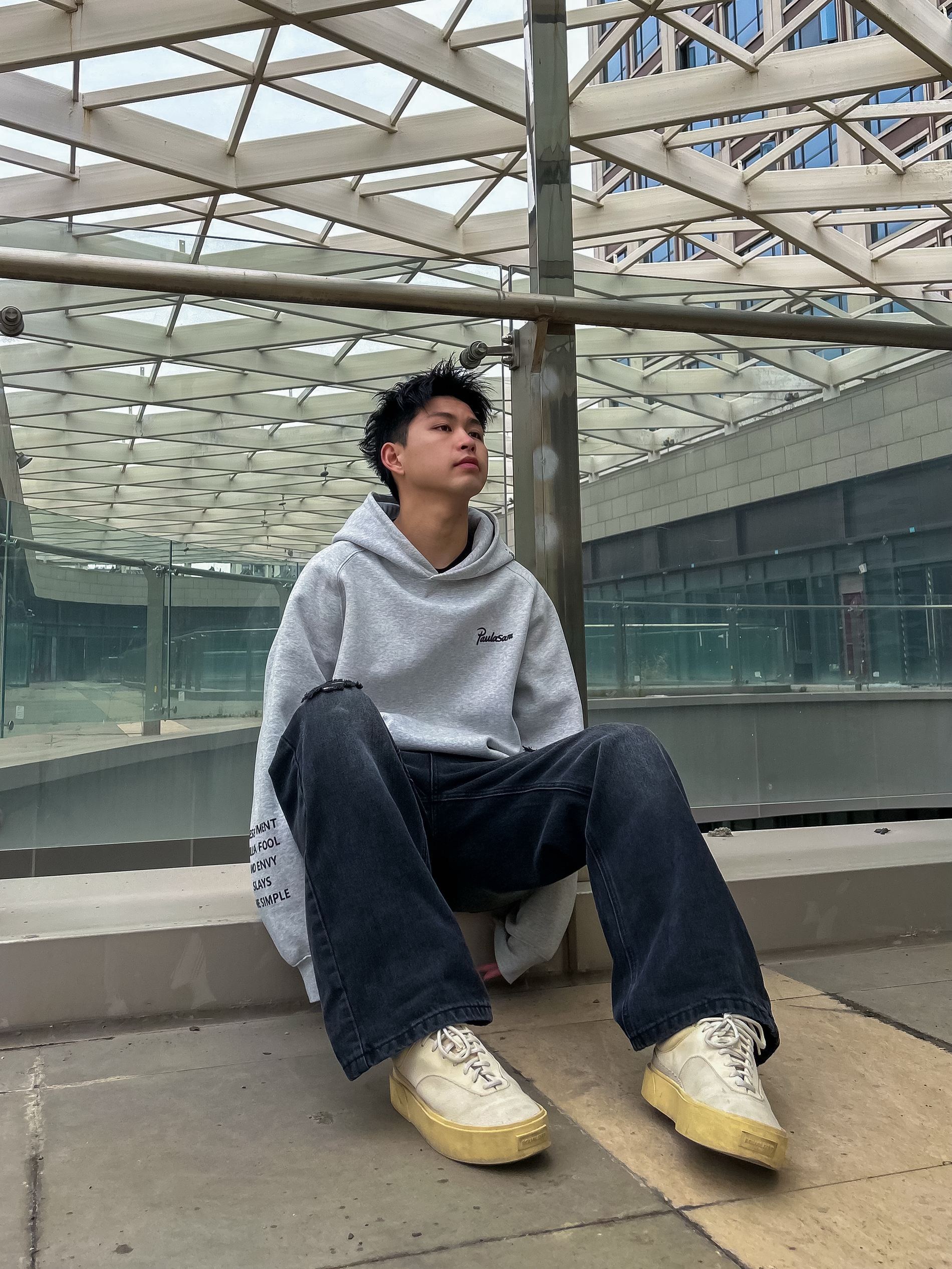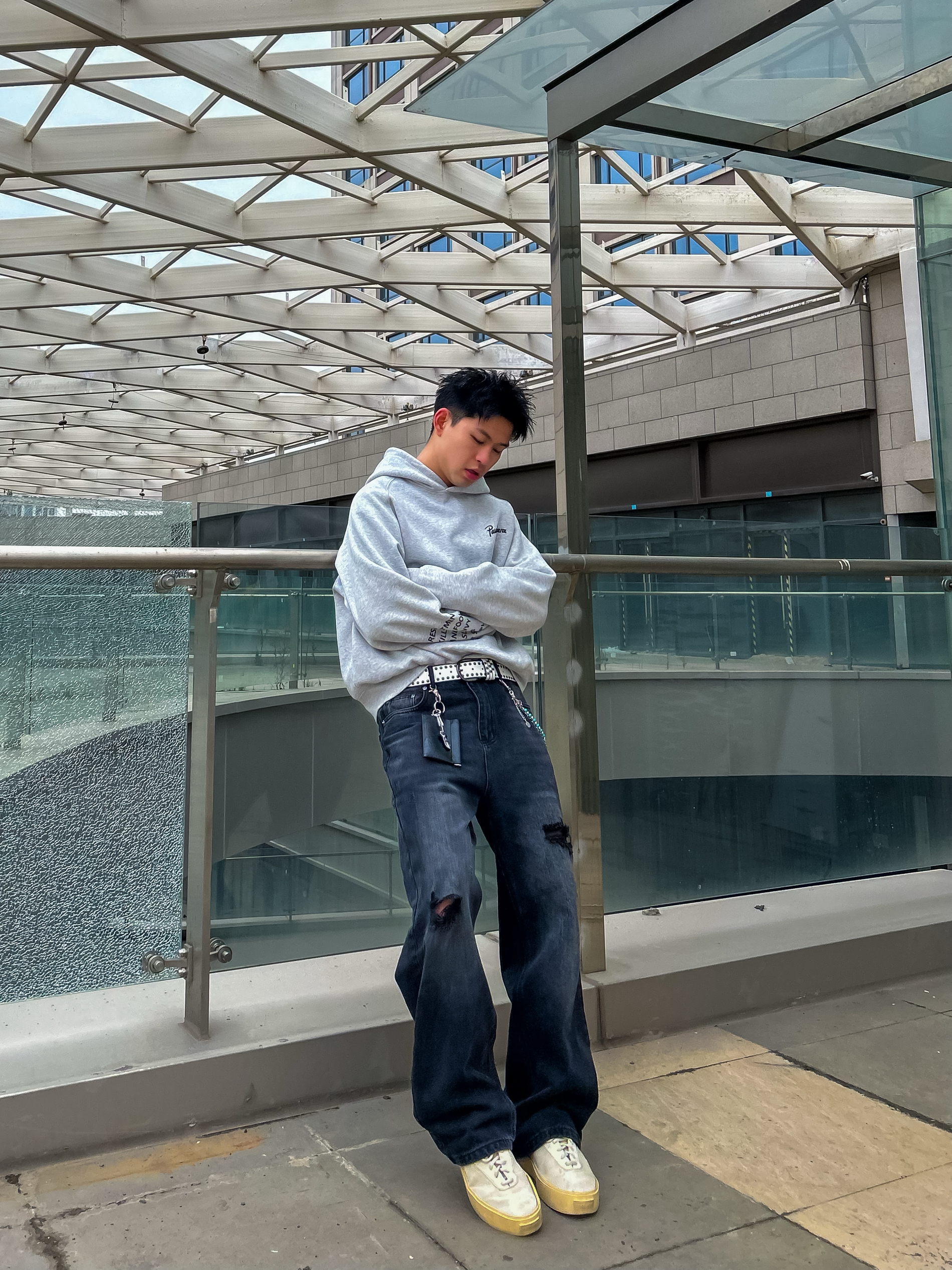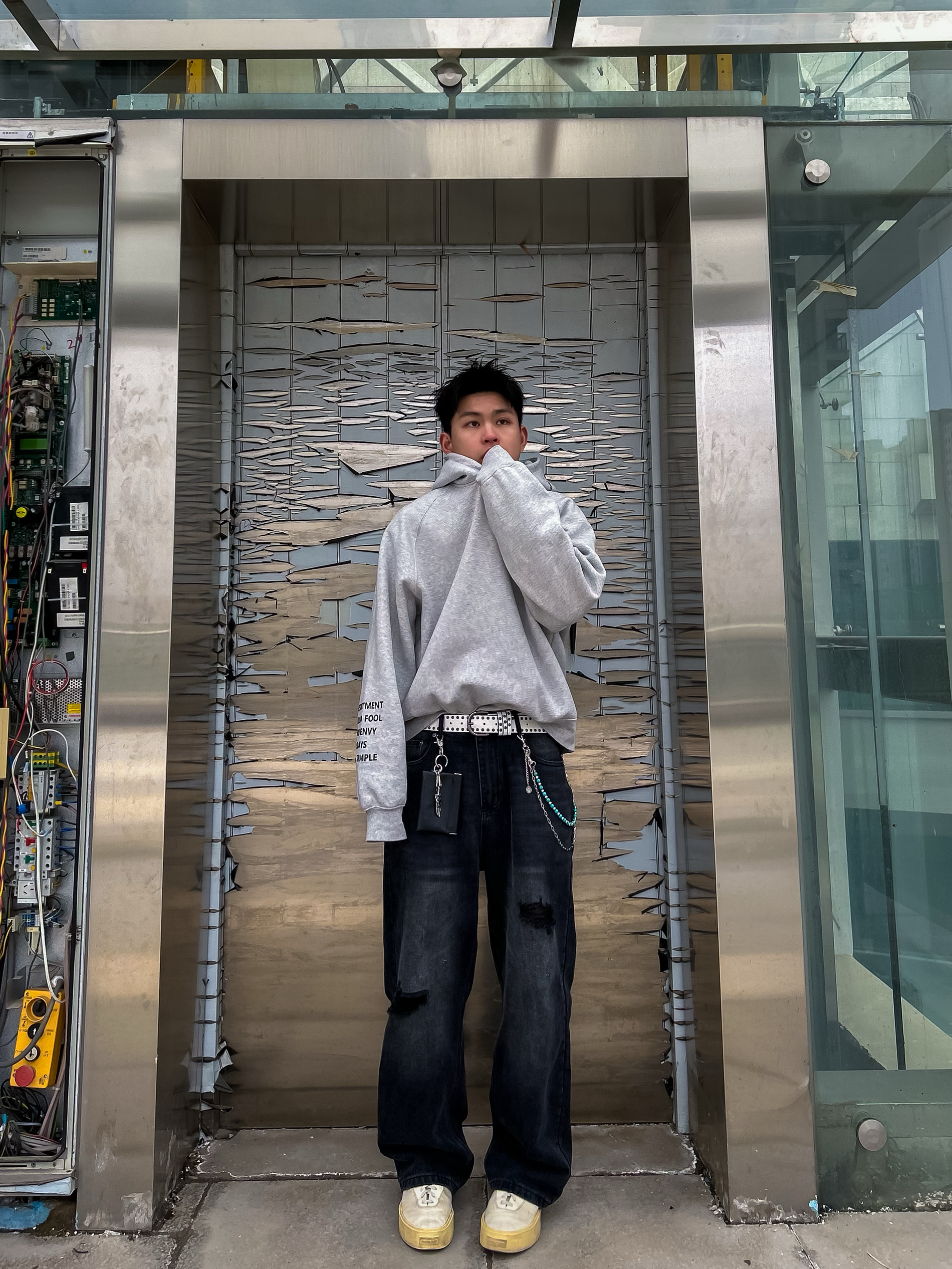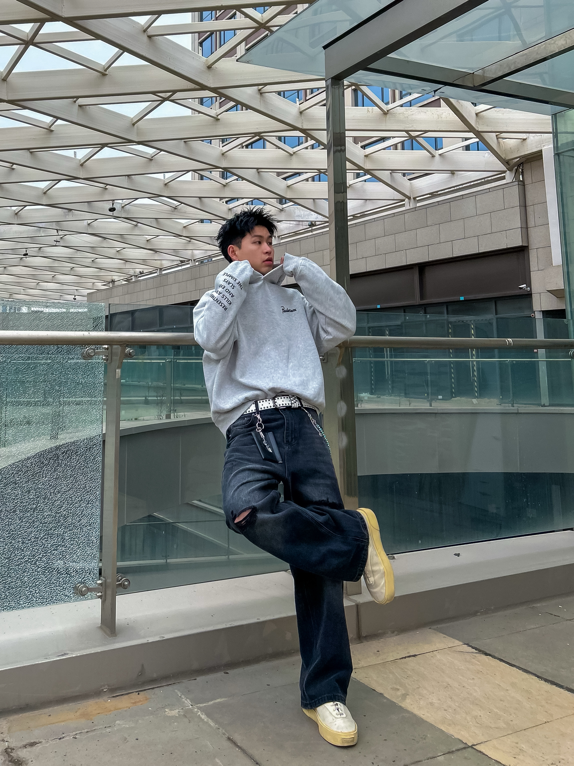 哈咯,这里是卢_SG✨ 浅灰连帽卫衣+做旧黑牛 把慵懒和酷感焊在身上了! 袖口的英文印花和腰间的链条配饰 瞬间让基础款变得有记忆点。 宽松版型对各种身材都很友好 上课、逛gai、约饭都能穿, 春天单穿或者叠穿外套都好看 随便搭一双厚底鞋就很出片~
