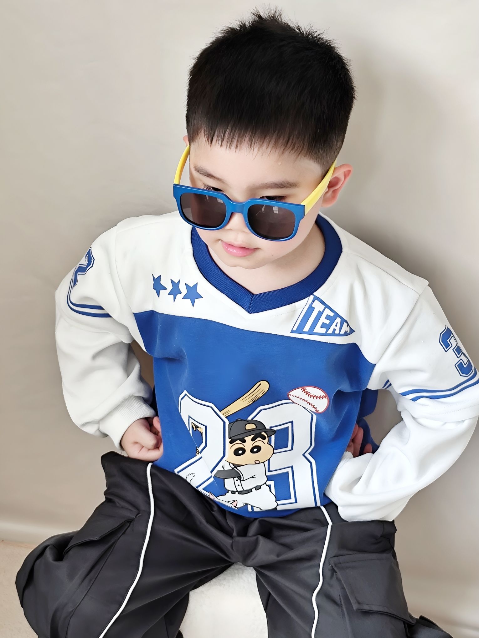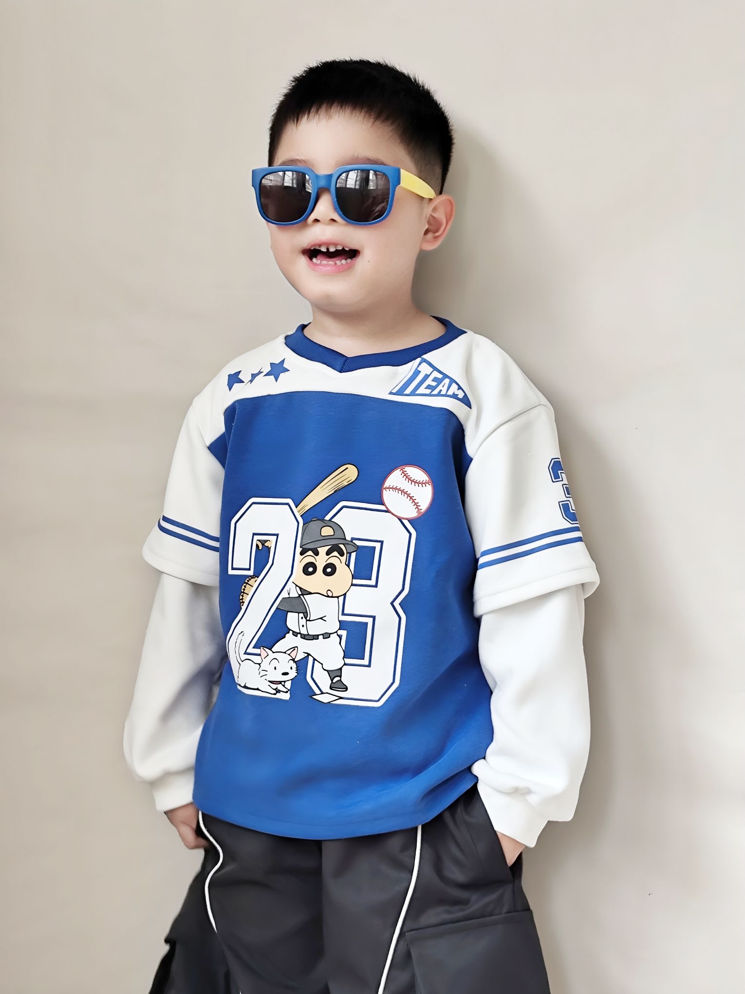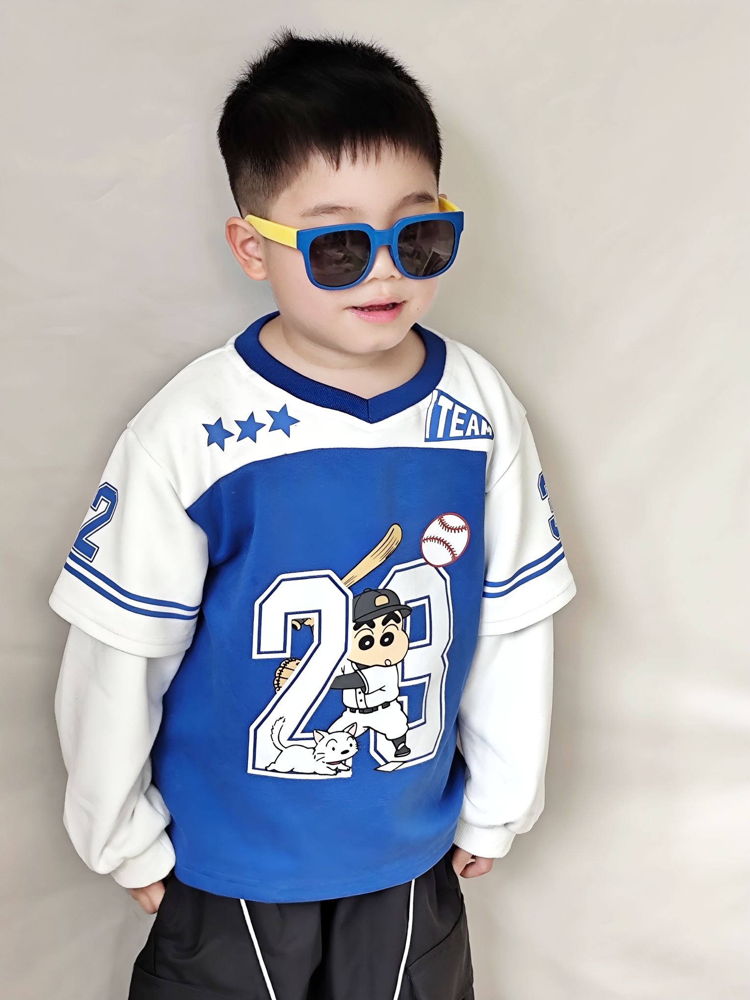 谁懂啊!给我家宸宝买的这套运动风穿搭,直接帅到我心坎里了😊 ✅ 上衣细节&穿着感受 这件蜡笔小新假两件棒球服真的挖到宝了! - 蓝白撞色巨显白,黄皮宝宝也能轻松驾驭,穿上直接白两个度 - 假两件设计太省心了,不用费心搭配,自带层次感,袖口的白边和条纹,氛围感直接拉满 - 面料是软软的棉感,不是那种硬邦邦的印花,宸宝穿了一下午,跑跳出汗也没闷汗,贴肤不扎,完全没有抗拒穿 - 上面的棒球小新印花超清晰...